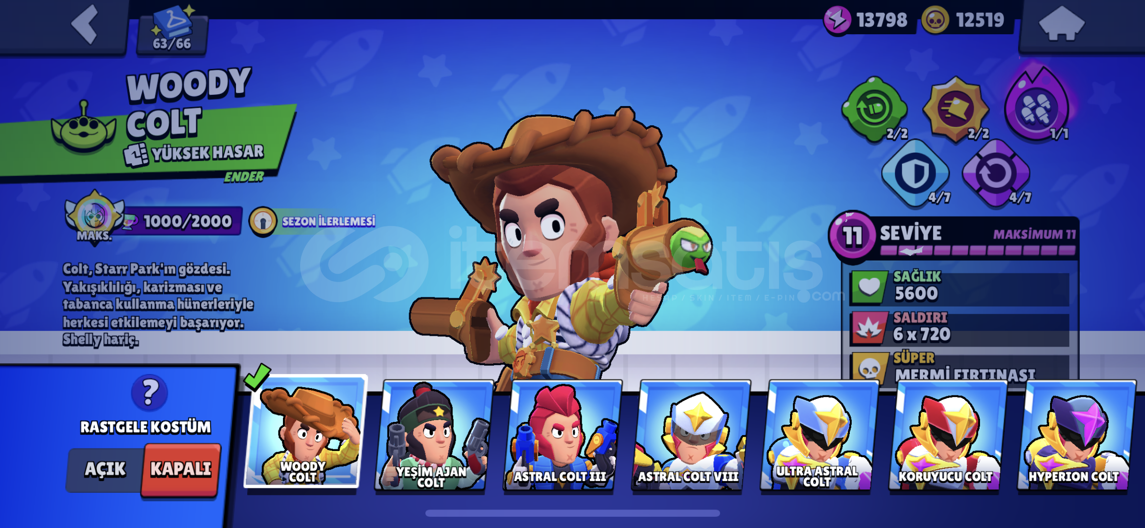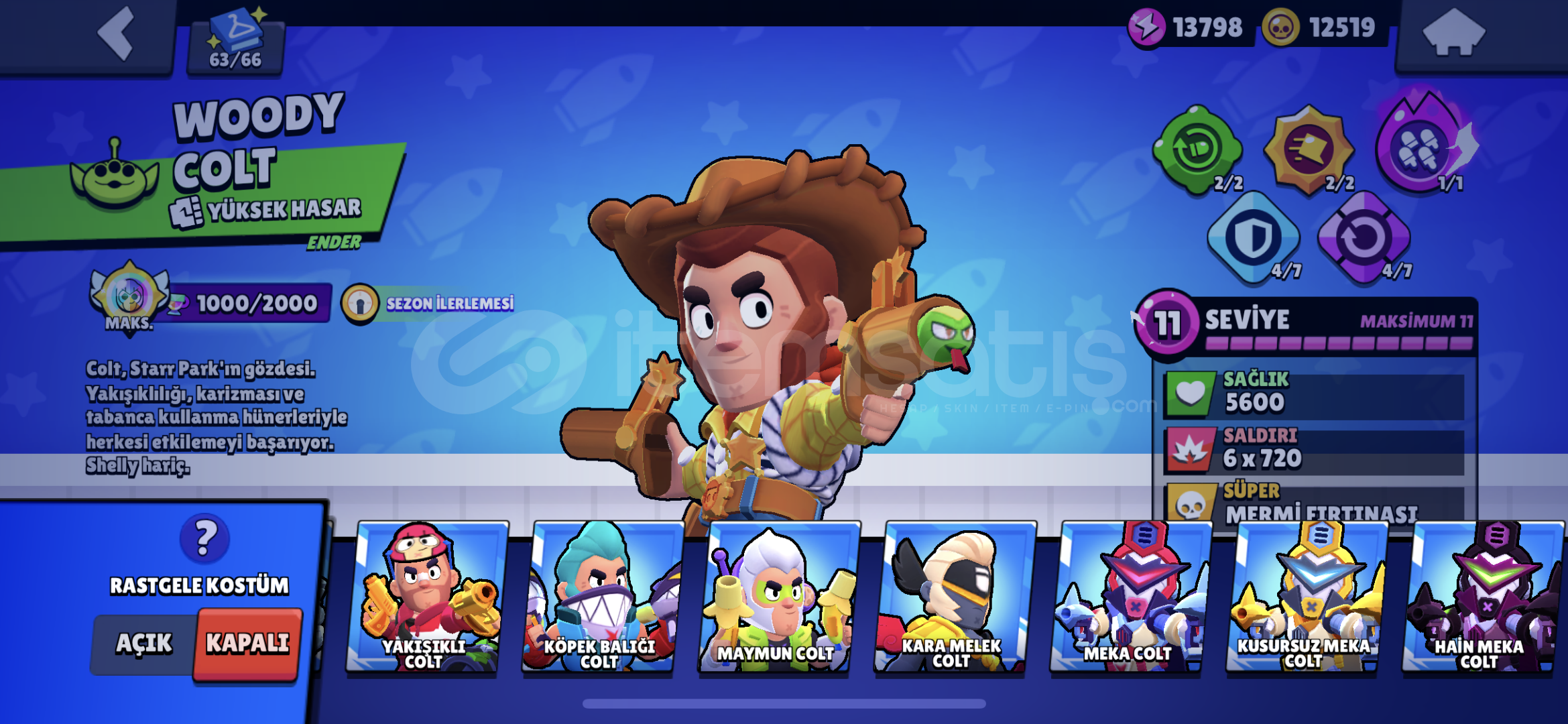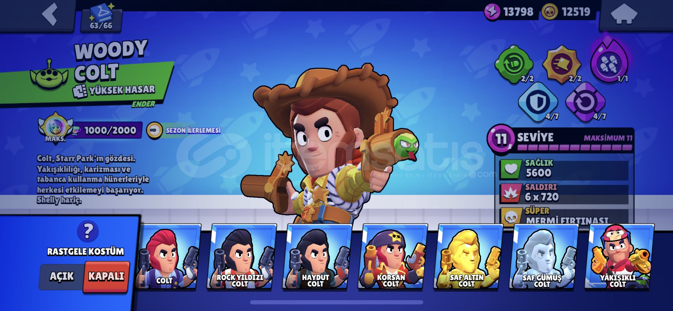 1 tane Pro ekli colt 1555 yapıldı2 gold skin biri colt 250+ kostüm master15+ ünvan güneş şöhreti brawl pass açık colt ve mike Pro pas açık