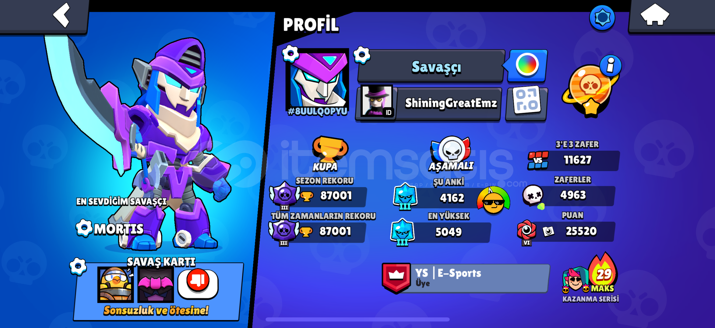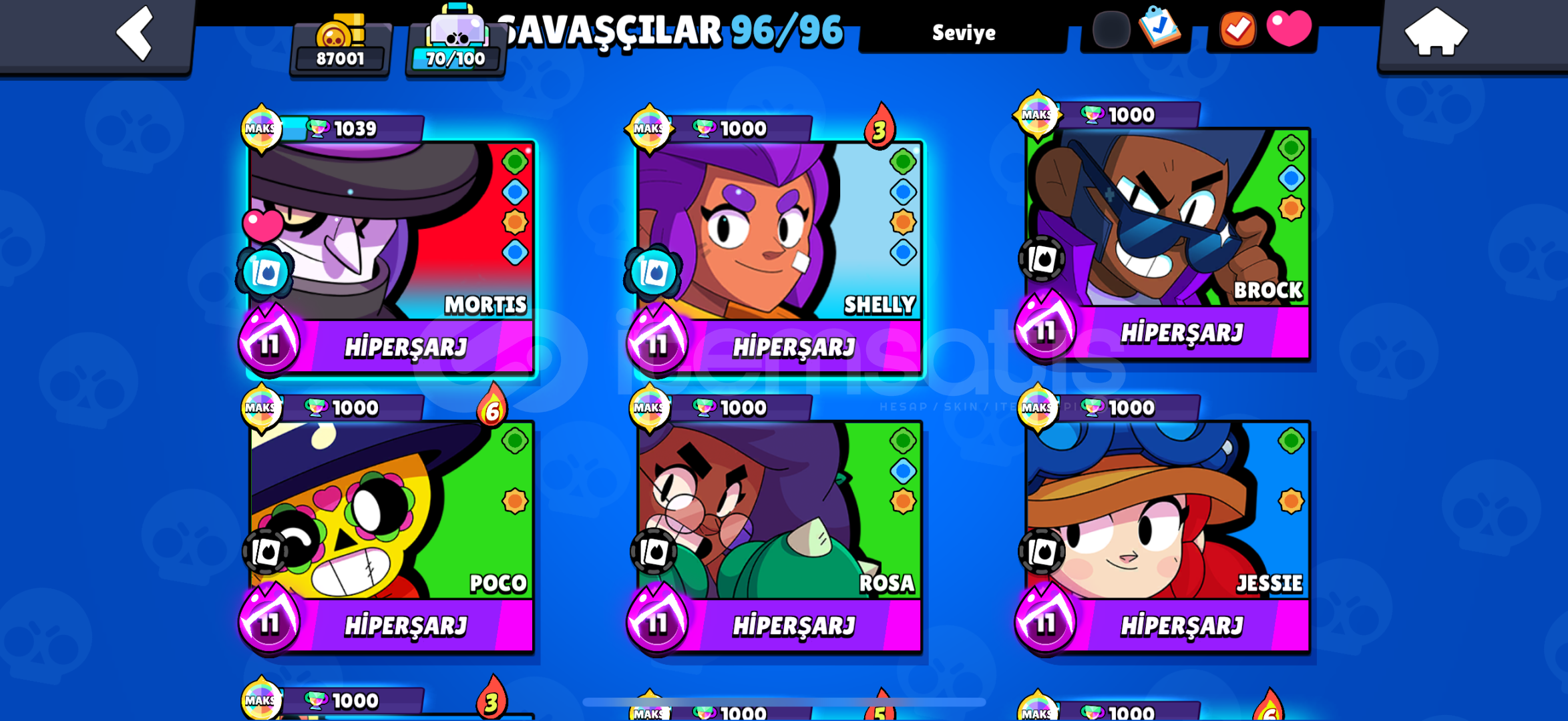 87k hesaptüm karakter açık ve hepsi max6yıllık hesabım aktif olarak kullanmaktayım44 brawl pas sezonundan 7-8tane...