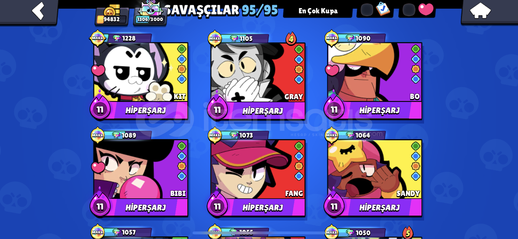 Hesapta tüm karakterler açık, eski bir hesap.Toplamda 344 Kostüm Var.64 Adet Hyper Charge'lı Karakter, Toplam 73 Maxlanm...