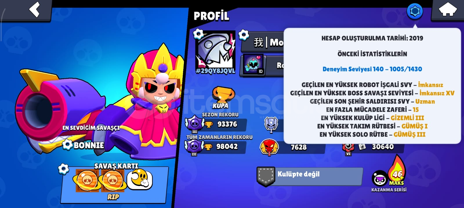 Hesap HakkındaKendi emeklerimle kastığım bir hesaptır. Hesabın ilk ve tek sahibi benim. Al-sat hesabı değildir. İlk sahibinden satılık.Hesap Oluşturma Tarihi: 2019Deneyim Seviyesi: 140Güncel Kupa: 93.376Şöhret Düzeyi: Satürn III - Günel Şöhretine ulaşmasına çok az kalmıştır Hesap Koruması: Hiç eklenmemiştir. İlk telefon numarası si...