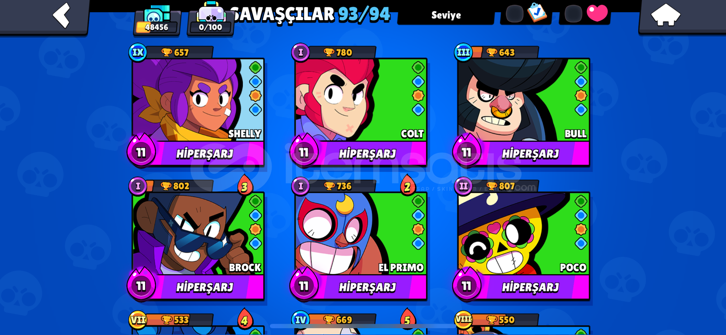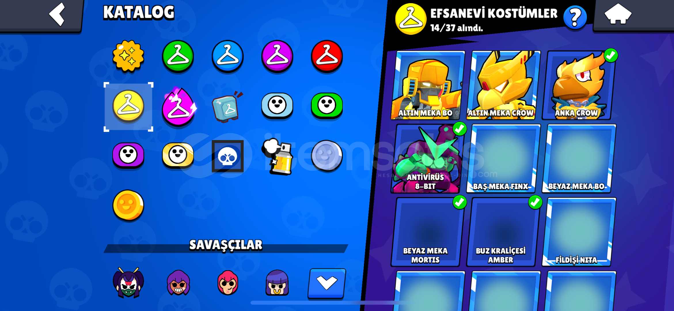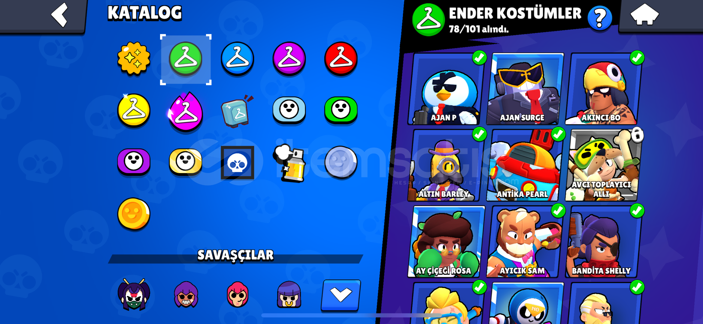 İsteyene detaylı bilgi verilir mail değiştirelecek.mars şöhreticadı-dansöz-yıldız shellykarson-meka-karamelek- coltminotor bullzeus-alevl-ranger-hacker-brockoyun kurucu elprimo harıc butun skınlernoel baba mike kardan adam tickantivürüs 8 bitbaşssız-noel baba stualtın el bella ışık taşıyıcısı edgargümüş ve mortis sahilde hariç bütün mortis s...