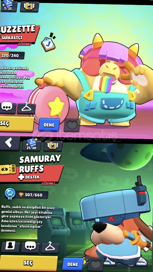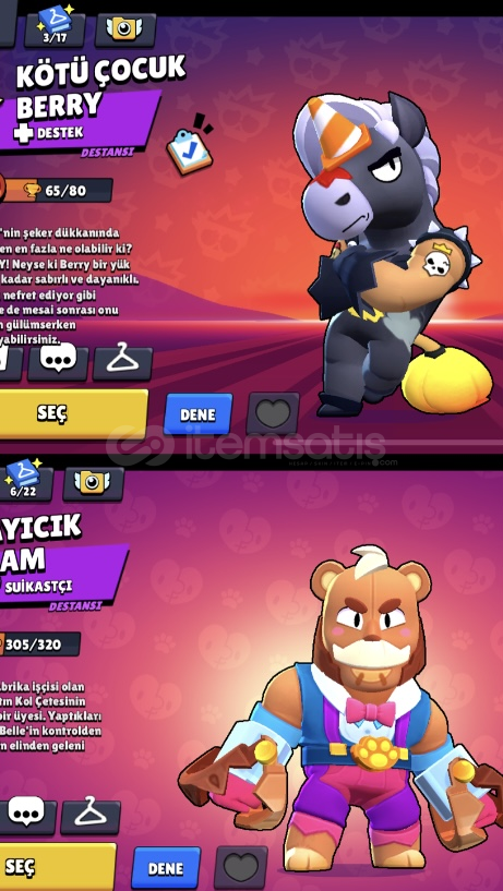 13 tane hiperşarjlı 10 tane max karakter vardır77 karakter vardır31.k kupa vardırhesapta bol skin vardır efsanevi hiperşarj skinleri vb.eski hesaptır mail değiştirilip verilir.acil satılık.ciddi alıcılara sorularını cevaplayabilirim.Acil satılık..indirim sünnettir.