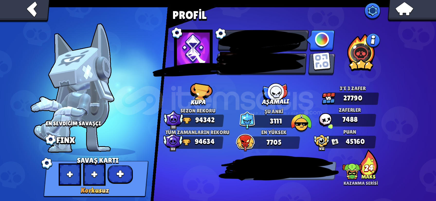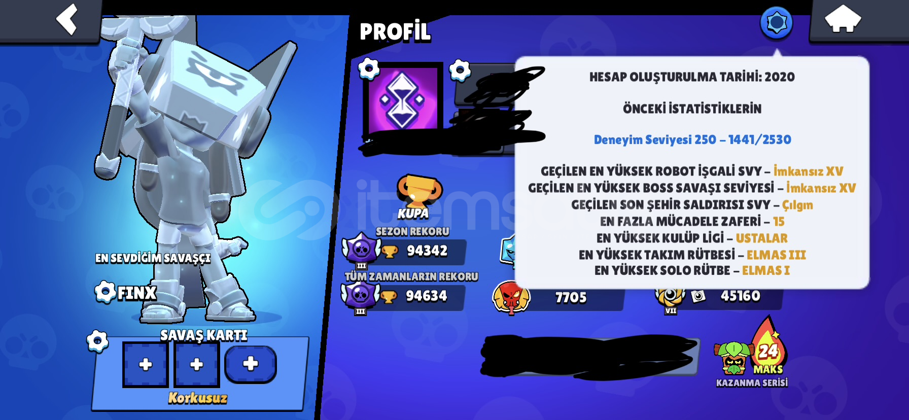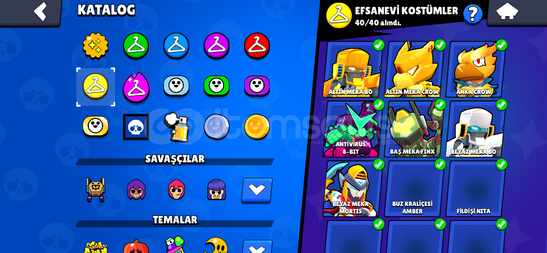 SİTENİN EN İYİ HESABI DIR95/95 KARAKTER ( TÜM SAVAŞÇILAR 11 Seviye )TÜM KARAKTERLER 1000 KUPA OLUP (95/94) TÜM HİPER ŞARZLAR AKSESUARLAR YILDIZ GÜÇLERİ YETENEKLER FULL DÜR ( AKSESUAR,YILDIZ GÜCÜ,YETENEKELR EKSİK OLABİLİR)Kostümler Full dür nadir kostümler hariç toplamda 635+ kostüm mevcutturEkstra olarak hesabın içinde 100000+ MÜCEHVER VARDIR Vede Me...