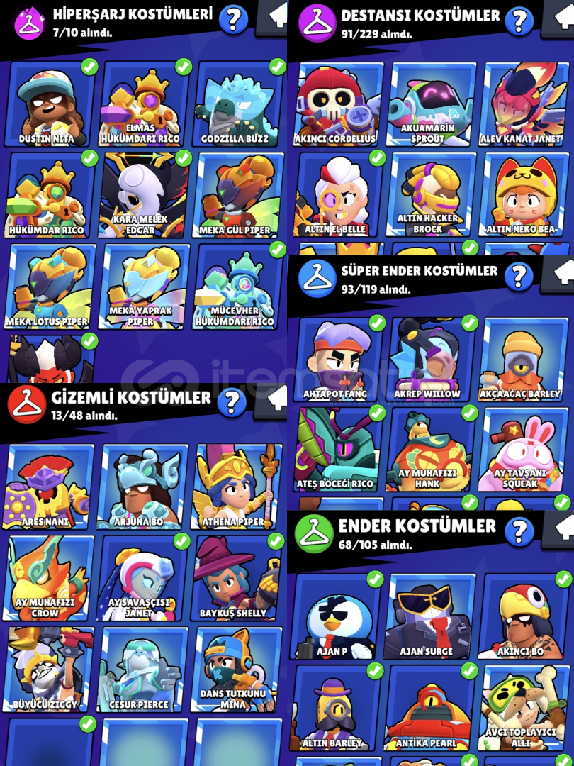 Hesapta 2019 yılında açılmıştır.Fotoğrafları detaylı inceleyiniz aklınızda soru işareti kalmasin herhangi bir soru sormak isterseniz yazın sık sık mesajları kontrol etmek için giriyorum Hesapta hesap korumasi yoktur sadece mail bağlı üzerinize yapacağım.277 Tane kostüm vardır.27 Tane aktif kullanilabilir hiperşarj vardır.22 Tane olupta seviye nedeniyle kullan...
