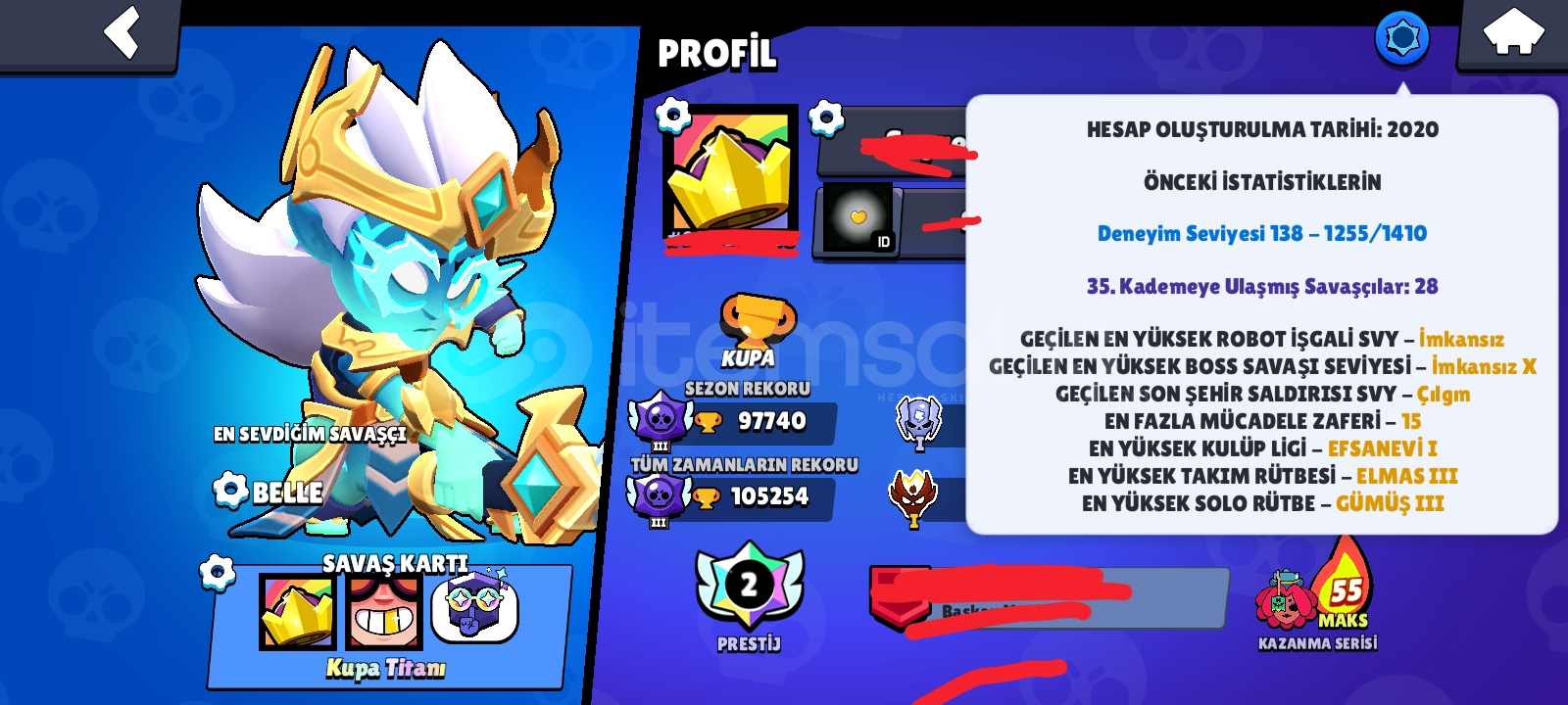 SİTENİN EN İYİ HESABI!Hesap videosu: https://youtu.be/XYhqYRUS7BI?si=HNXESBJdB-LaeDRk🔹 En Yüksek Kupa: 105100🔹 Güncel Kupa:105100🔹 3v3:11260🔹 Karakter Sayısı:97🔹 11 Seviye Sayısı:57🔹 Hiperşarj Sayısı 65🔹 Kaç 35 Rank:28🔹 Eski Sistem Pl Bilgisi: Takım elmas 3 solo gümüş 3🔹 2024 Master Sayısı: 1 🔹 2025 Master Sa...
