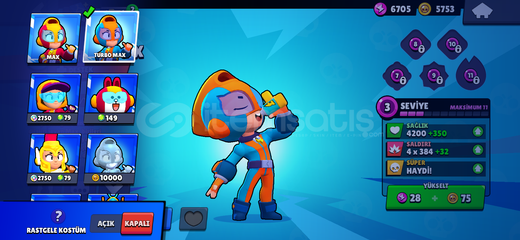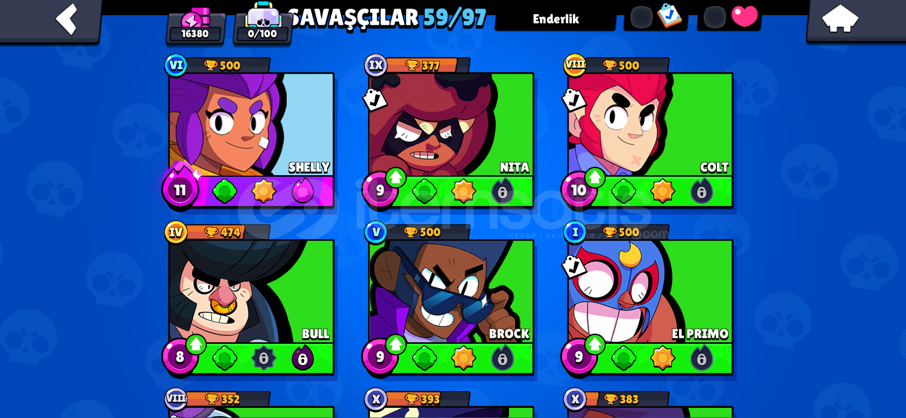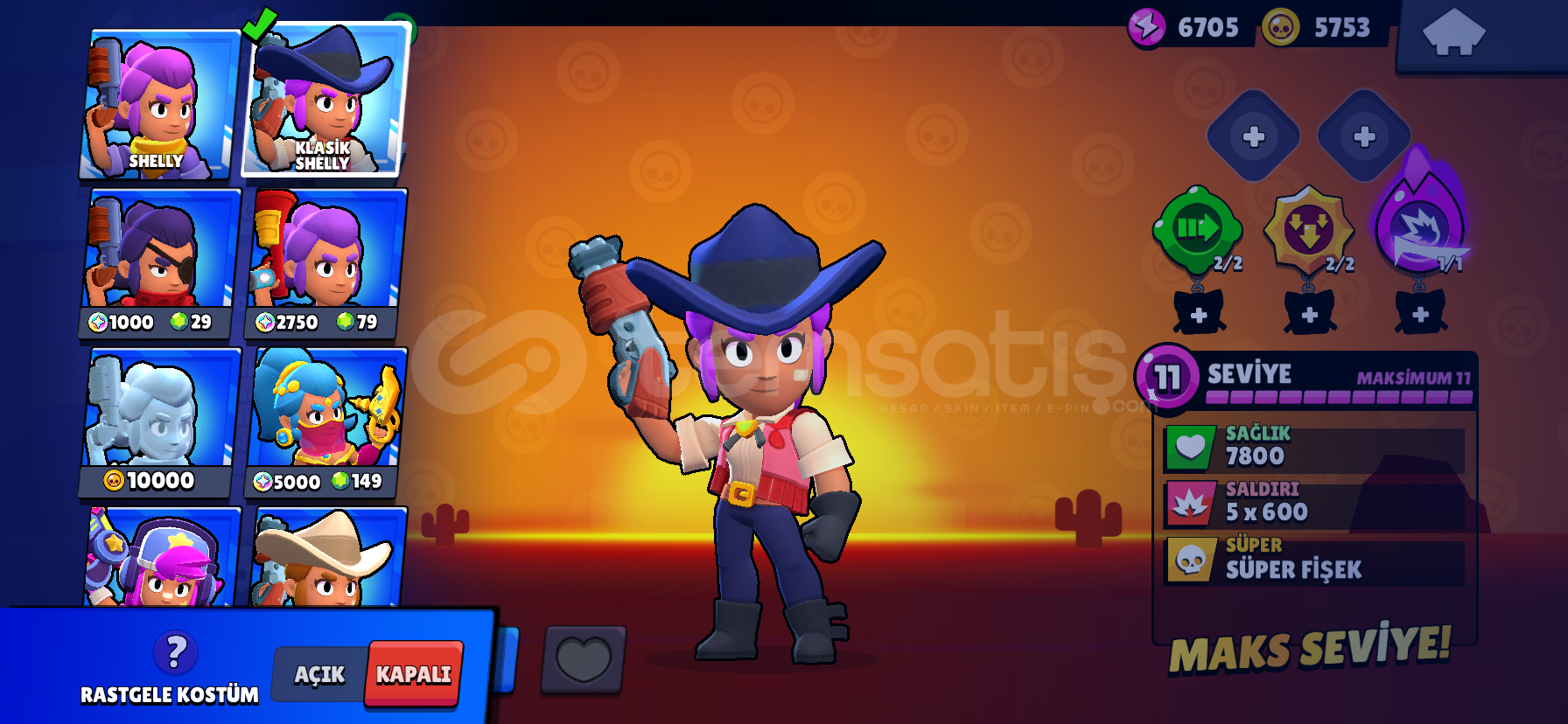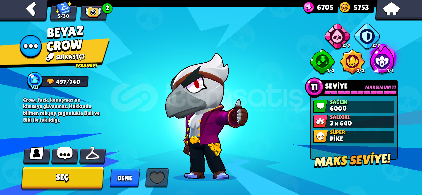 Hesap Özellikleri:* Kupa: 16.380+* Karakter Sayısı: 59 (Hesap oldukça doludur ve kasmaya müsaittir)* Efsanevi Karakterler: Beyaz Crow, Surge ve daha fazlası mevcuttur.* Kostümler: Rockabilly Mortis, Işıkyılı Surge, Klasik Shelly, Turbo Max gibi çok sevilen ve değerli kostümler açıktır.* Kaynaklar: Hesapta biriktirilmiş altın ve güç puanları bulunmaktadır, istediğiniz ka...