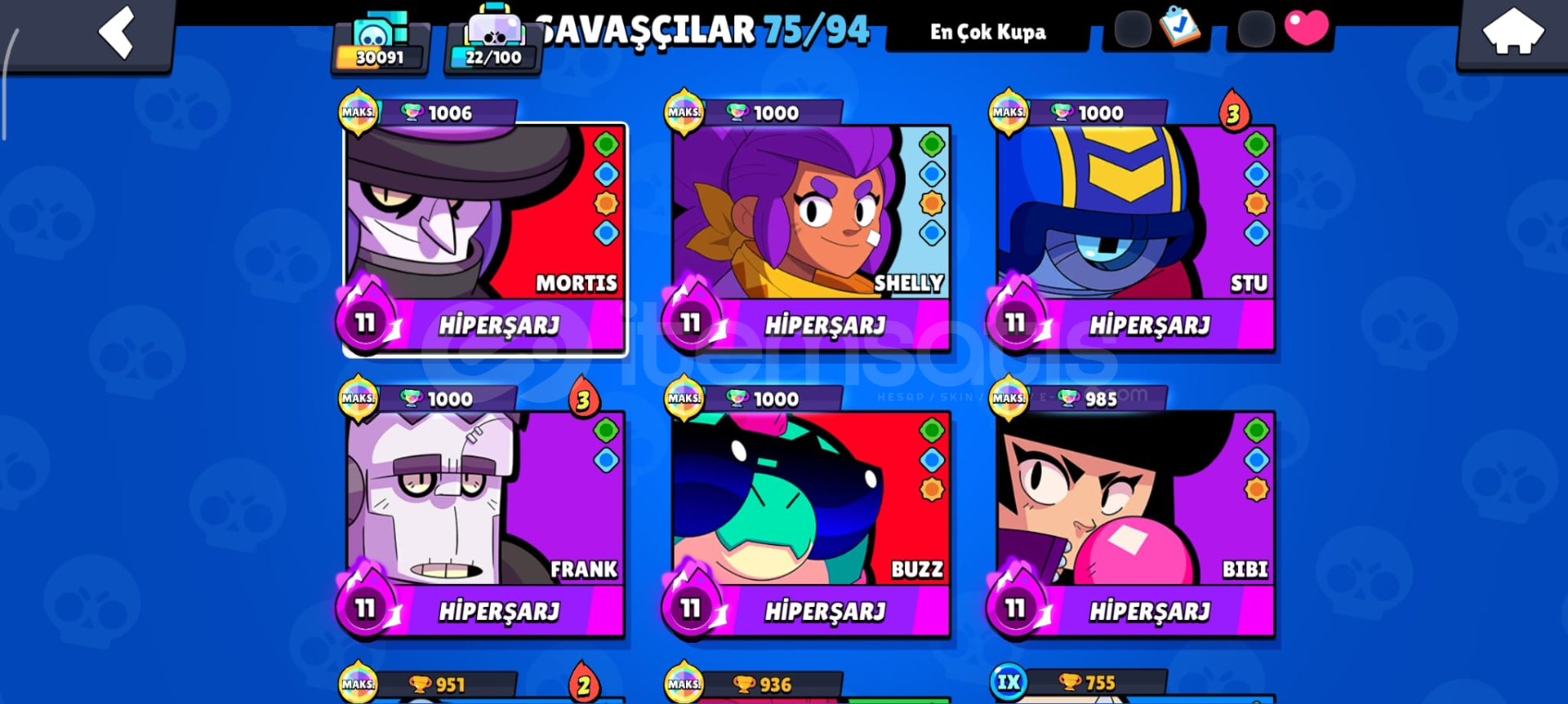 DOLU DOLU HESAP!!30 K kupa8 tane maks seviye karakter75 tane karakter39 adet hipersarj64 ender kostüm64 süper ender kostüm55 destans...