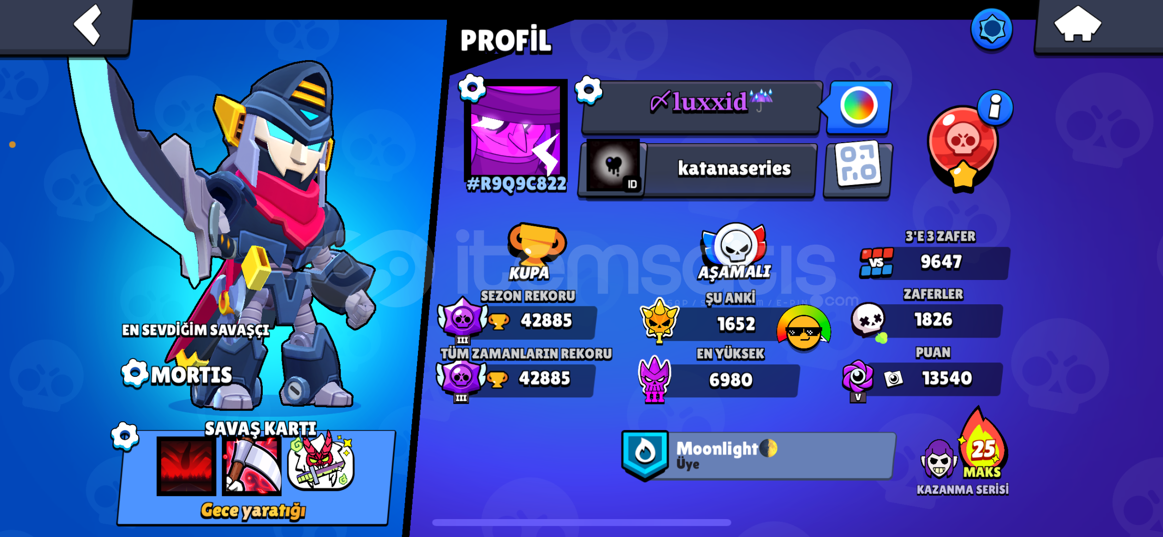 Mortis mainlilere daha çok giden Hesapda 346 elmas 20k+ mücevher vardır 83 ender 79 nadir 73 destansı 3 gizemli 6efsanevi ve 4 hiperşarjlı kostümü vardır gizemli şöhrete çıkmıştır , dolu ve kupa kasma hesabı arayanlara en iyisinden. #R9Q9C822 id sormak istediğiniz bişey varsa sorabilirsiniz.