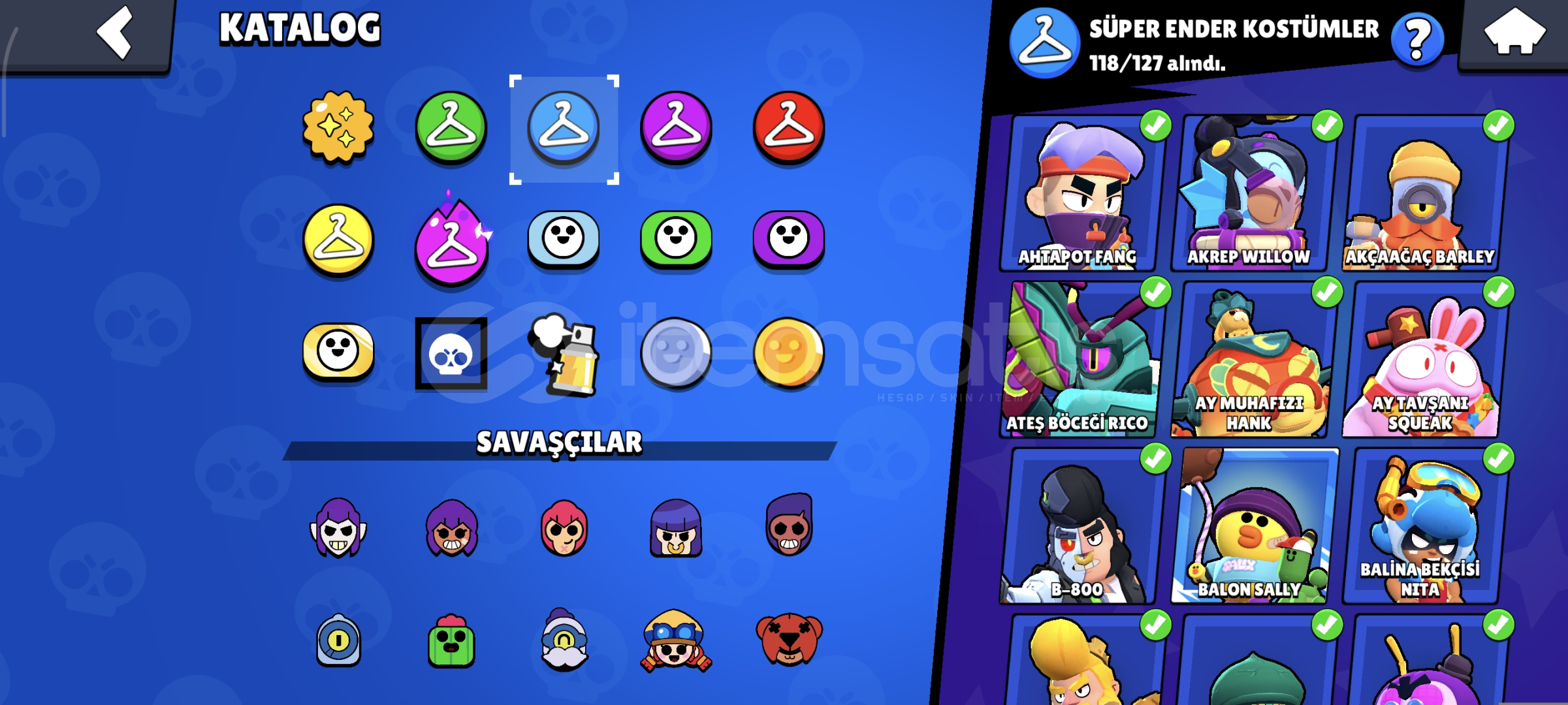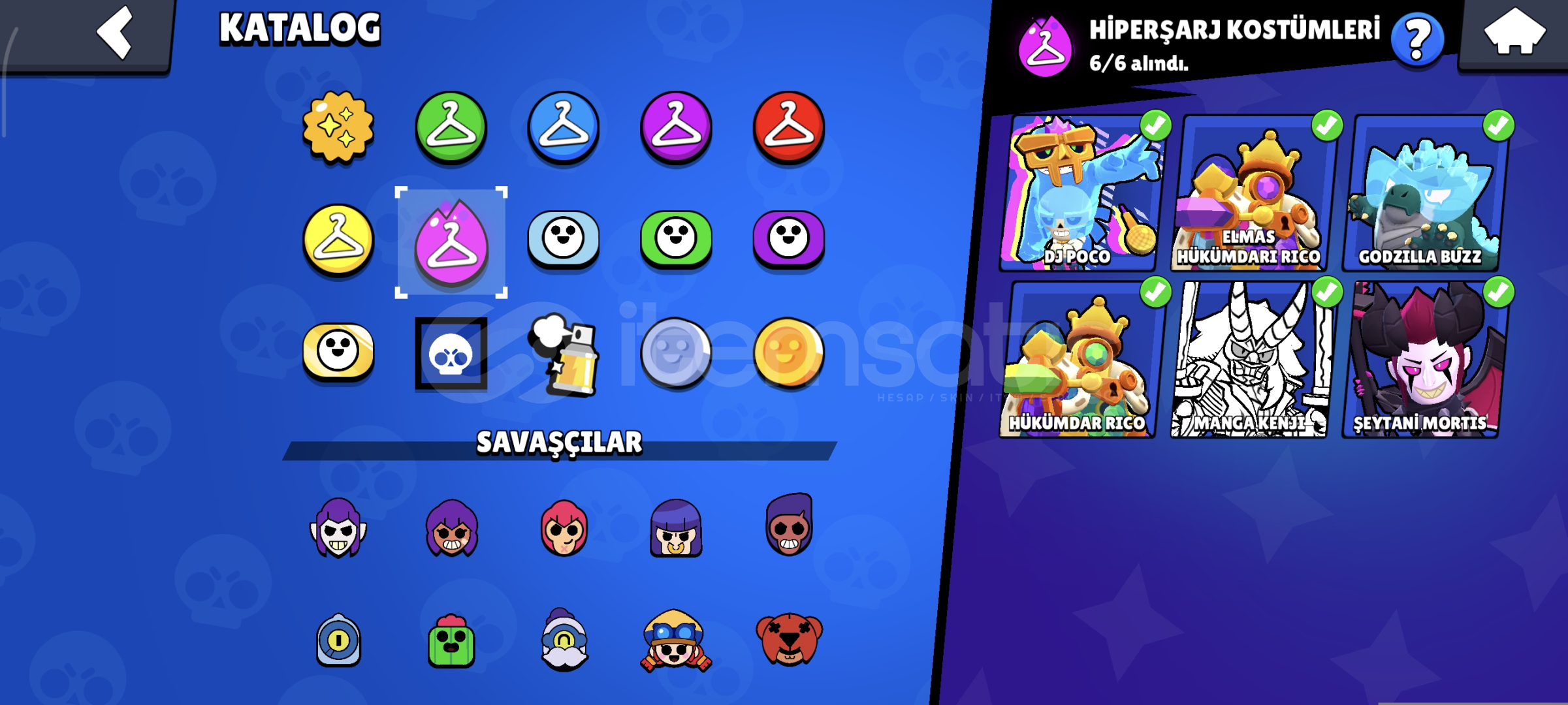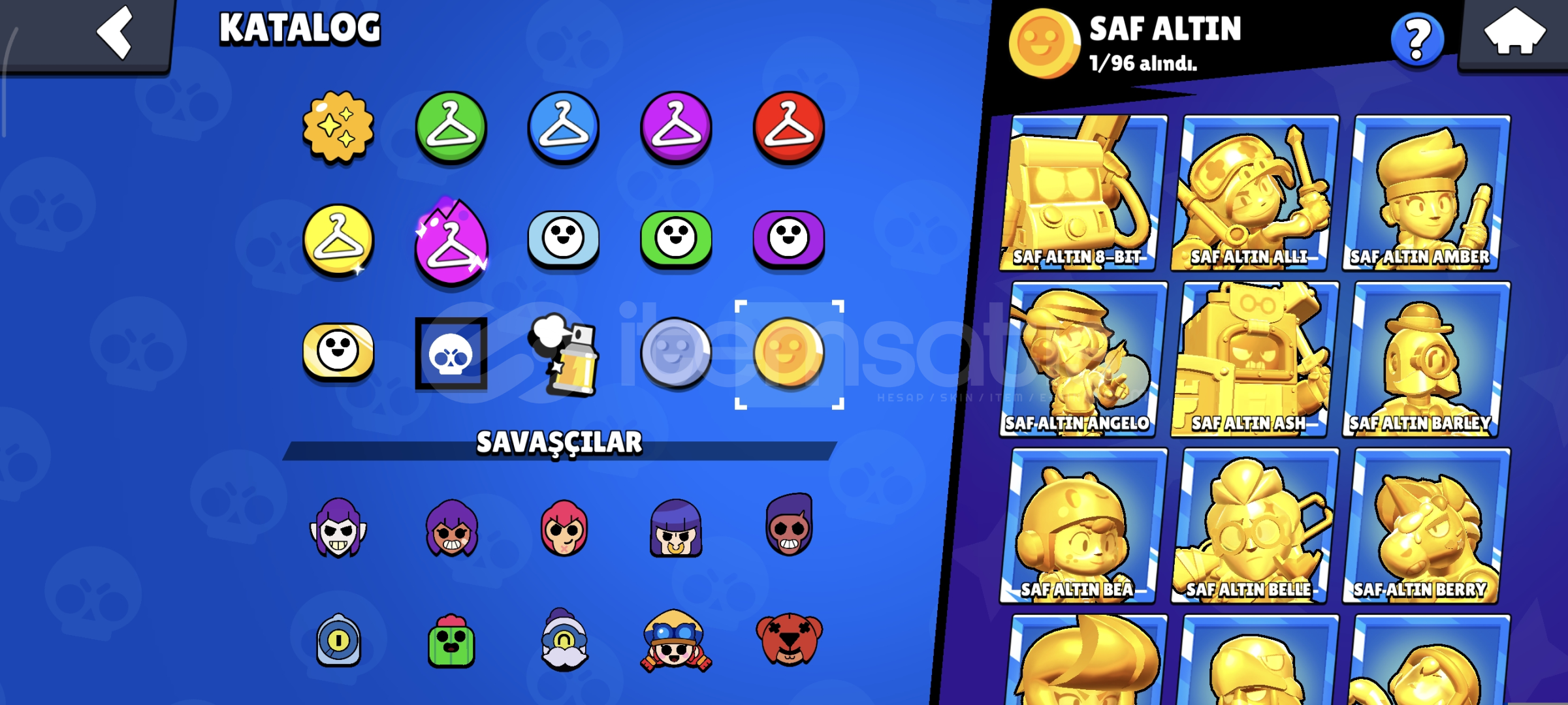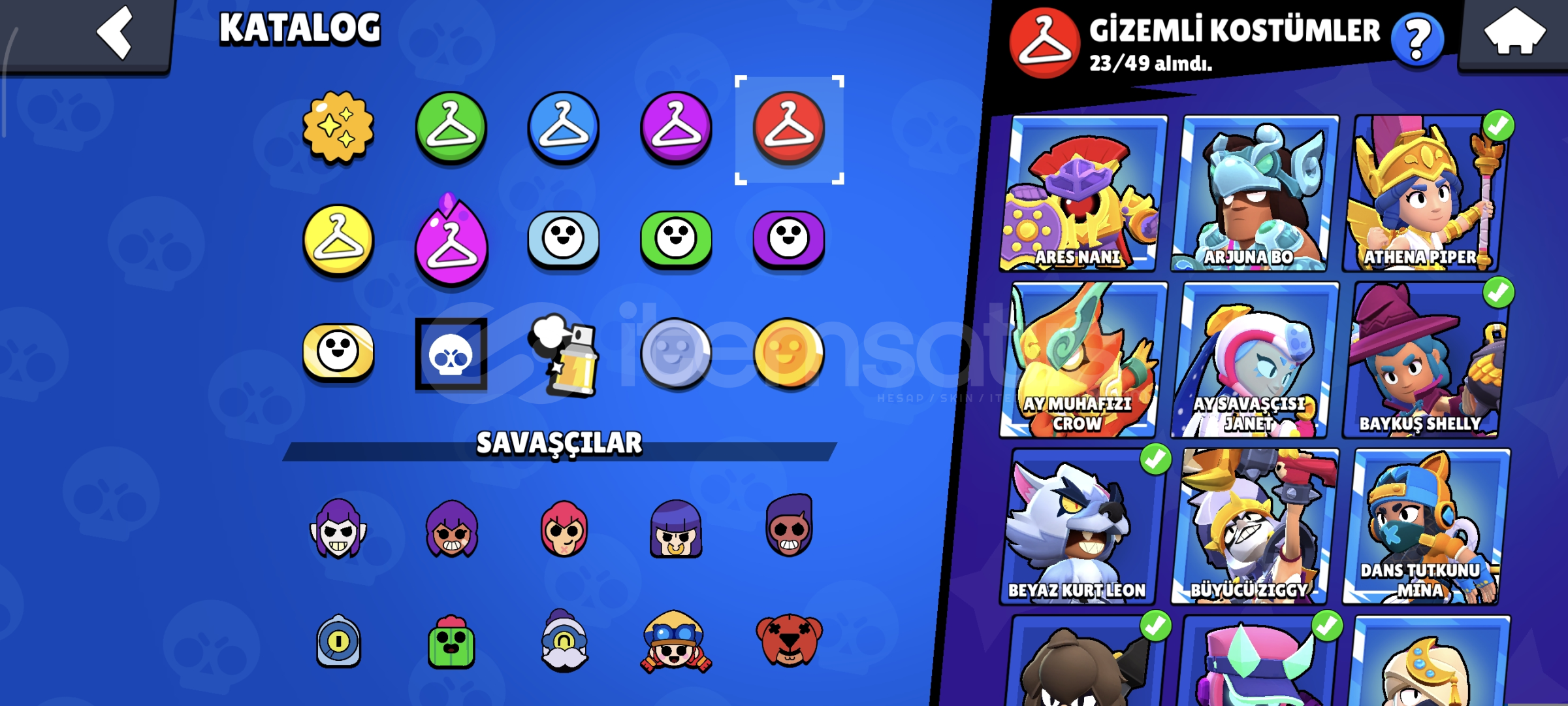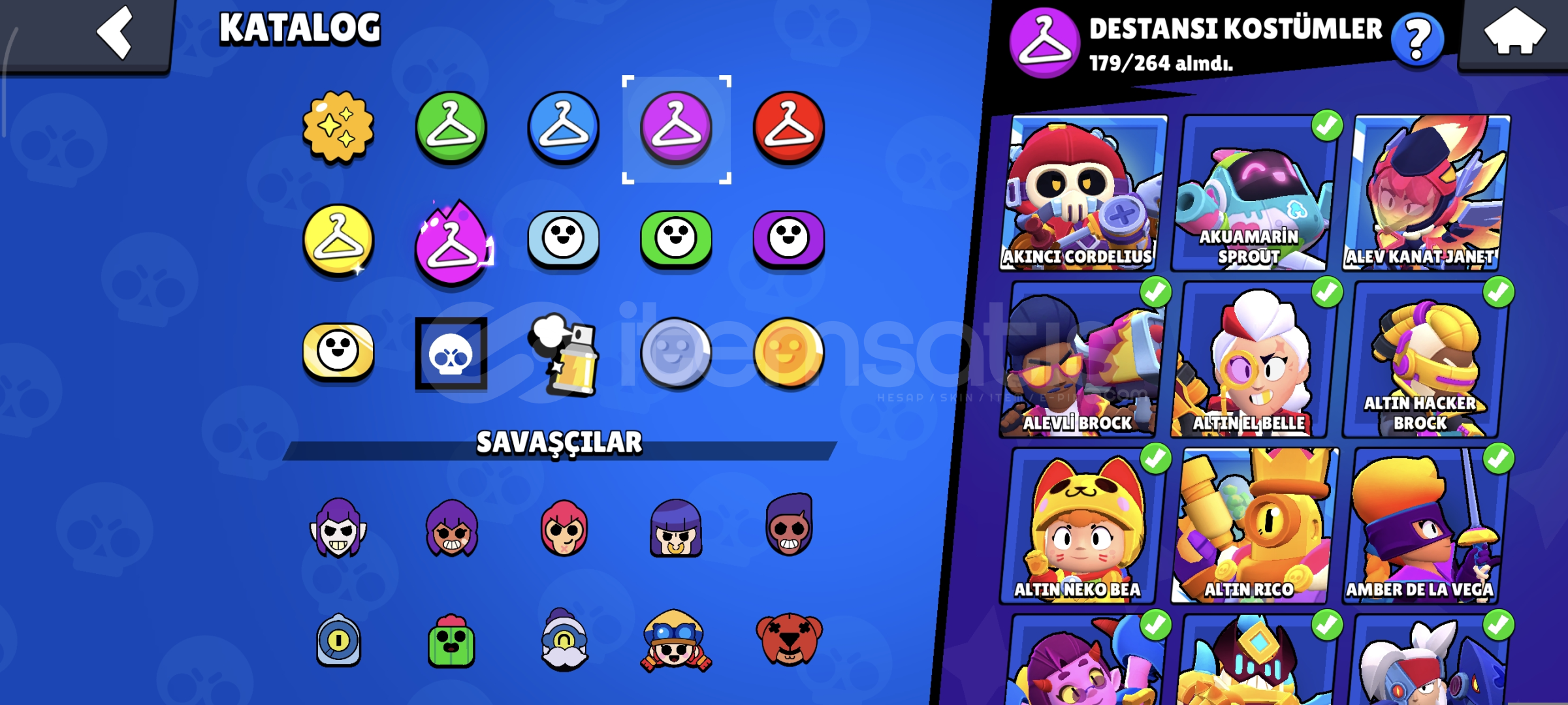 10 karakter harici hepsi 11 lvlEn yüksek kupa 1054442 li yeni masterGöktaşı şöhretiNADİR SKİNLERSokak ninjasi taraTiknaz darrlyBP SKİNİ BULLAsi LolaSilahşör coltAltin el belleKupa hırsızı jesieKötü buzzNinja ashSörfçü carlKaçakçı penyRetro brockMega kutu darlyPrenses shelyVE BOLCADA DONEMSEL SKİN VARHESAPTA 56 hipersarj var6 gümüş skin1 altin skin16 prestij...