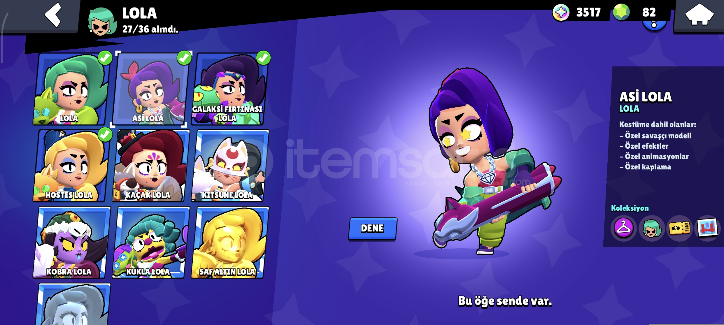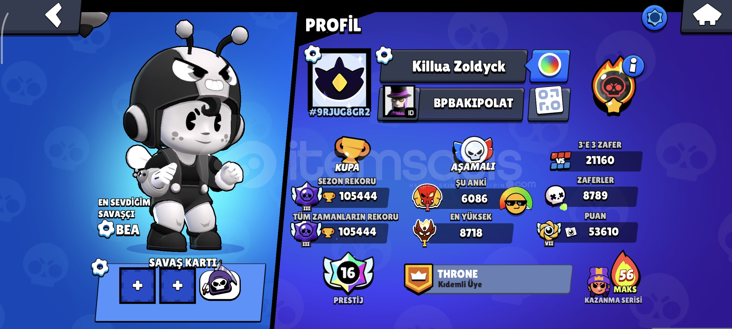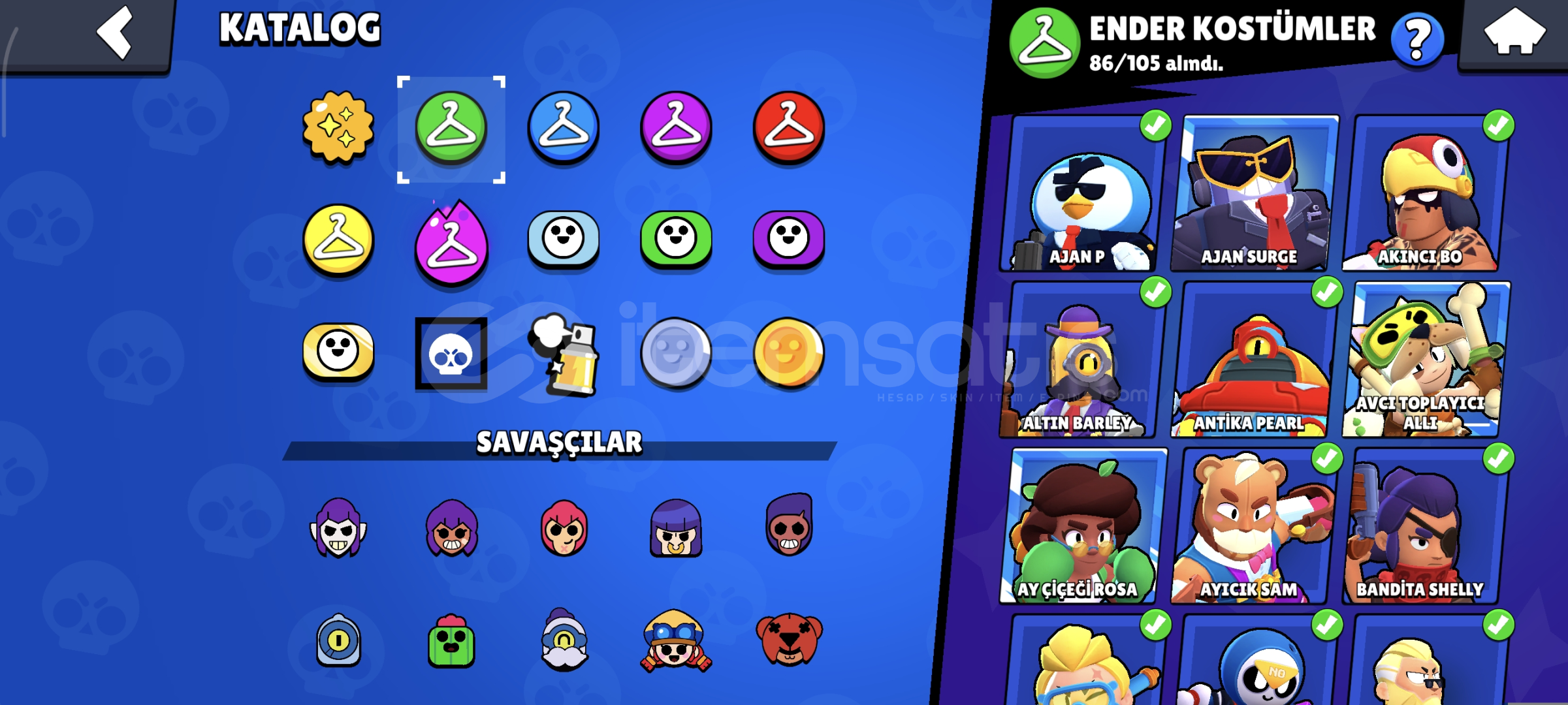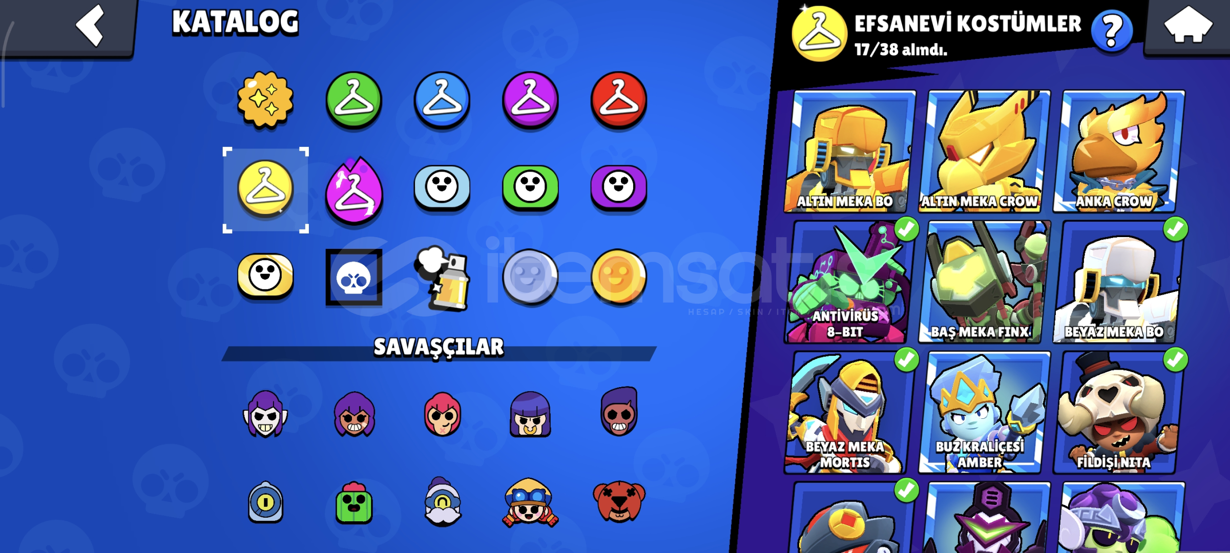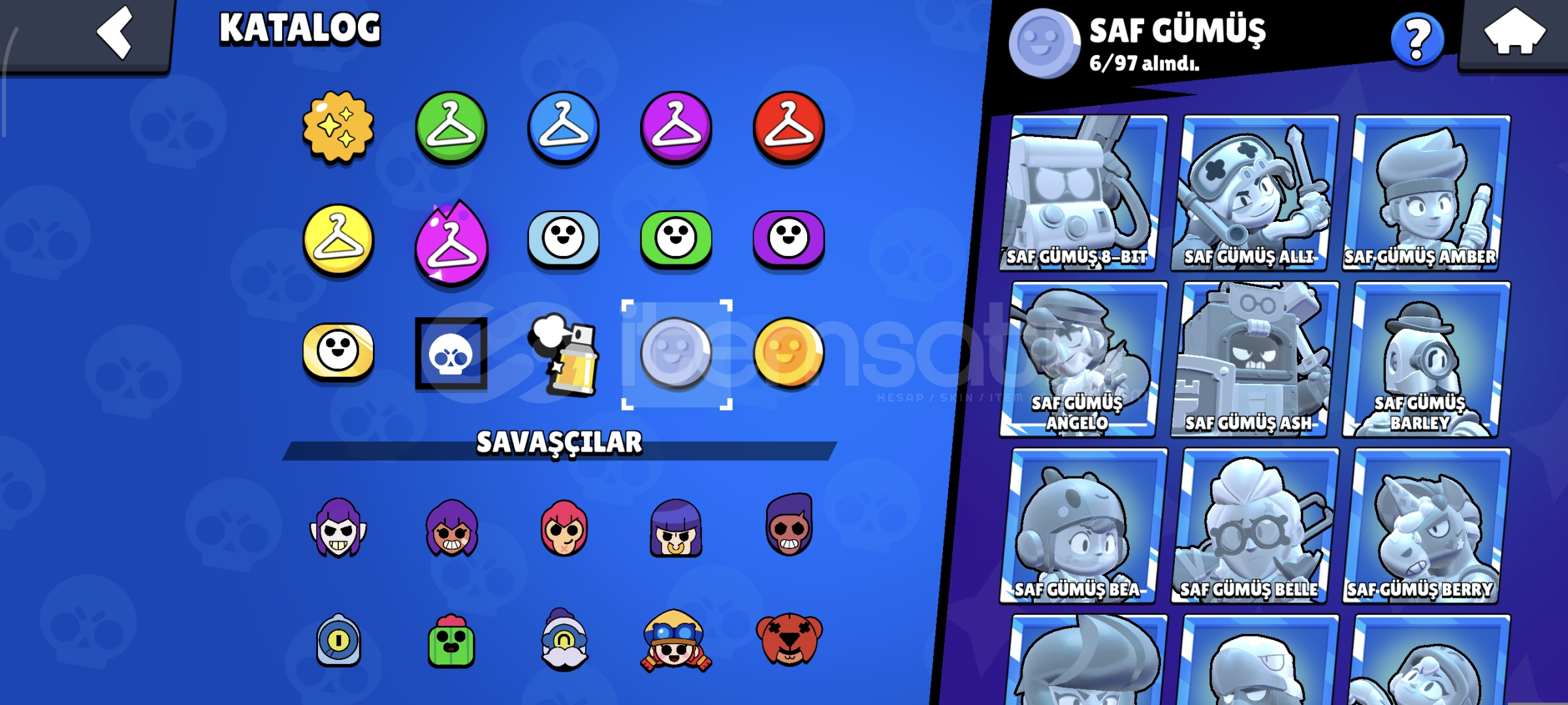 10 karakter harici hepsi 11 lvlEn yüksek kupa 1054442 li yeni masterGöktaşı şöhretiNADİR SKİNLERSokak ninjasi taraTiknaz darrlyBP SKİNİ BULLAsi LolaSilahşör coltAltin el belleKupa hırsızı jesieKötü buzzNinja ashSörfçü carlKaçakçı penyRetro brockMega kutu darlyPrenses shelyVE BOLCADA DONEMSEL SKİN VARHESAPTA 56 hipersarj var6 gümüş skin1 altin skin16 prestij...
