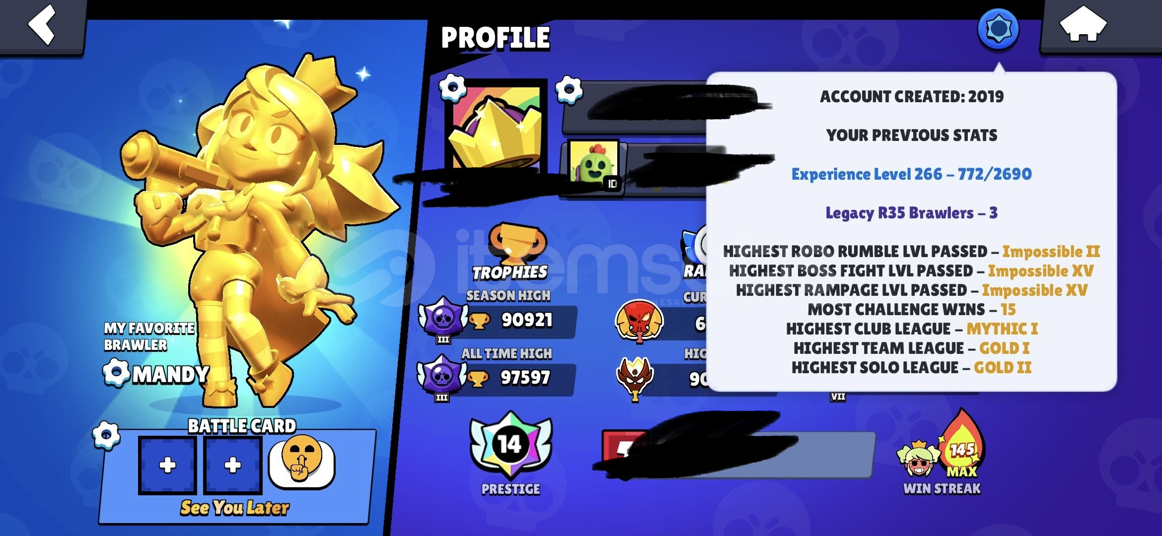 🔹 En Yüksek Kupa:97.597🔹 Güncel Kupa:90.921🔹 3v3:30.825🔹 Karakter Sayısı:96/96🔹 11 Seviye Sayısı:93/96🔹 Hiperşarj Sayısı:78/96🔹 Kaç 35 Rank:3🔹 Eski Sistem Pl Bilgisi :Gold 1 /Gold🔹Prestij Sayısı:14🔹 2024 Master Sayısı: 2🔹 2025 Legandary : Full🔹 2025 Master Sayısı:0🔹 Ünvan Sayısı (Bp\Ustalık):4...