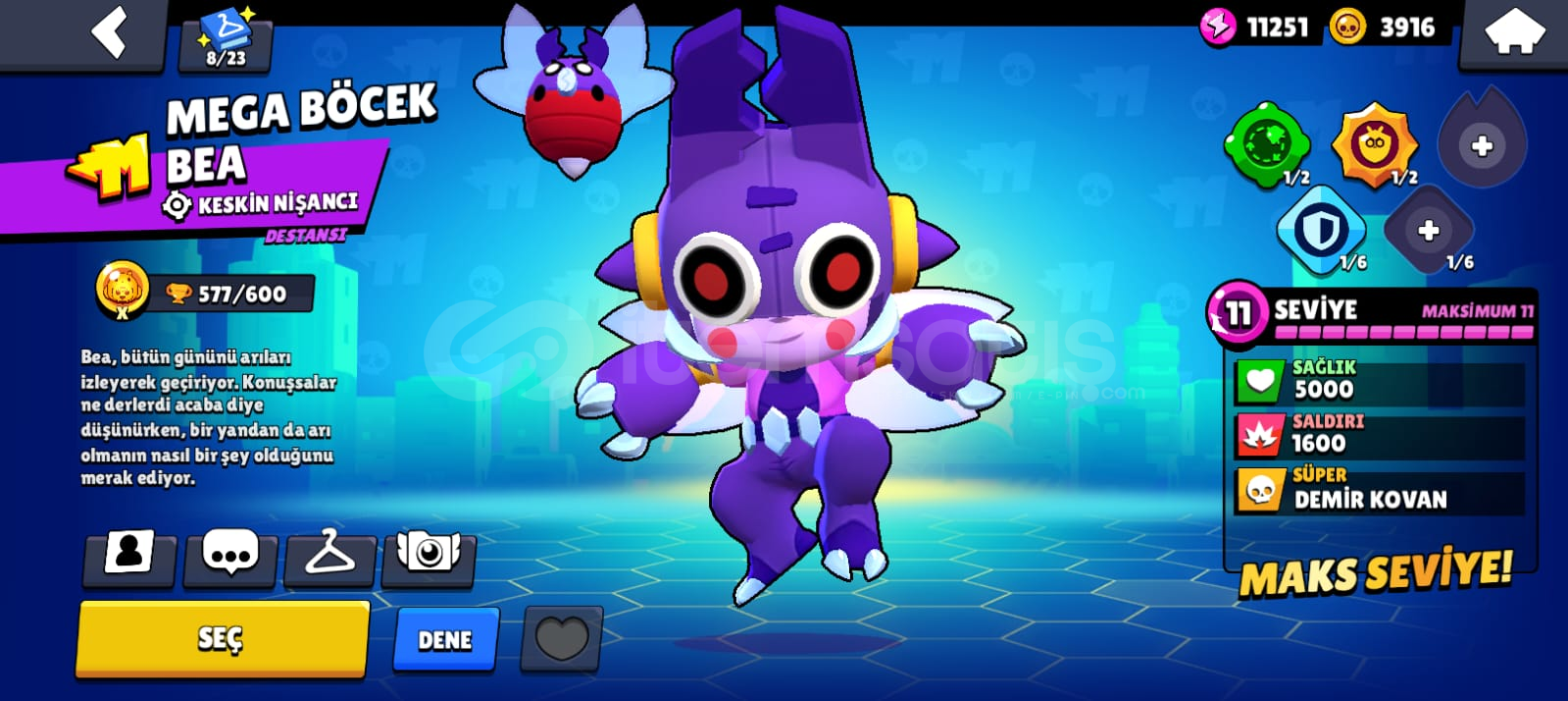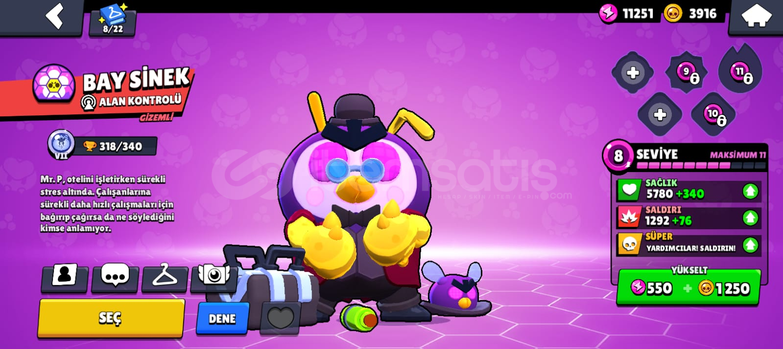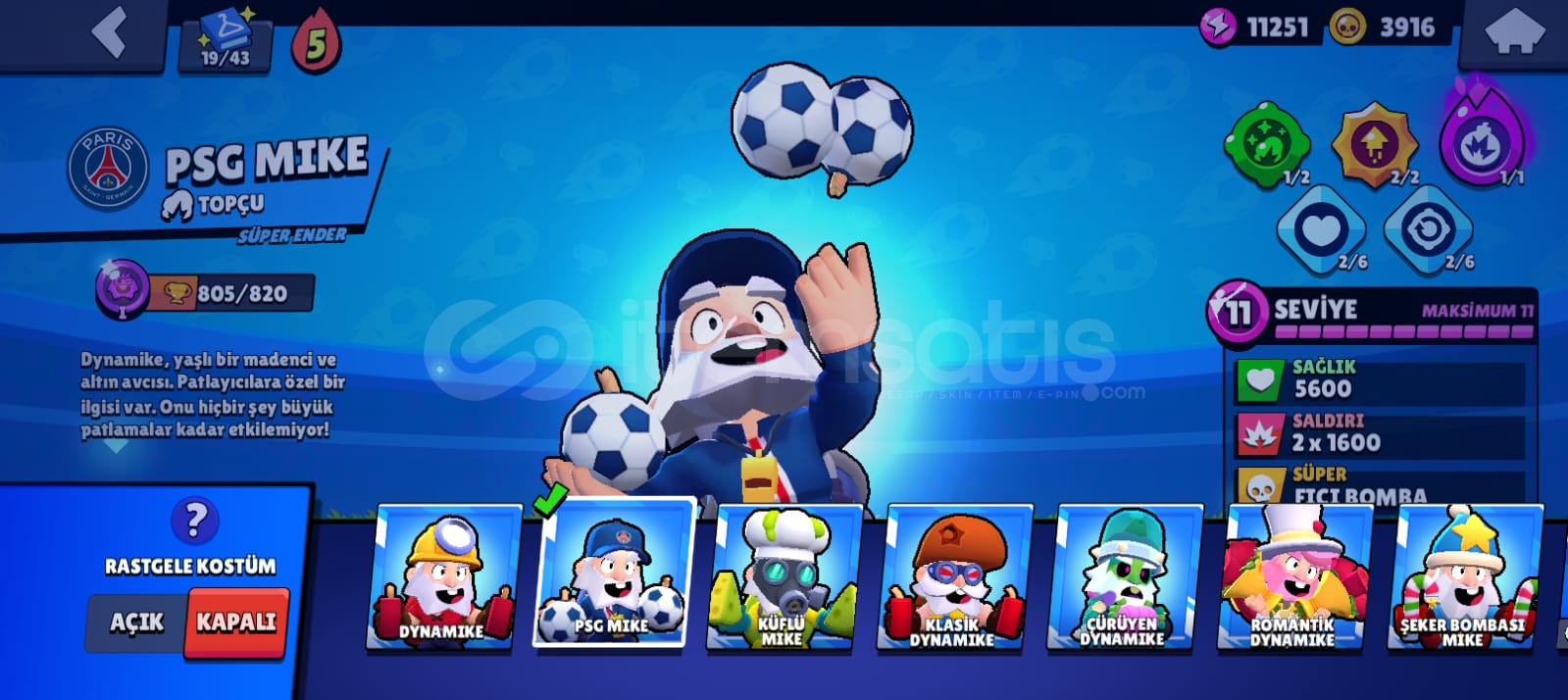 Brawl Stars 17000 kupa 48 karakterli hesap hesaptaki diğer kostümler Prenses Shelly Psg Shelly Köpek Balığı Colt Yarışçı Carl Mega Böcek Bea Pilot Colette Mareşal Ruffs Dinozor Leon Surge Kong
