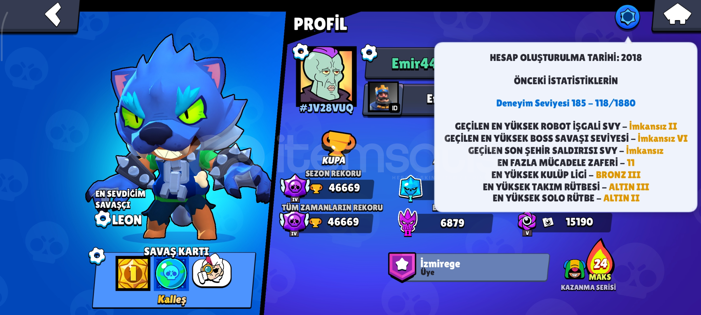 2018 hesabıdır clash royale ve clash of clans hesabıda dahildir clash royale de güzel hesapBrawl da geri erişimi olmayan 4-5 adet kostüm ve 15.000 mücevher hediye bulunmaktadır surge ve belle sezonu brawl pass açılmıştır nadir hesaptır