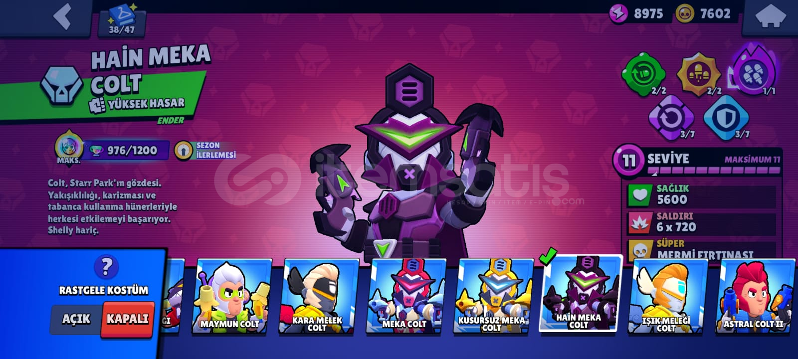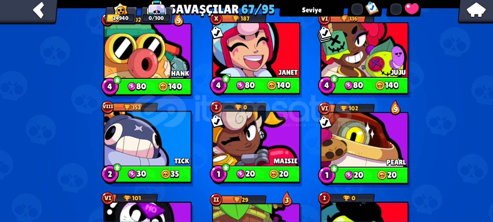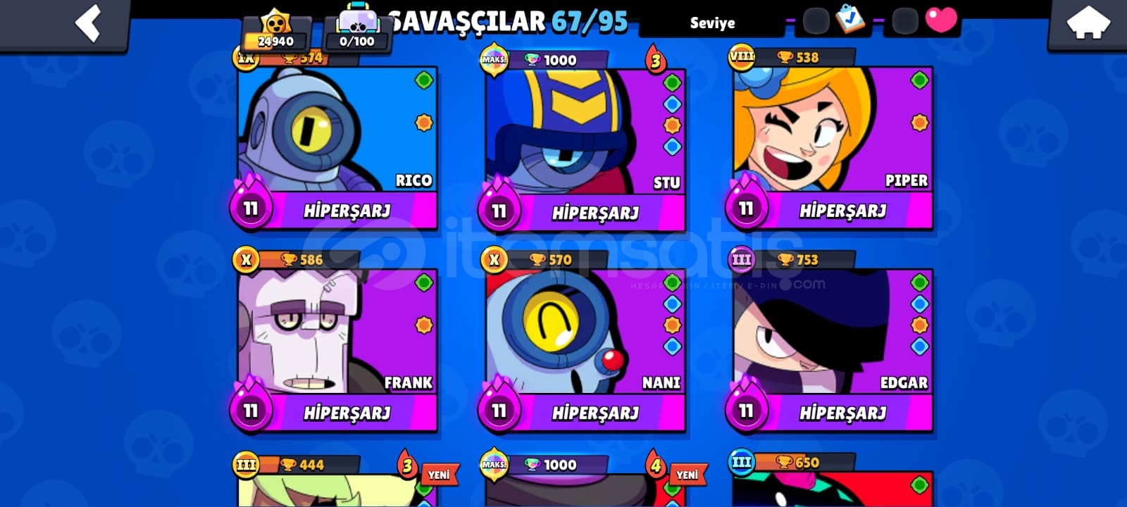 Hesap 25.000 yakın kupası olup 18 hiperşarjı olup Colt karakterinin gümüş skini hariç bütün skinleri mevcuttur.4 tane Hiperşarj kostumu vardır.Hesap karakter sayısı az ama hesap şans konusunda birliktedir.Görseller Max 10 olduğundan bazı görüntüler yoktur.Şüphesi olanlar alıcılar dm ile çözülebilir.