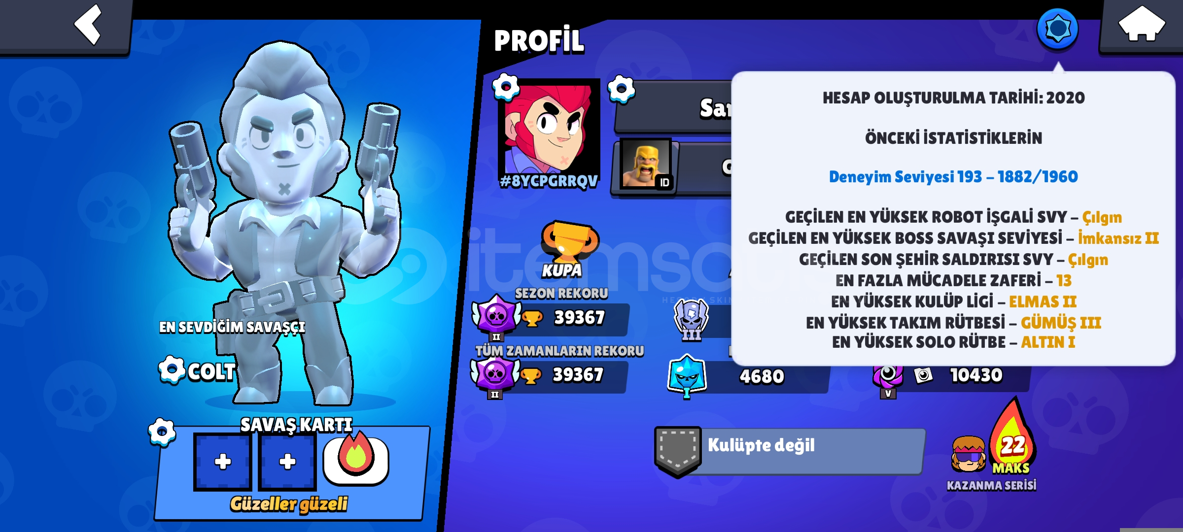 2020’den beri aktif kullanılan OG Brawl Stars hesap.Toplam 39.000 kupa, full karakter (1 tane kapalı karakter dışında hepsi mevcut).Hesapta bir sürü skin var, çoğu sezonluk/og/rare.Ranklar güzel, hesap temiz, ban riski yok.Supercell ID + bağlanan numara birlikte verilecek, hesabın tamamen sana geçmesi için her şey hazır.Hesap çalıntı değil, tertemiz.Fiyat uygun: 700al sat yapanlar ya...