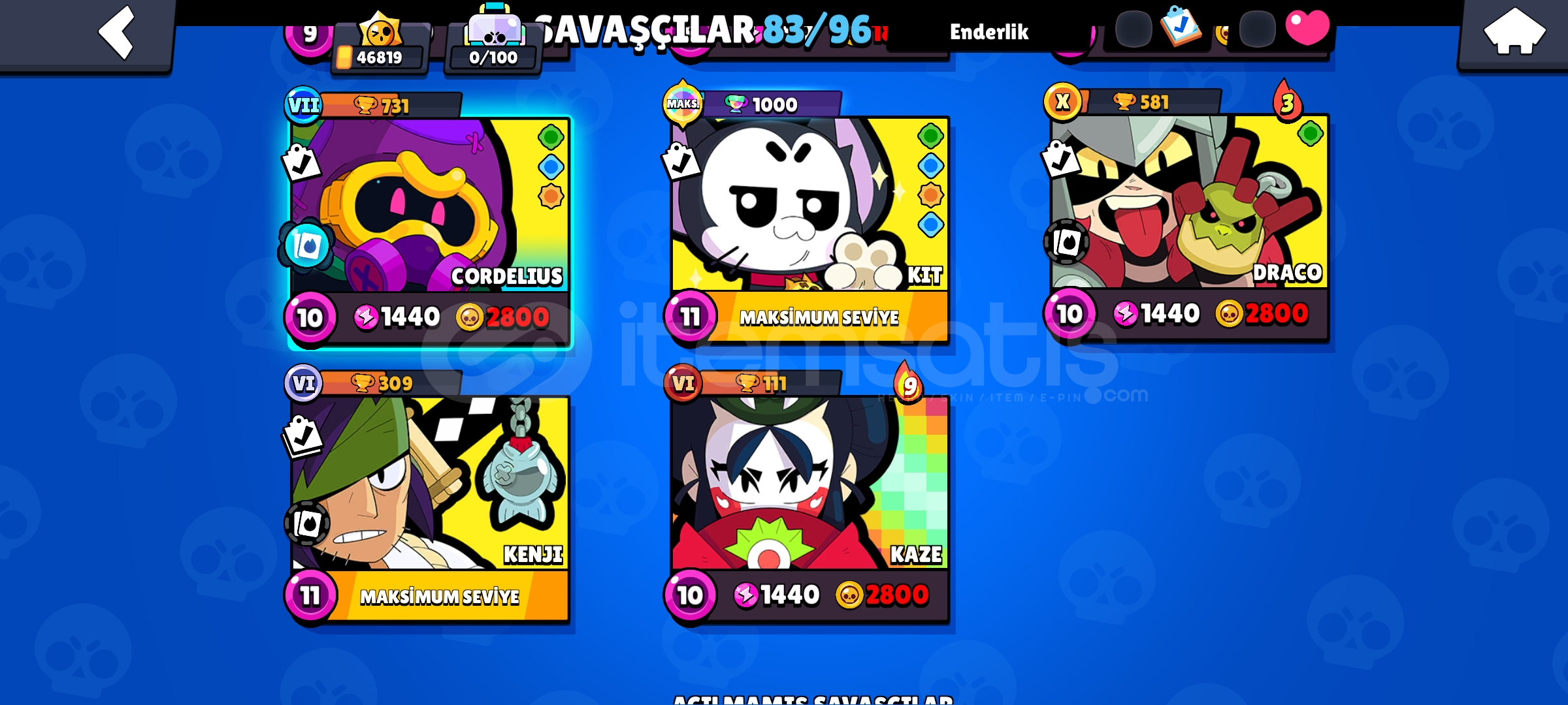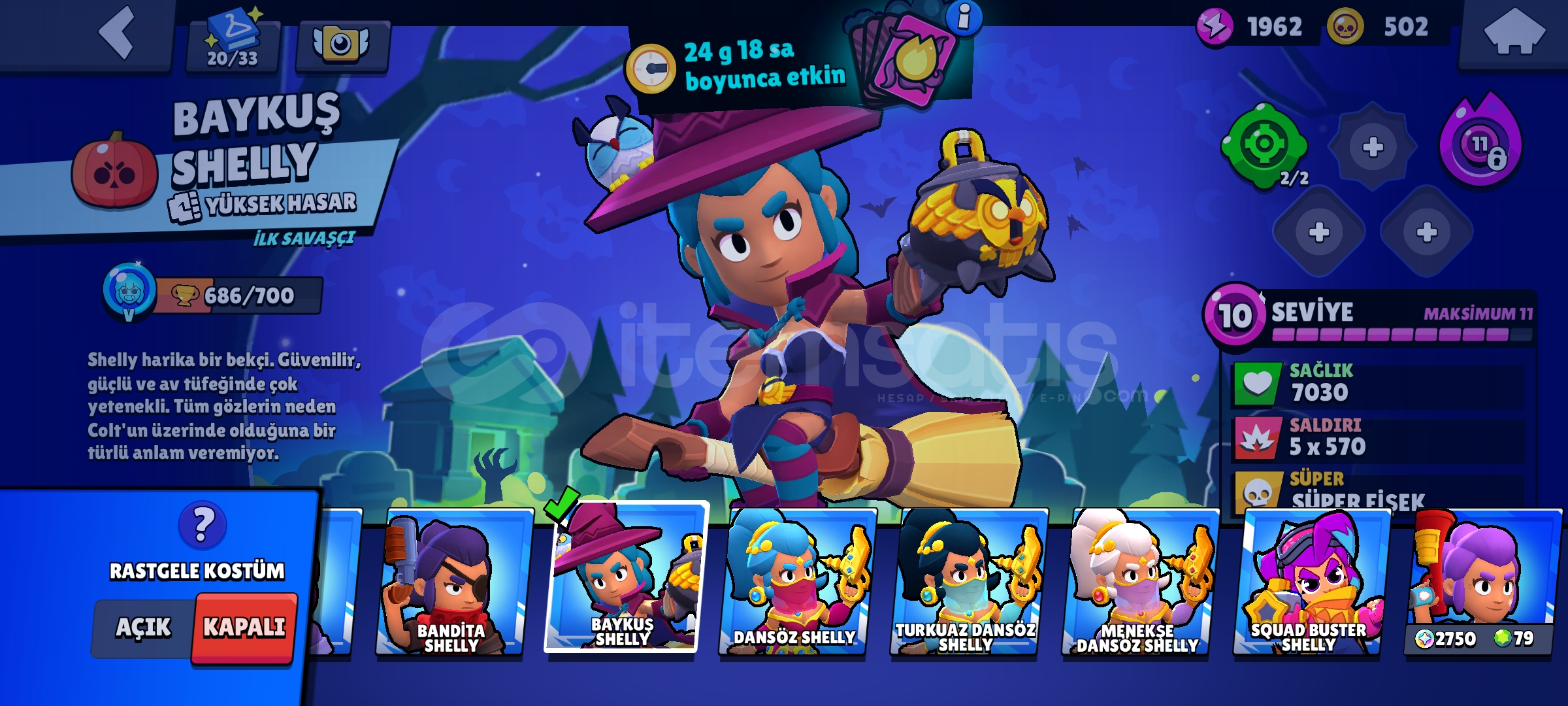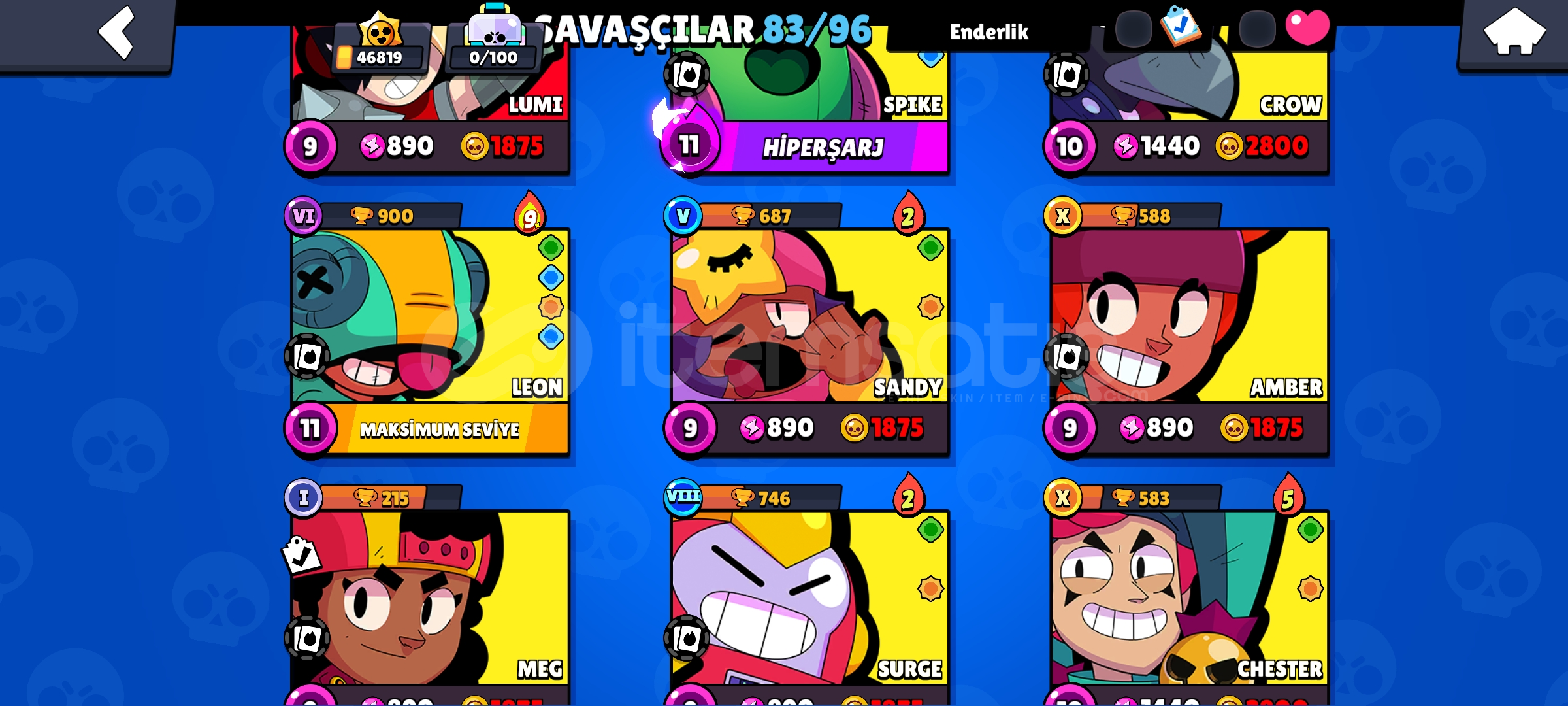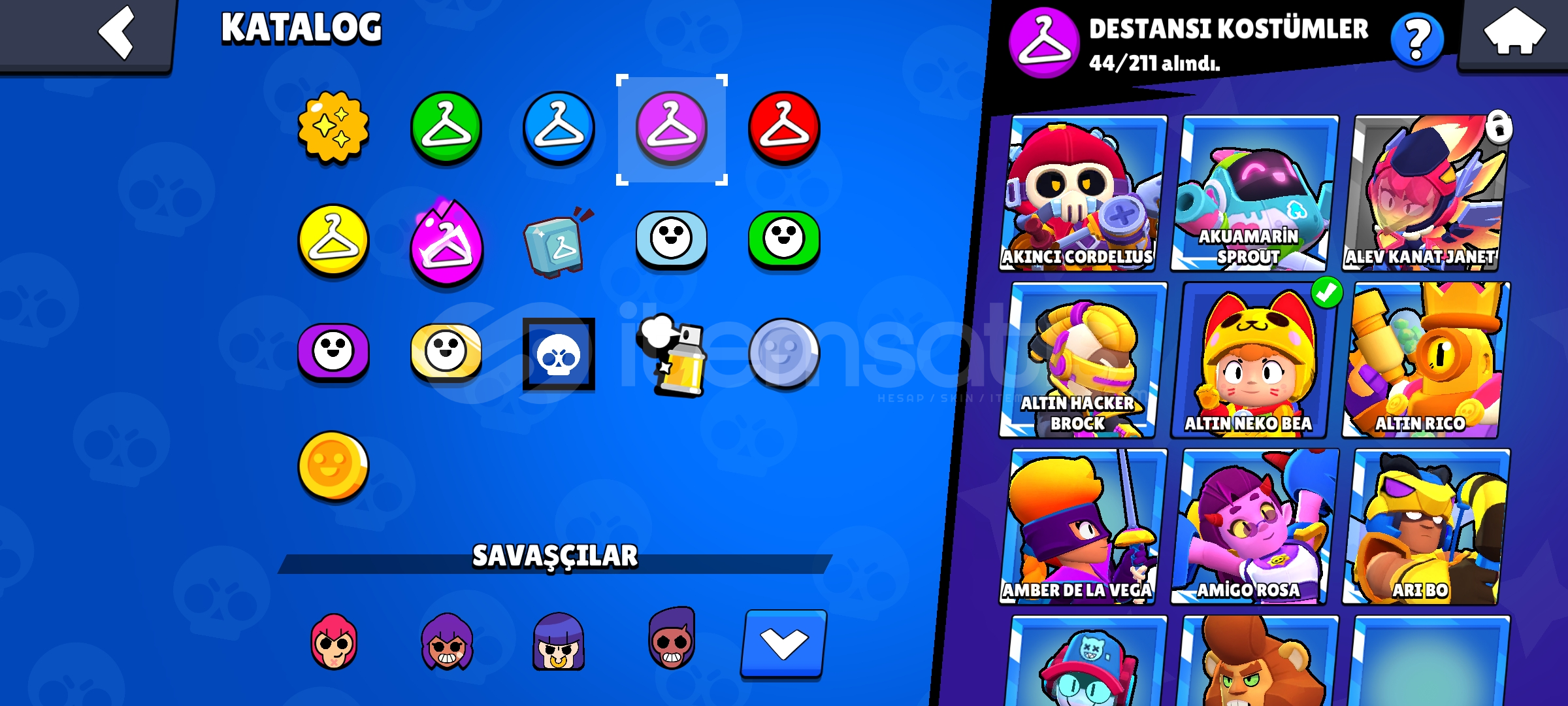 Hesapta bütün efsanevi karalterlwr ve destansılar vardır birkaç tane gizemli eksiktir. Hesapta1 kere brawl pass ve bir kere brawl pass plüs açılmıştır. Hiperşarj kostümleri ve detaylar fotoğraflardadır. 2019 da kurulmuştur. Pazarlık payı vardır ve sadece ciddi alıcılar yazsın!!