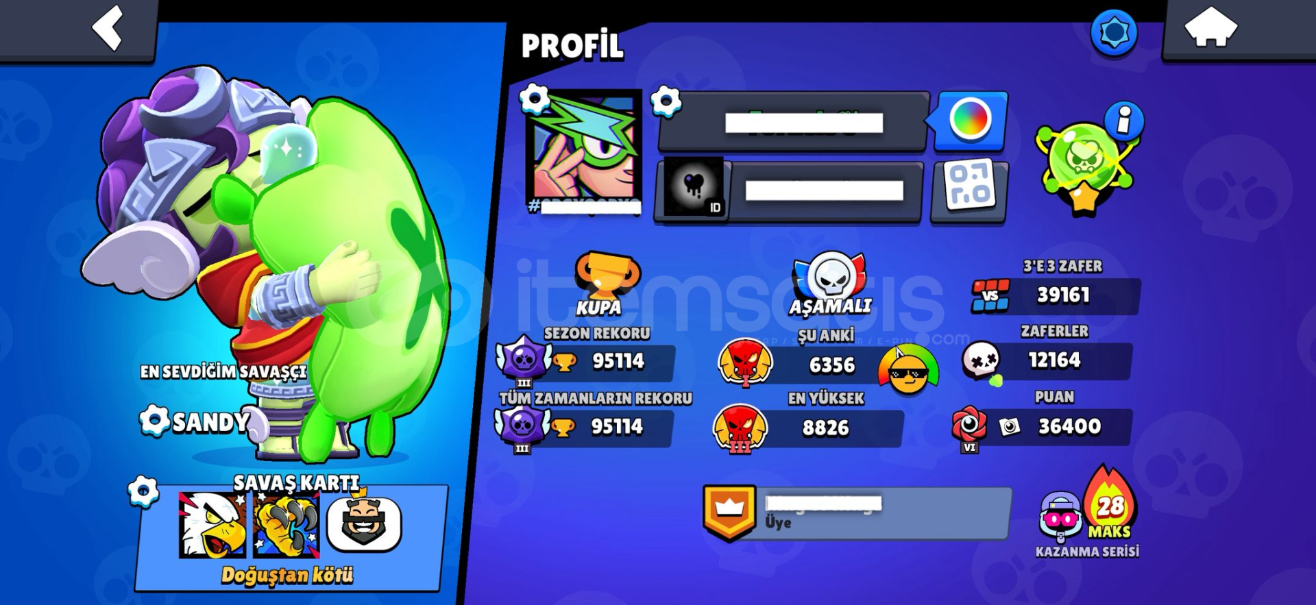Hesap ile ilgili genel bilgiler;Hesap güncel olarak 95.197 kupaya sahiptir ve hesap içerisinde bütün karakterler mevcuttur. hesap uzaylı 1 şöhretindedir.hesapta aktif 8 adet kullanıma hazır brawlpass+ bulunmaktadır ve hesapta yeni sezon pro pass açıktır ! hesapta kullanıma hazır 166.607 altın bulunmaktadır. hesapta bütün yıldız gü&cced...