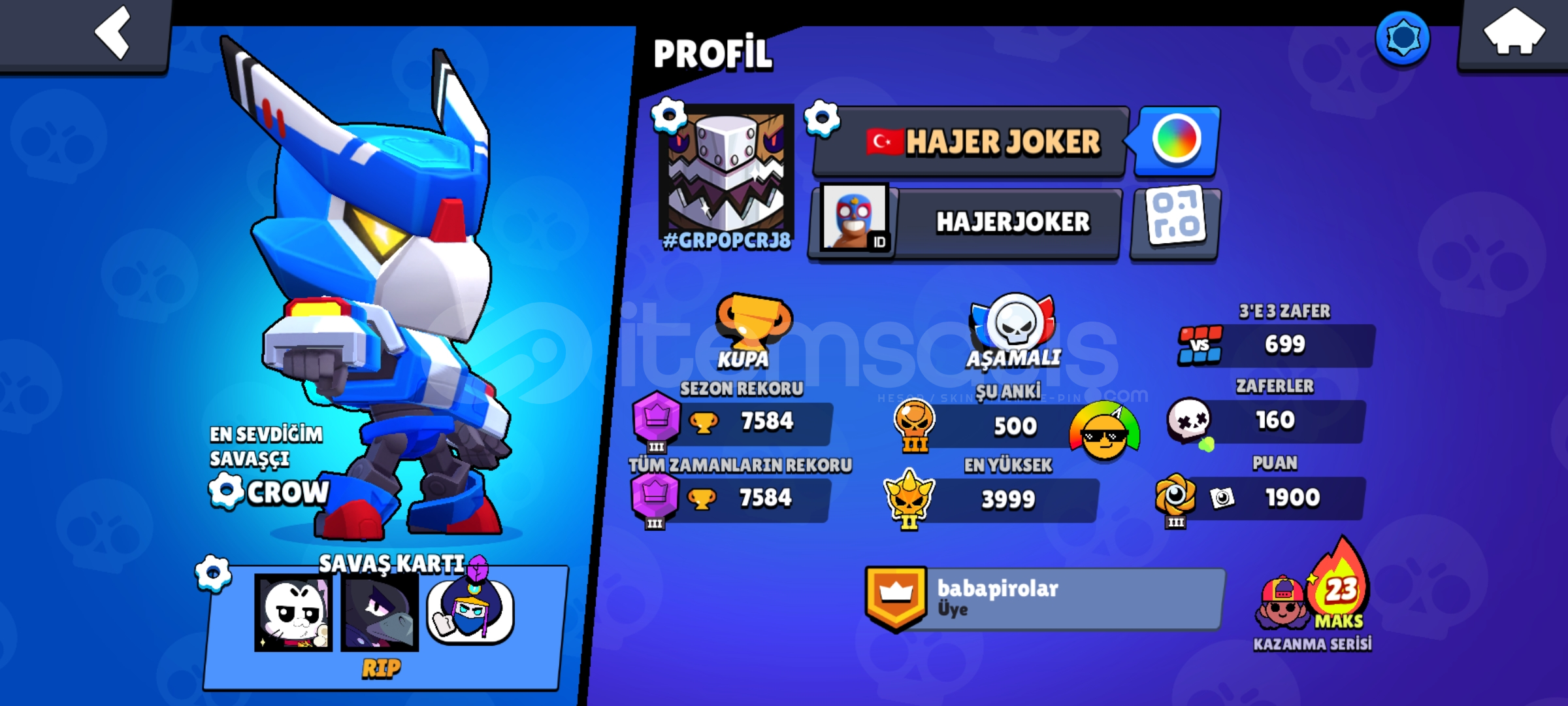 Hesapda Robo Mike Meka crow gibi efsanevi kostümler vardır 2 efsanevi kostüm 1 gizemli kostüm vardır gizemli kostüm ise Megaladon kostümü 6 efsanevi karakter vardır detaylı inceleme için "HAJERJOKER" İsim etiketini brawl stars ın arkadaş ekleme bölümüne yazınız