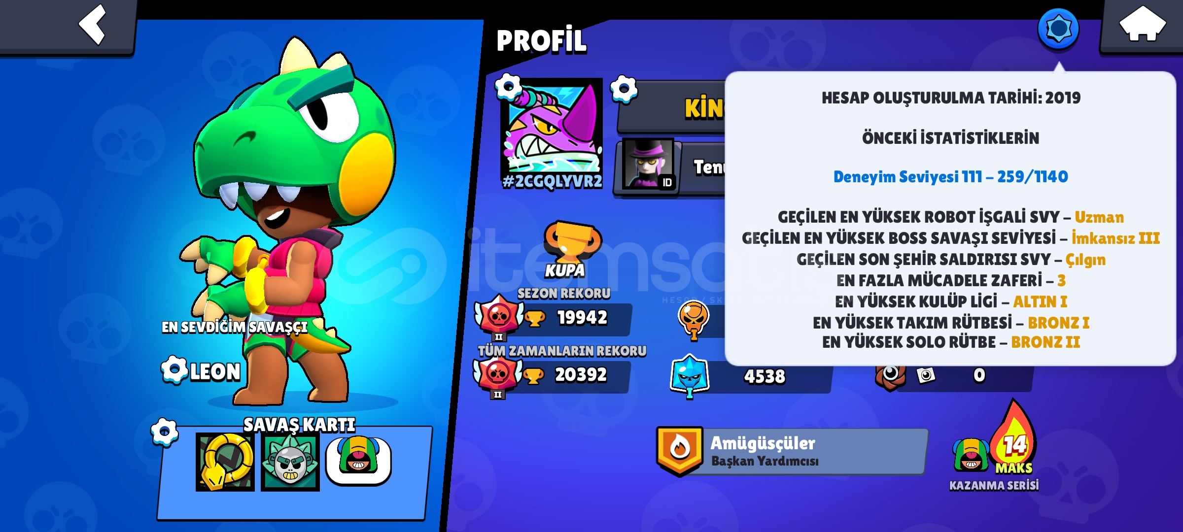 🎮 Brawl Stars Hesap Satışı 🎮📌 Hesap Bilgileri:Hesap oluşturulma yılı: 2019Kupa: 19.000+ (Sezon rekoru 19.942 – Tüm zamanların rekoru 20.392)Deneyim seviyesi: 111En sevilen savaşçı: Leon (Kostümlü)📌 Geçmiş Başarılar:En yüksek Robot İşgali seviyesi: UzmanEn yüksek Boss Savaşı seviyesi: İmkansız IIIEn yüksek Şehir Saldı...
