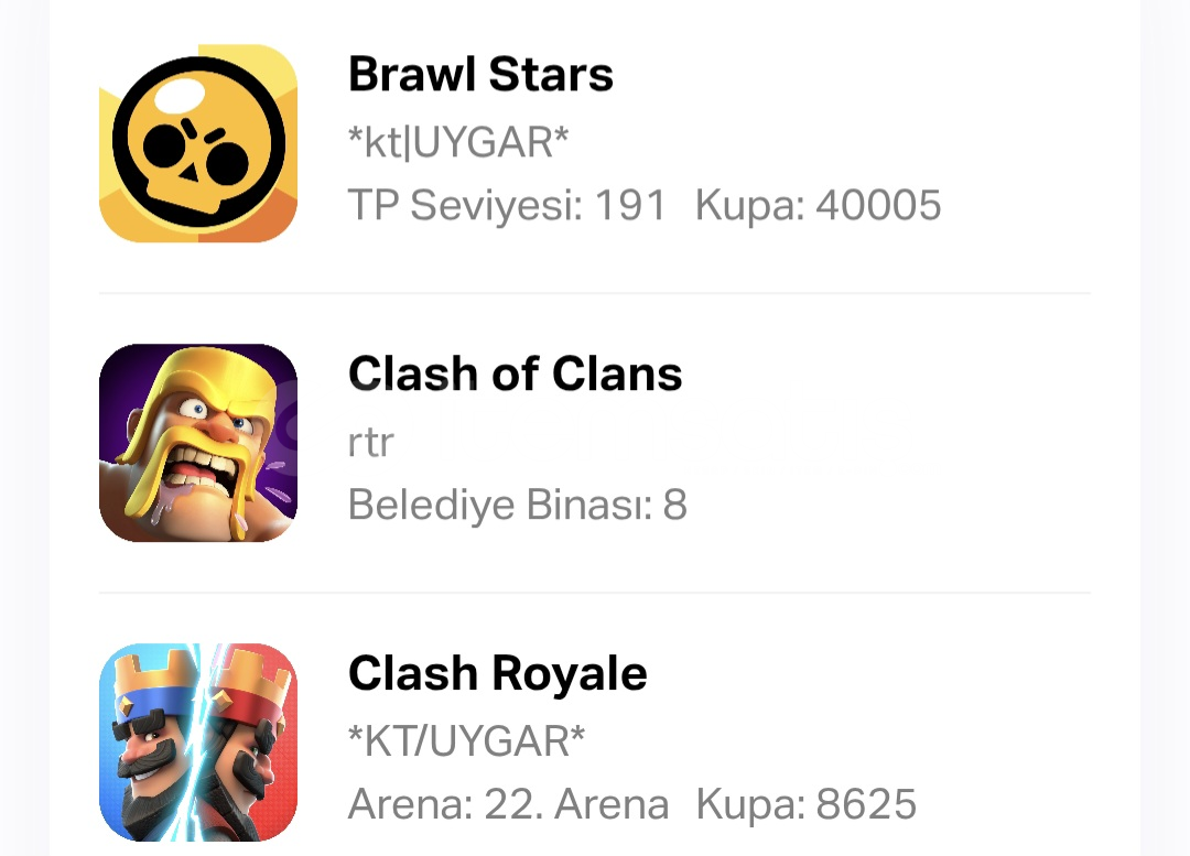 Brawl stars=40.000 kupa/97 karakter/20 hiperşarz/232 kostüm/429 rozet/221 oyuncu simgesi/82 sprey/2019 hesabıClash royale=8.600 kupa/121 karakter/6 tane evrim/33 tane ifadeClash of clans=8. Bina Not: 3 hesap tek maildedir tüm oyun hesapları doludur 2 oyundaki tüm karakterler vardır alana hayırlı olsun bu fiyata kaçmaz