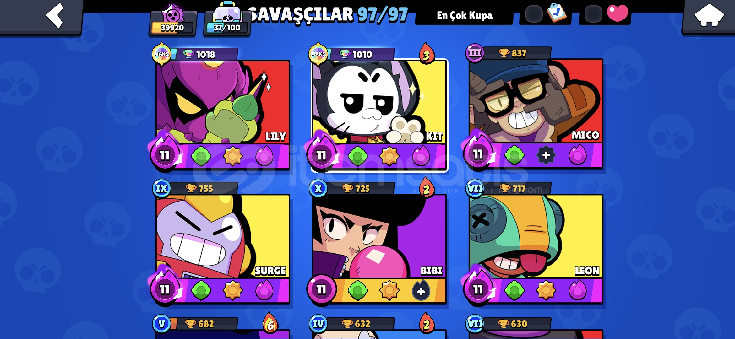 Brawl stars=40.000 kupa/97 karakter/20 hiperşarz/232 kostüm/429 rozet/221 oyuncu simgesi/82 sprey/2019 hesabı