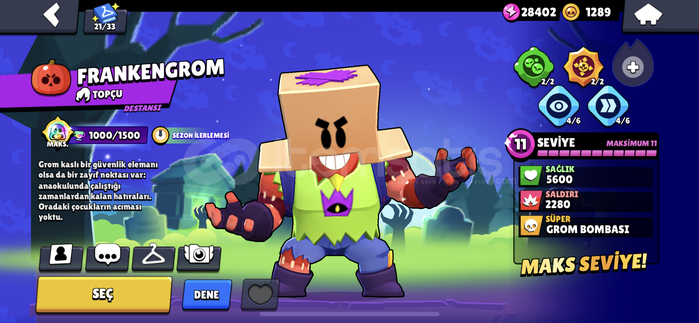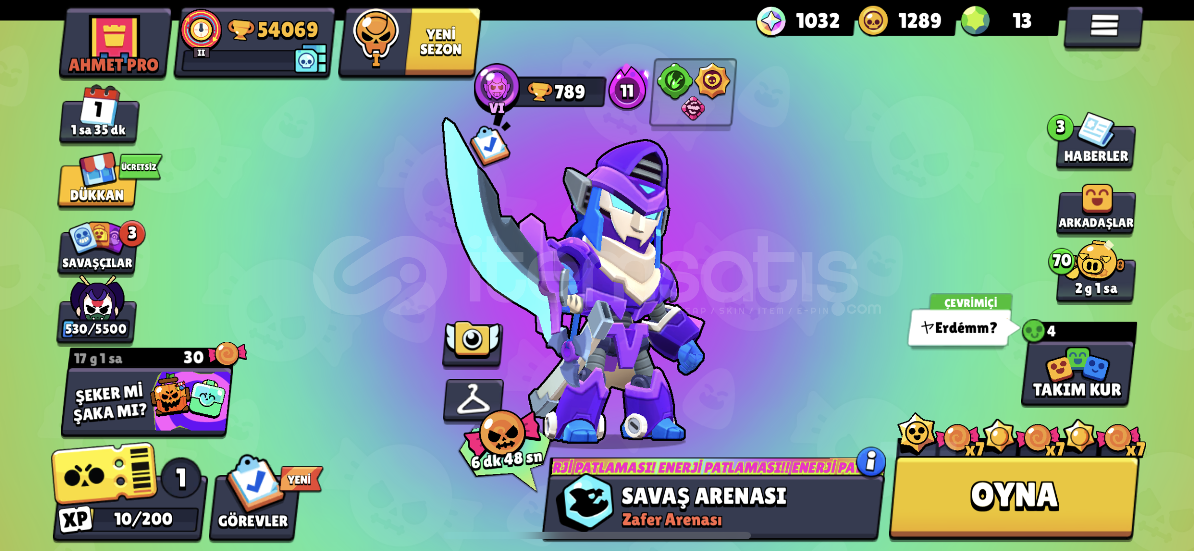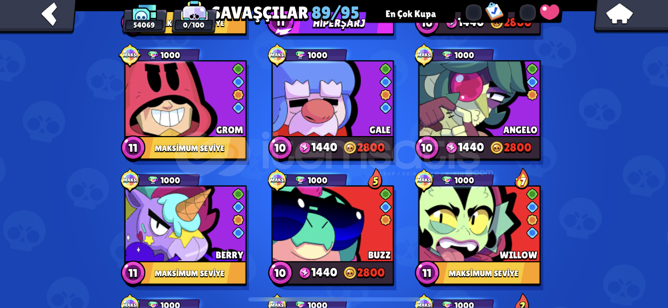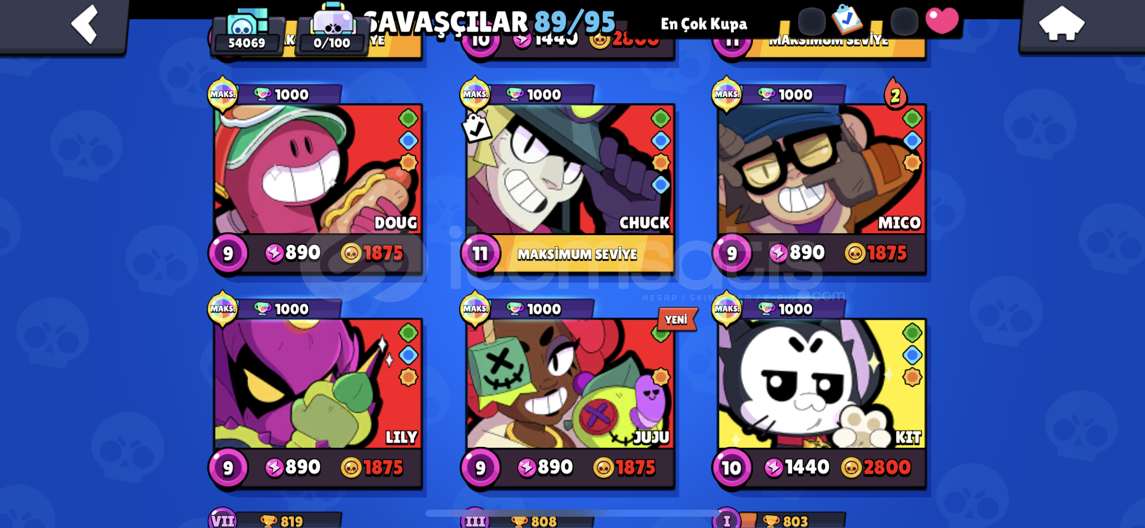 Hesap Özeti:Karakter Sayısı: 89Hypercharge (Hiperşarj): 6 adetMax Seviyeli Karakter: 6 adetDiğerlerinin Ortalaması: En iyi 10 karakter 10. seviye, diğerleri 7–8 civarıToplam Skin (Kostüm): 176Toplam Kupa: 54.069Bağlantı Durumu: Supercell ID / Apple / Gmail bağlı (hesap güvenliği var) Ve 18 Karakter 1k Kupa