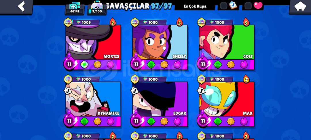 Hesabın karakterlerinin hepsi açıktır 46 bin kupa 9 Efsanevi 8 gizemli 86 destansı 73 süper ender 85 ender kostüm bulunmakta. hesabın 1000 level üstü karakter sayısı 14 tür. şöhret iki ve 4 tane brawl pass açılmıştır. hesaba 6500 tl yatırılmıştır hesabı alacak kişiye şimdiden hayırlı olsun ciddi alıcılar ile isterse iletişime geçilebilir. hesabın 1000 level üstü karakter sayısı 14 tür