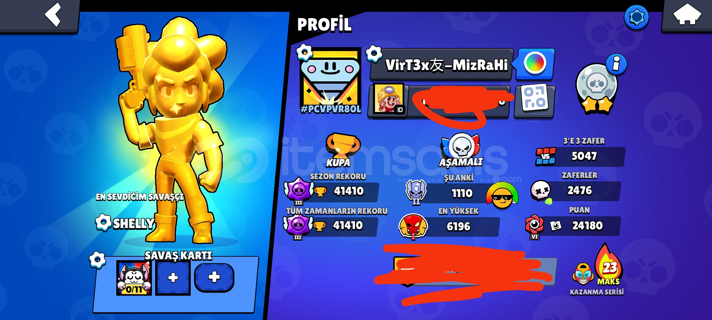 Öncelikle alana hayırlı olsun şimdi hesap sağlam hesap hesapta tüm karakterler mevcuttur hesaba 4k para yatırıldı hesapta 13 tane unvan 4 pass unvan hesapta ilk sezon pro pass açıldı colt pro pass mevcut hesap aşamalı efsanevi shelly 1500 alana hayırlı olsun İNDİRİM OLUR