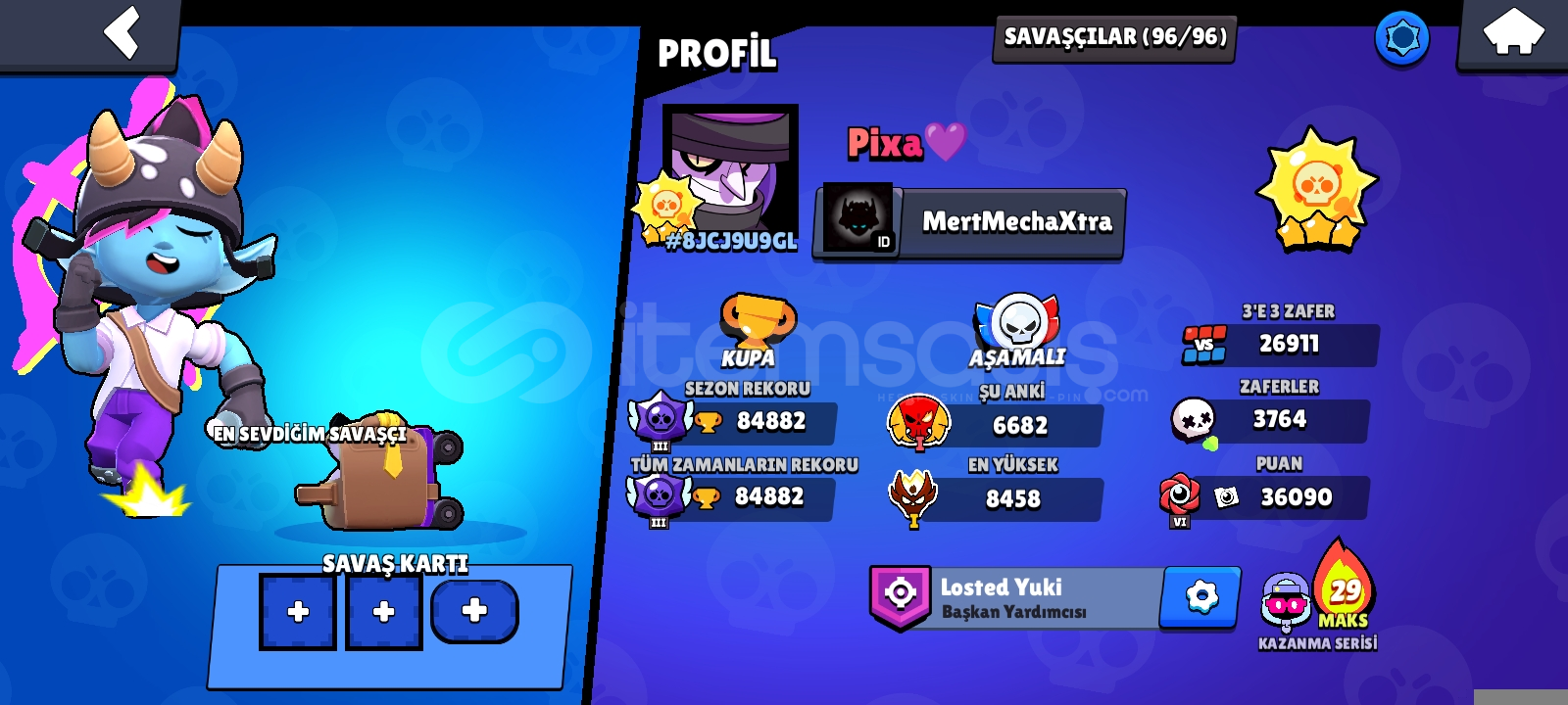 2x master (8458 elo)84882 kupa Güneş 326908 3v33764 hesaplaşma 36090 kayıt puanı 12 normal 14 bp+ ünvan 92 Ender kostüm 109 Süper ender kostüm 163 destansı 22 gizemli15 efsanevi5 hipersarj8 gümüş4 altın kostüm 2× pro pass kostümleri 73 hiperşarjı açık karakter 7040 id rewards42909 güç puanı 1555 altın 66 elmas 4774 mücevher 228 günlük seri master flDaha...