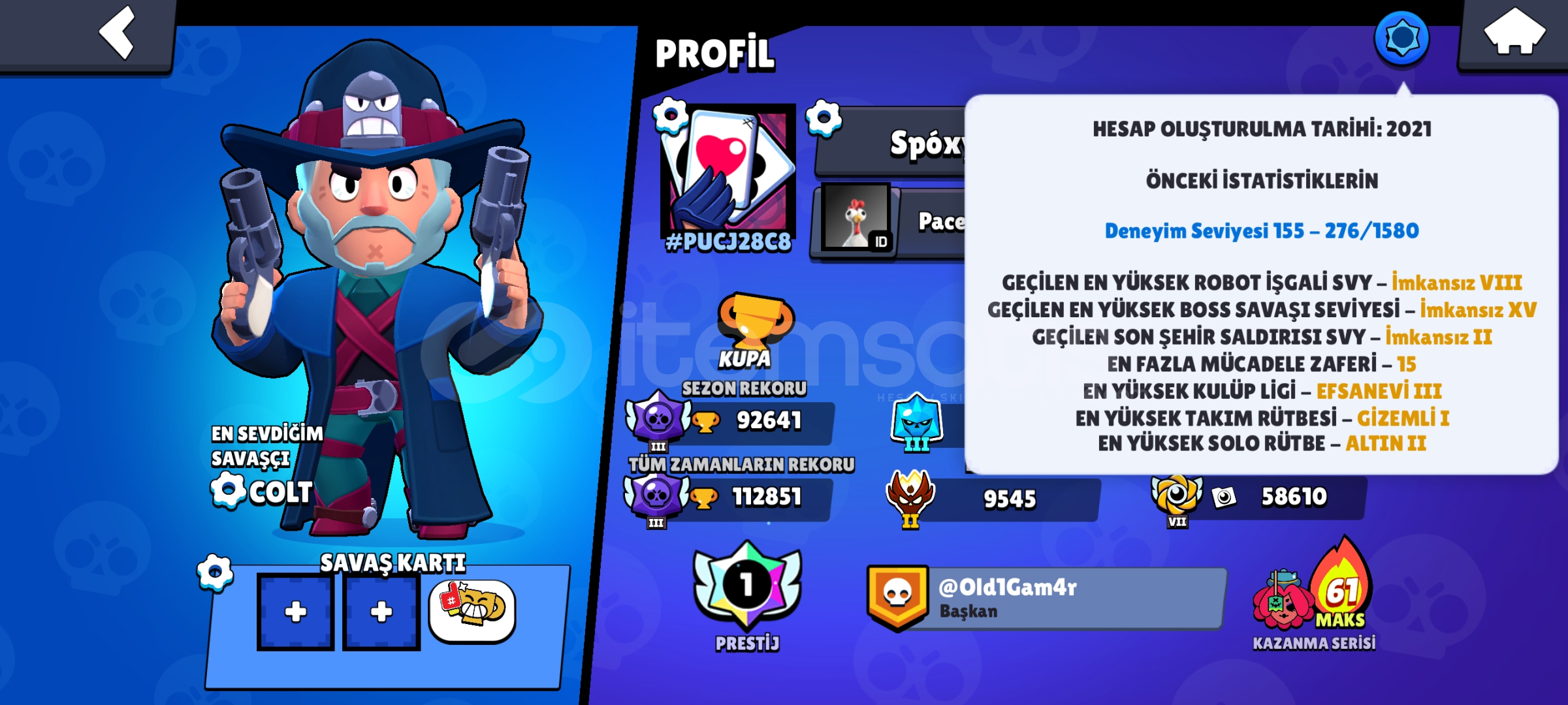 Hesap 2021 Yılından beri aktif bir şekilde oynanan bir hesaptır. Hesapta 75 tane 11 level eşyaları mevcut 61 tanede hiperşarjlı olmak üzere Max karakterler vardır. 13 evsanevi, 15 gizemli, 136 destansı, 109 Süper Ender, 91 tane Ender, 7 Hipeşarjlı kostüm olmak üzere toplam 371 kostüm mevcuttur. Toplam 5 kez yeni, 2 kez eski master, 7 tane master olan pro hesap, 112 Bin kupa Türkiye sıralaması elinde, çoğu karakterde Türkiye sıralamasında, Eski güç ligi gizemli 1 ve tüm sezonlar savaş kartı var. Kayıt puanı 7. Sıralamada 4 tane Gümüş kostüm 1 tane altın kostüm (Matcherino Pin) ve birçok oyunda olmayan pin mevcuttur. Arkadaşlık listesi bakımından pro oyuncu sayısı oldukça fazla. Alan kişiyi üzmeyen hesaptır alana şimdiden hayırlı olsun.