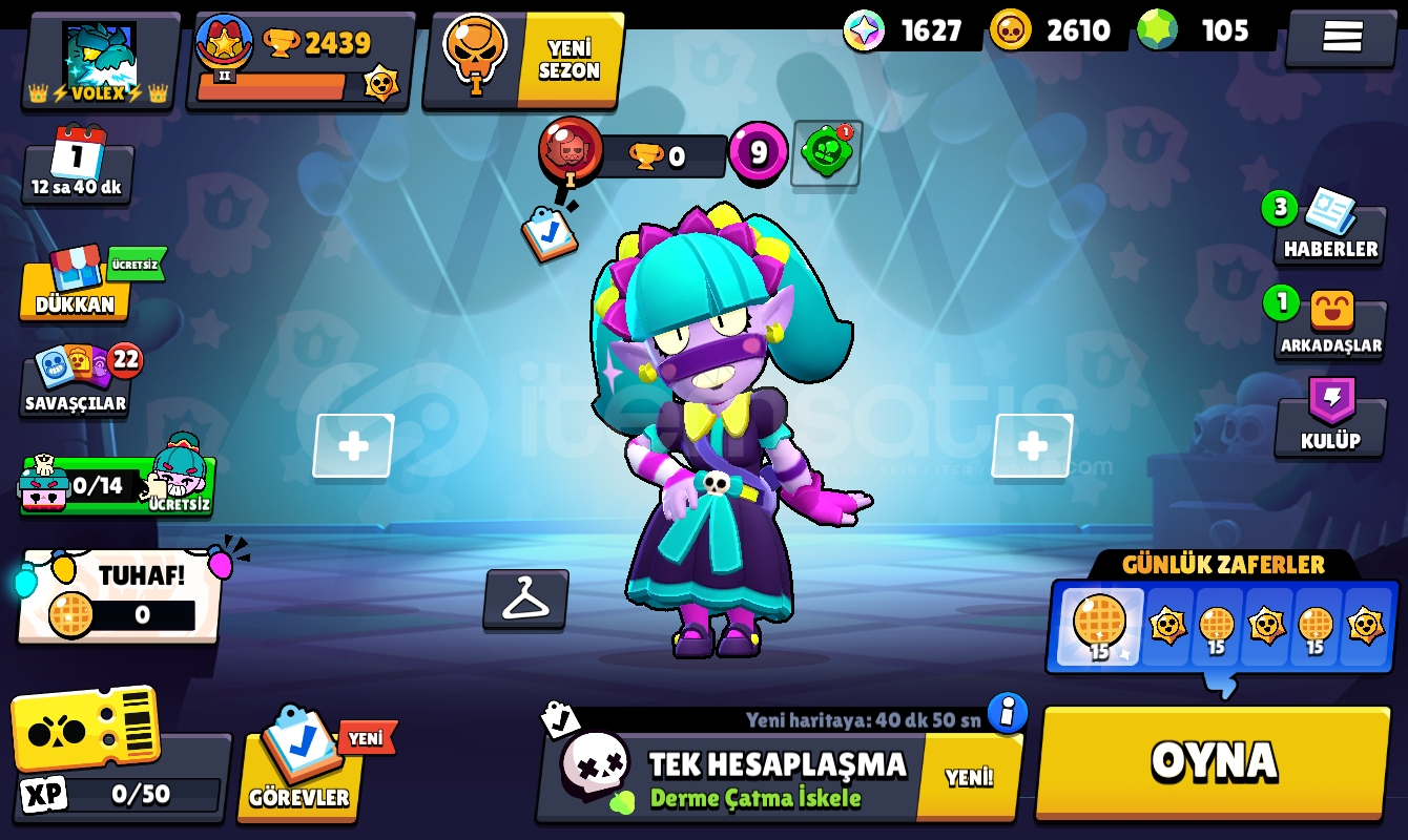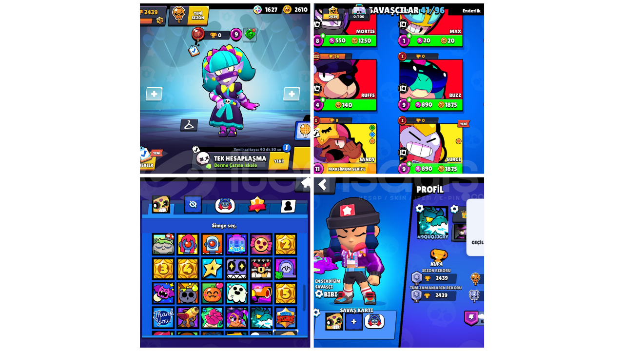 BRAWL STARS: shelly klasik,şerif,squad buster hiperşarj. nita ruı shou. colt rock yıldızı,haydut,kara melek. bull sporcu,defans oyuncusu,uzay boğası, brock aslan dansçısı,teypli,sahilde,şerif yardımcısı. 2 yıldız gücü 2 aksesuar var. elprimo vamprimo. barly büyücü,kırmızı büyücü, rosa coco, jessıe oyuncak bebek,hırsız kedi jessie 2 y...
