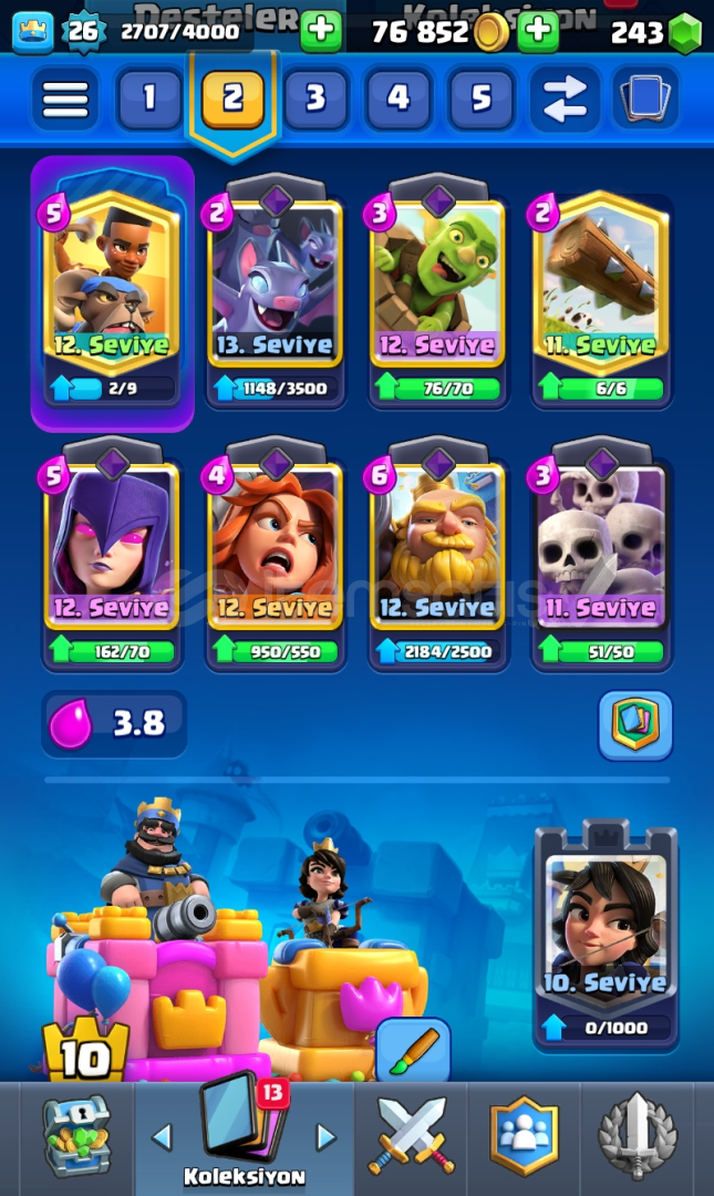 CLASH ROYALE: yarasalar 13 lvl, cadı,valkür,fıçı,kraliyet devi,koç binicisi 12 lvl, iskelet ordusu 11 lvl. önemli kartlar; mega s,koç b,gece cadı,oduncu,cehennem e,haydut,buz b,madenci,prenses,tomruk.