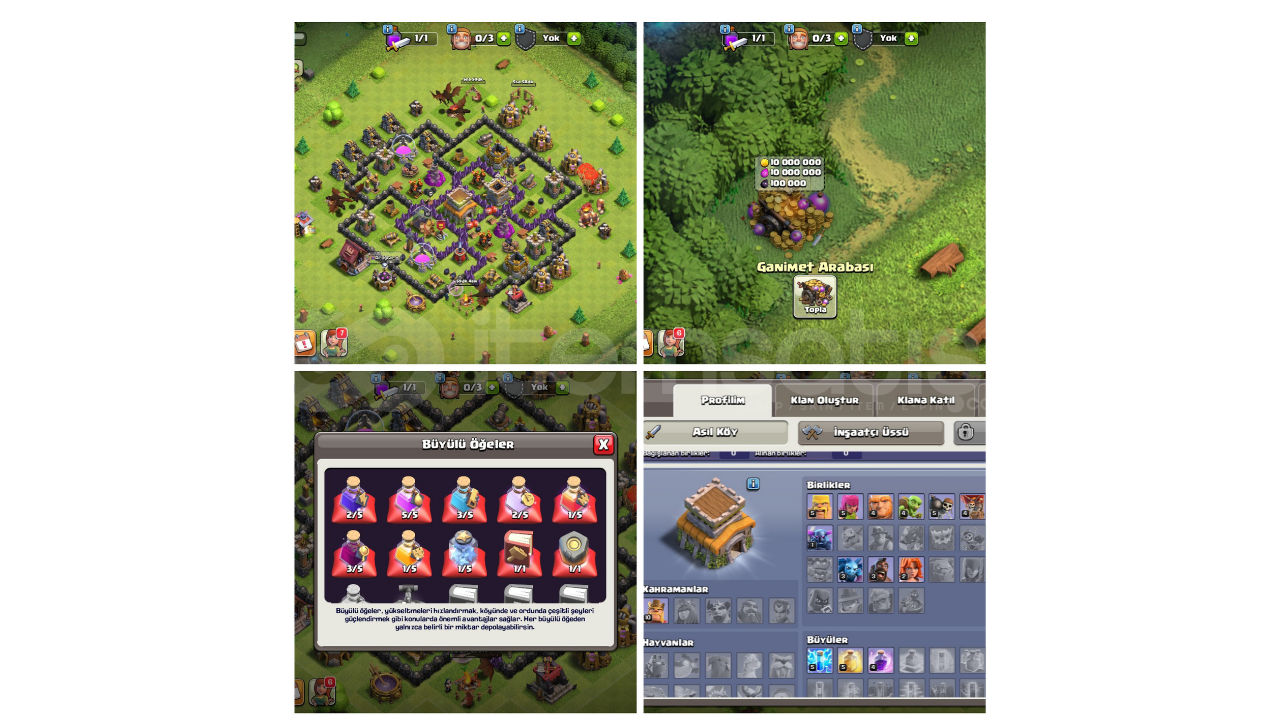CLASH OF CLANS: bu alanı kısa geçicem,8 lvl belediye binası, ejderha 3lvl, balon 4 lvl. kral 10 lvl ve ganimet arabasında 10 milyon iksir ve altın her ikisinden 10 m, 100 bin kara iksir.