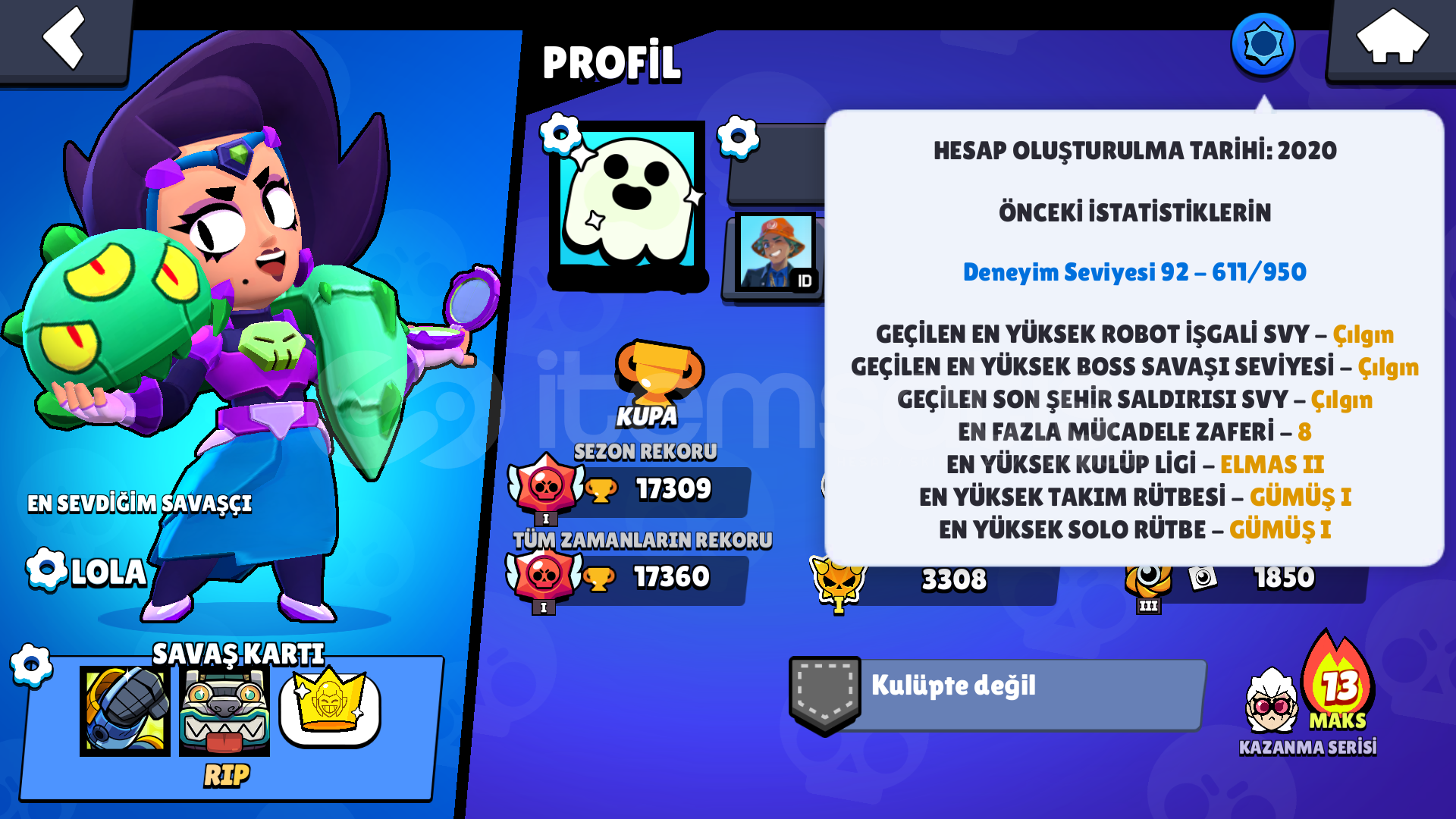 Brawl Stars Hesabı Bilgi-2020 de kurulmuştur-Hesap 17309 Kupadır-68 Karakter Vardır-73 Skin-48 Sprey-121 Oyuncu Simgesi-122 Özel Emoji(Karakter Emojileri hariç emojiler)Kaynaklar-14987 Güç Puanları-6899 Altın-2605 Mücevher-80 ElmasClash Royale Hesab Bilgi-11 Kule Seviyesi-4 Yıllık Hesap-4744 Kupadır-14.Arena-31 Emoji-4 Kule Deseni-22 Flama dekarasyonu-21 Flama Çerçevesi-2 Evrimi Açılmış ...