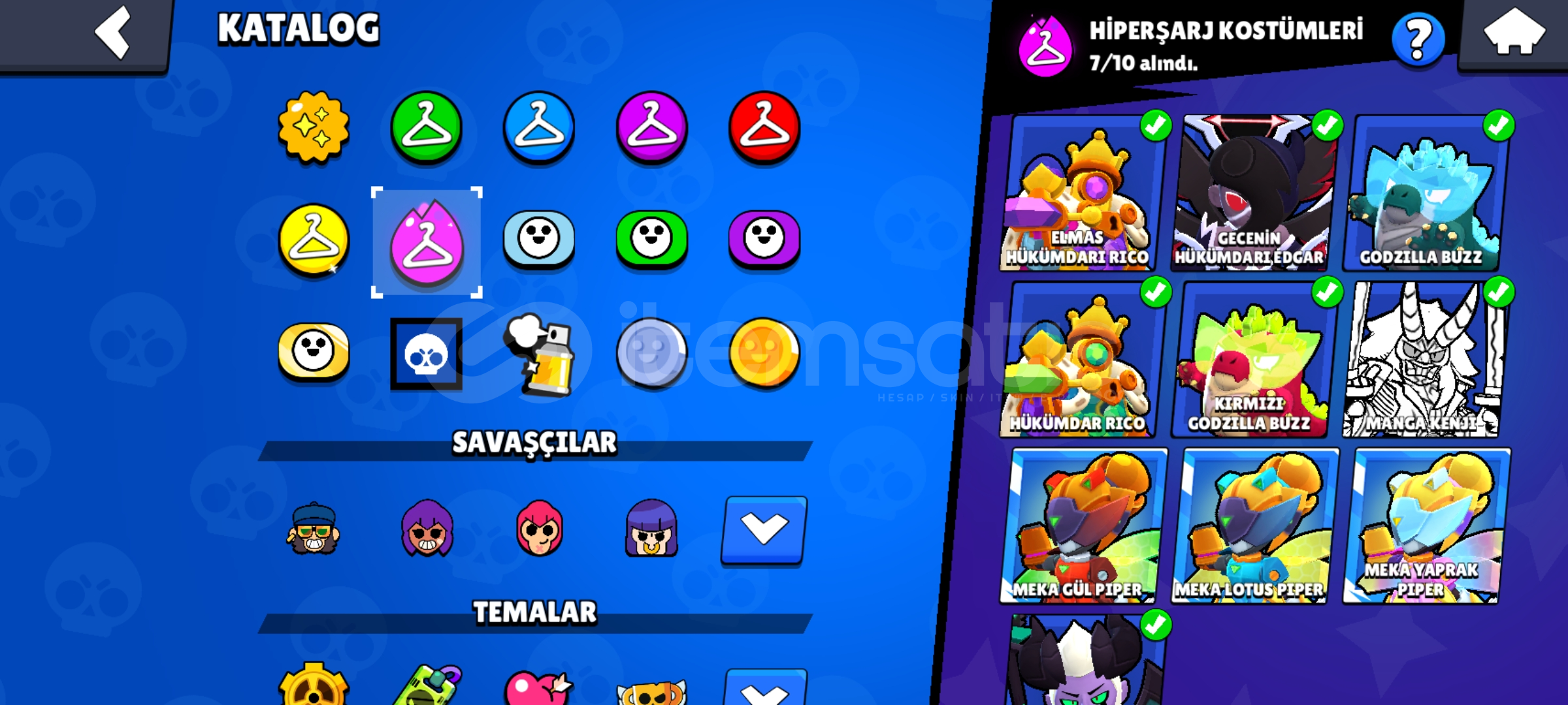 HESAP ÖZELLİKLERİ(Brawl Stars)-Hesap 2020 yılında oluşturulmuştur.-Hesapta Beyaz Kurt Leon, Başsız Stu, Lord Spike, Noel Baba Mike, Tıknaz Darryl gibi limited skinler mevcuttur.-Hesap 39.119 kupadır.-Hesapta 79 Ender, 64 Süper Ender, 57 Destansı, 3 Gizemli, 4 Efsanevi, 7 Hiperşarj olmak üzere toplamda 214 skin vardır.-Hesapta tüm karakterler açıktır. (97/97)-Hesapta 23 karakter hiperşarl&#...