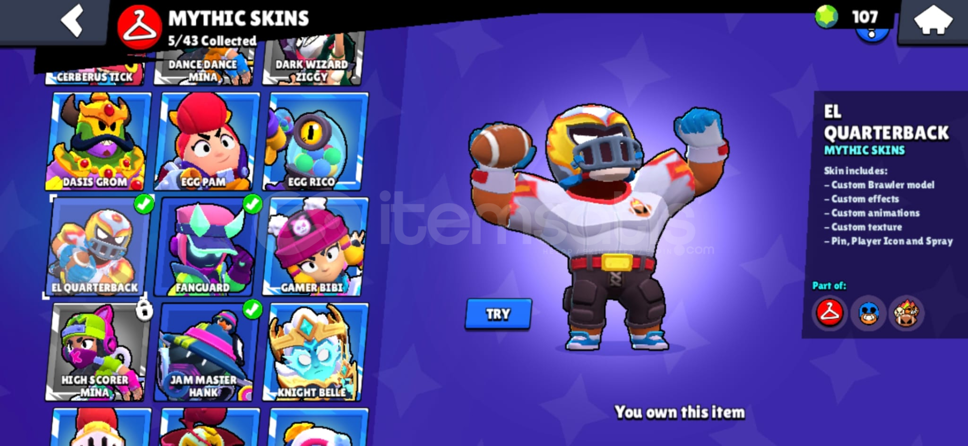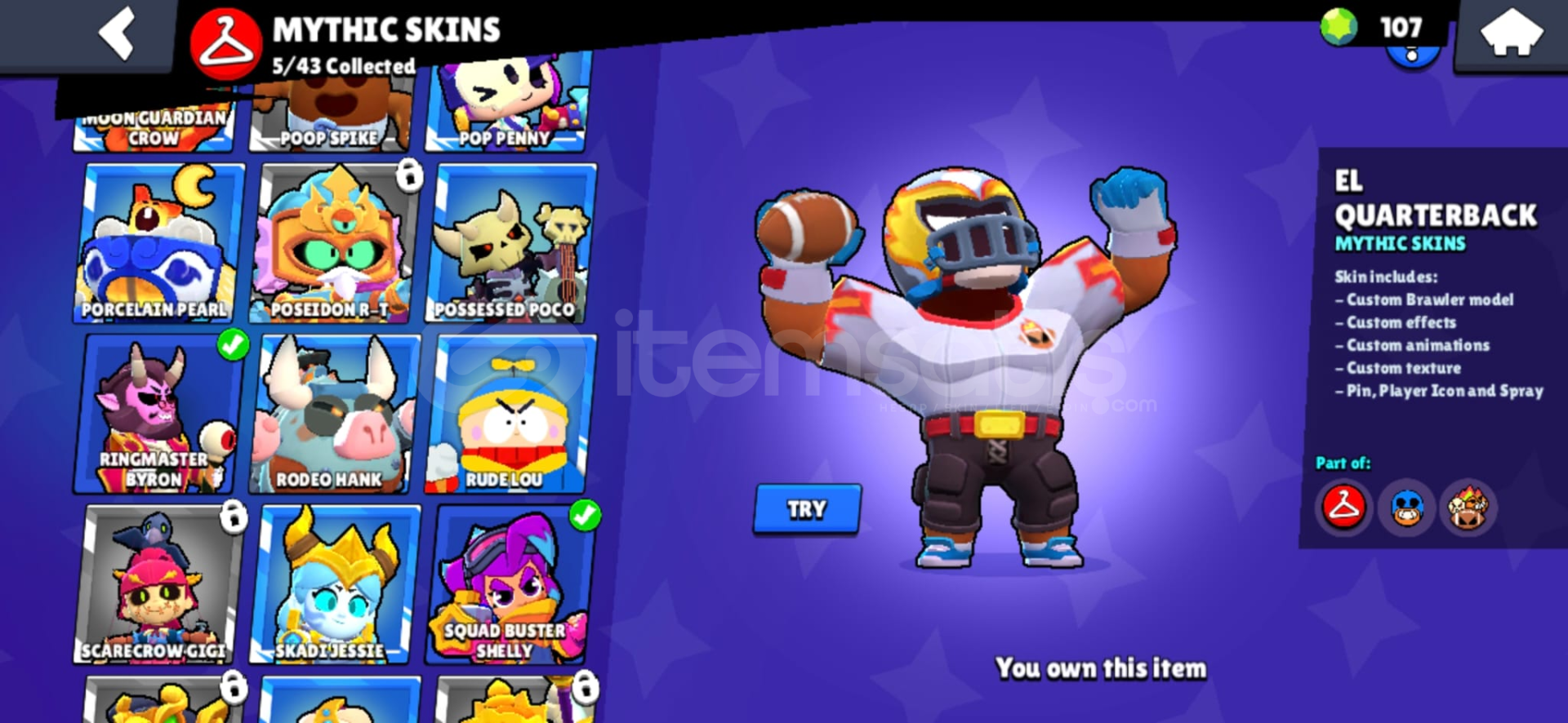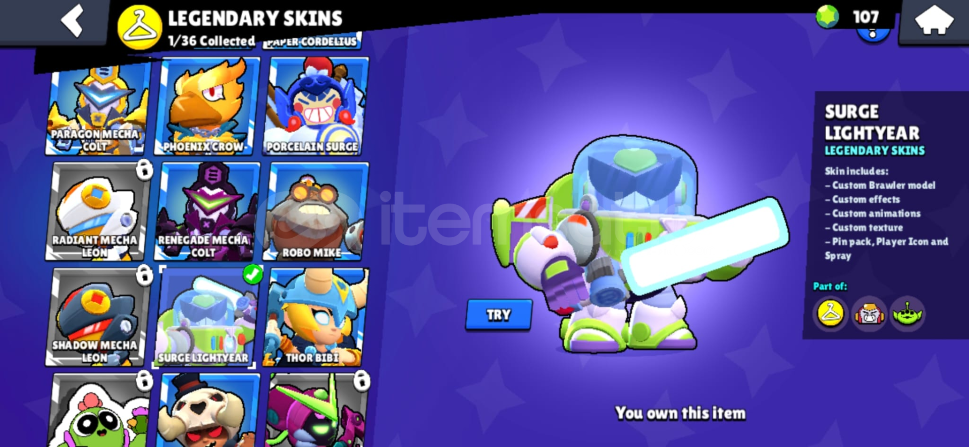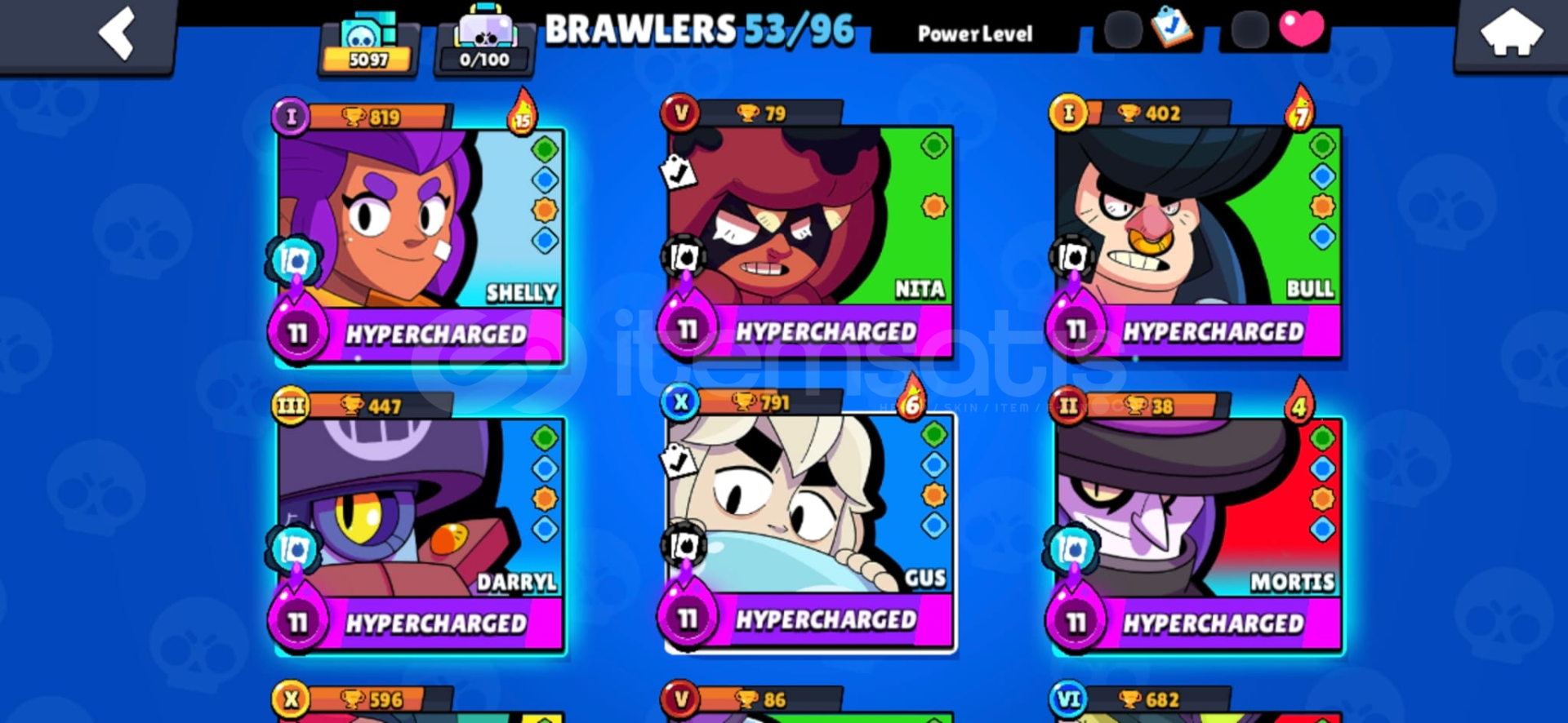 Hesapta 13 karakter 11 seviyedir. (Shelly, Colt, Bo, Edgar, Gale, Colette, Mortis, Lou, Spike, Surge, Cordelius, Kit.)
