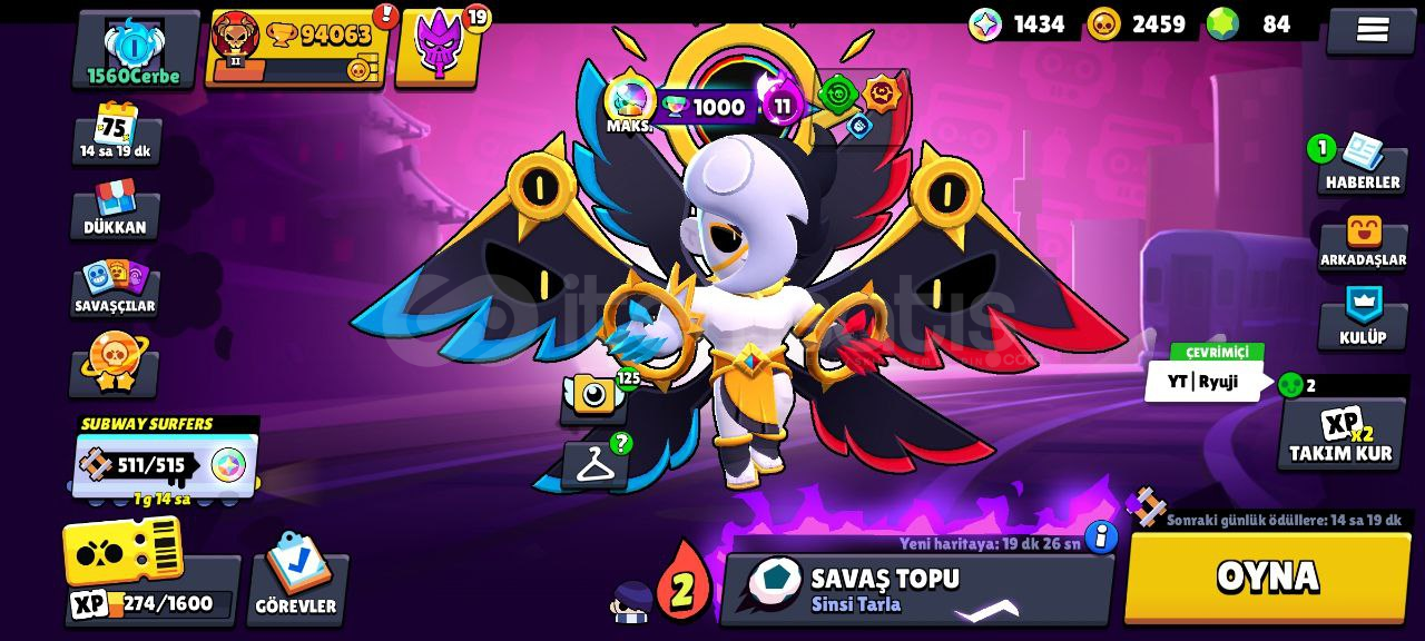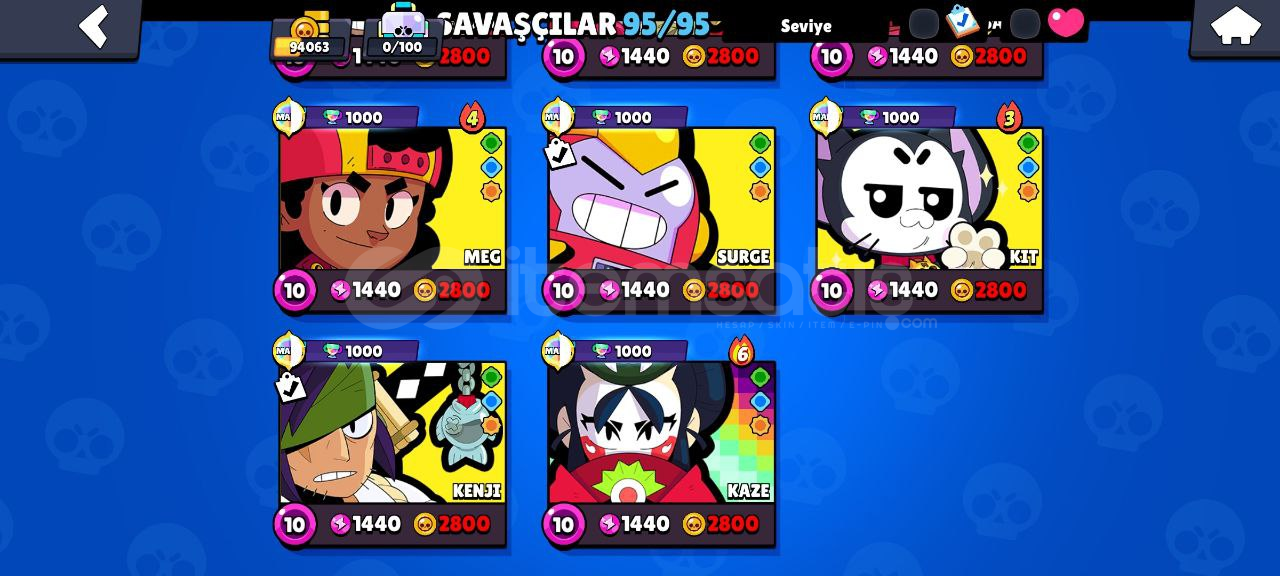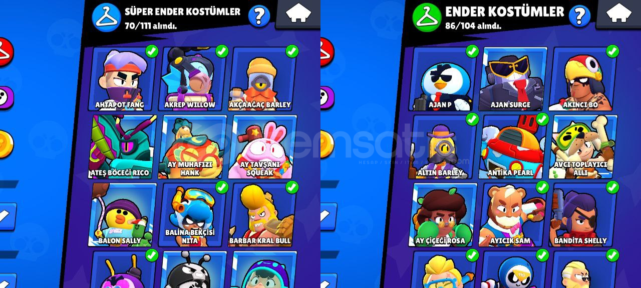 Hesap Özellikleri:95/95 Karakter, Hepsi +10 seviye45 Hiperşarj (hepsi kullanılabilir durumda)143/190 Yıldız Gücü162/190 Aksesuar140 Eşya 86 Ender kostüm70 Süper ender kostüm99 Destansı kostüm10 Gizemli kostüm16 Efsanevi kostüm5 Hiperşarj kostümü (Kara Melek Edgar'da aralarında var.) Kupa yolunda 70k dan sonraki hiçbir ödül toplanmadı. Kayıtlarda da 125 tane alı...