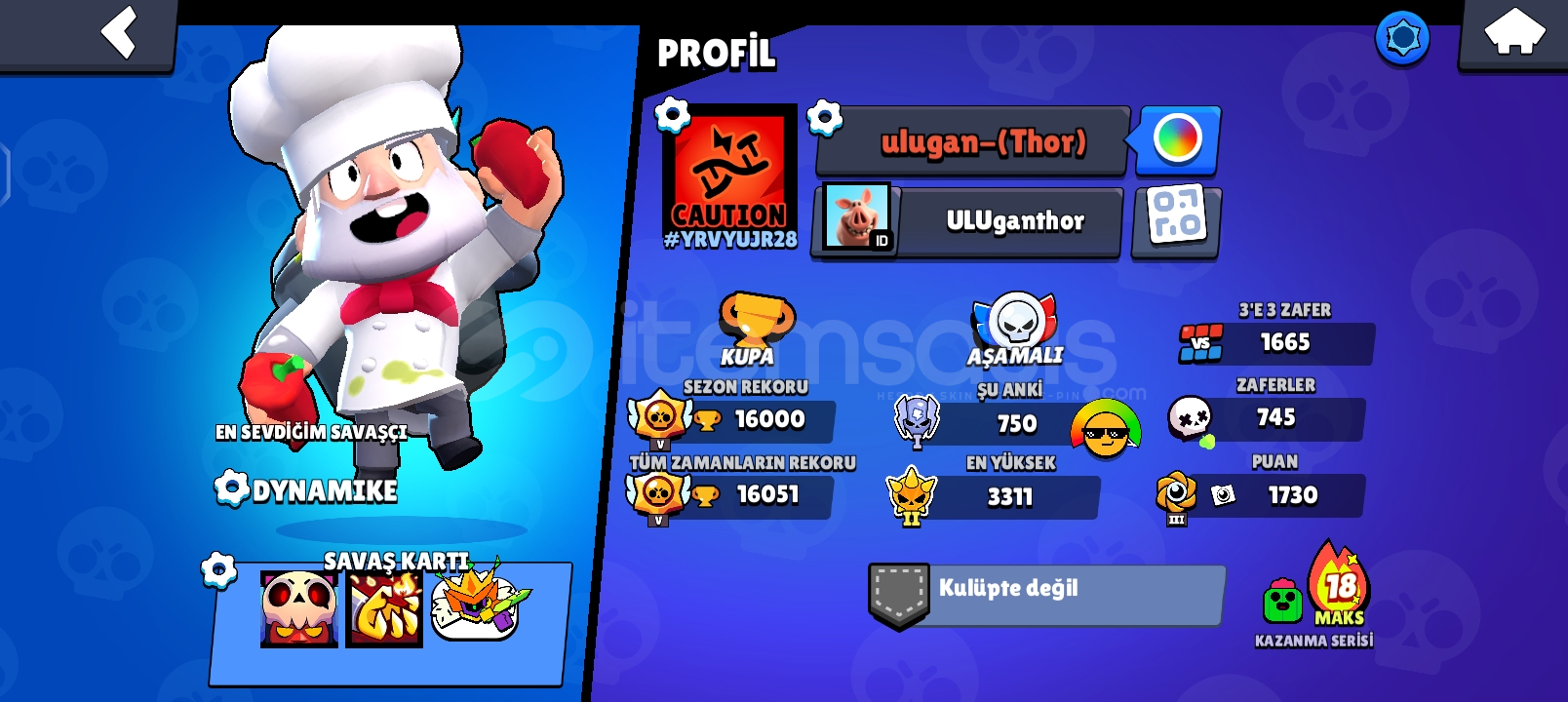 • Bu hesapta toplamda 86'dan fazla benzersiz kostüm bulunmaktadır ve koleksiyon sürekli büyümektedir! Kostümler arasında 2 adet Efsanevi Kostüm (Koleksiyonerlerin gözdesi Fil Dişi Nita dahil) ve 2 adet Hiperşarj Kostümü (Hükümdar Rico dahil) mevcuttur. Daha az nadirlikteki kostümler de çok zengindir: 1 adet Gizemli, 19 adet Destansı, 21 adet Süper Ender ve 41 adet Ender kostüm koleksiyona eklenmiştir. Ek Hesap Bilgileri: Bu hesap 16000 Kupa sezon rekoruna sahiptir ve tüm zamanların rekoru 16051 kupadır.