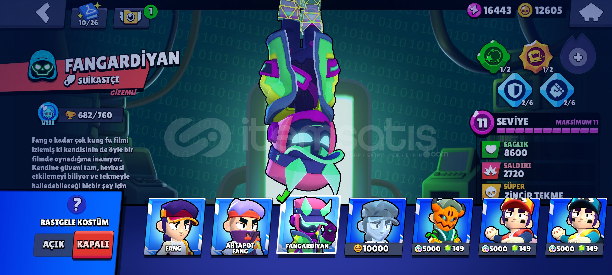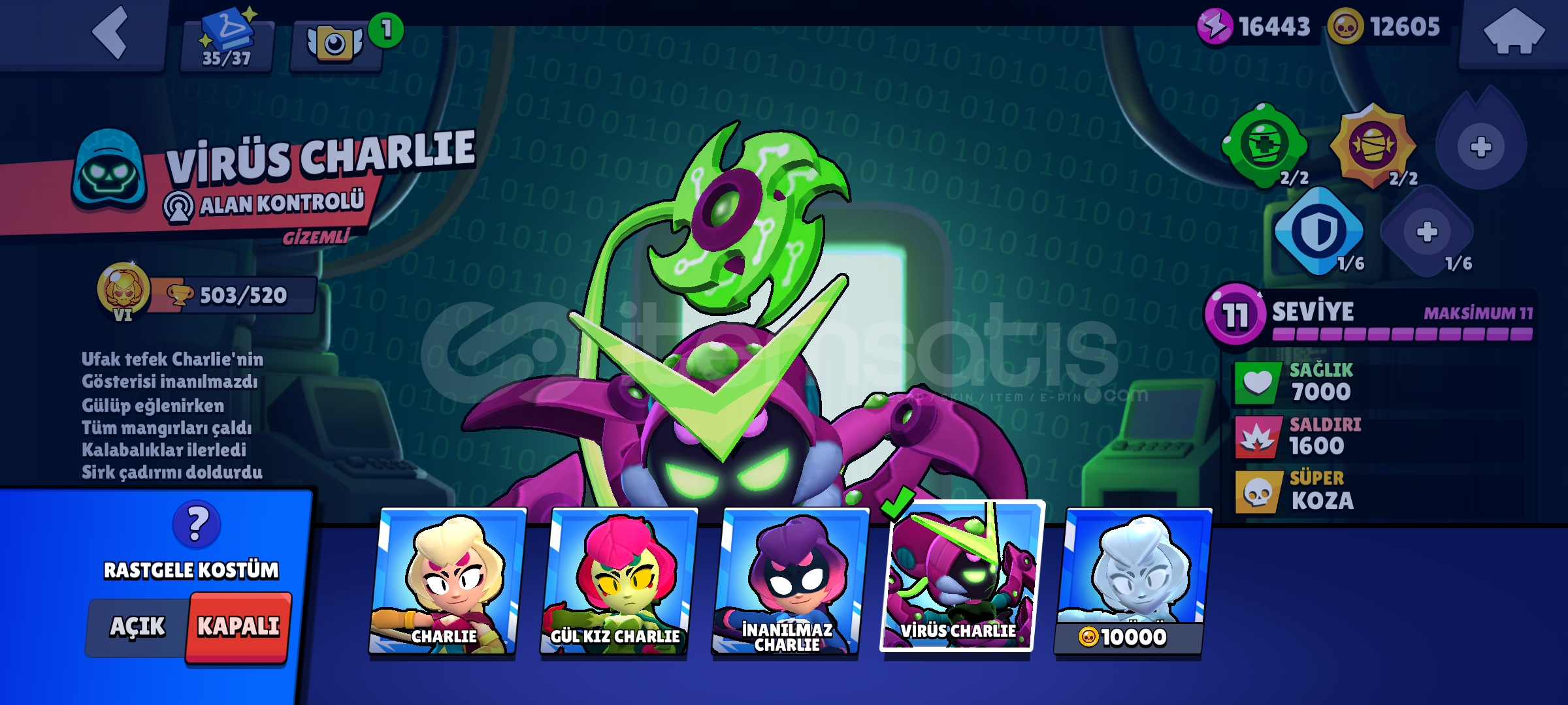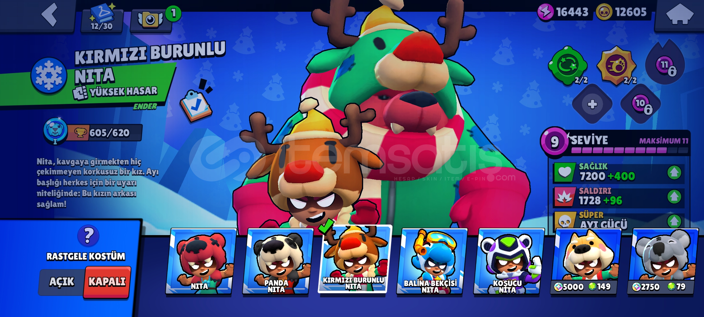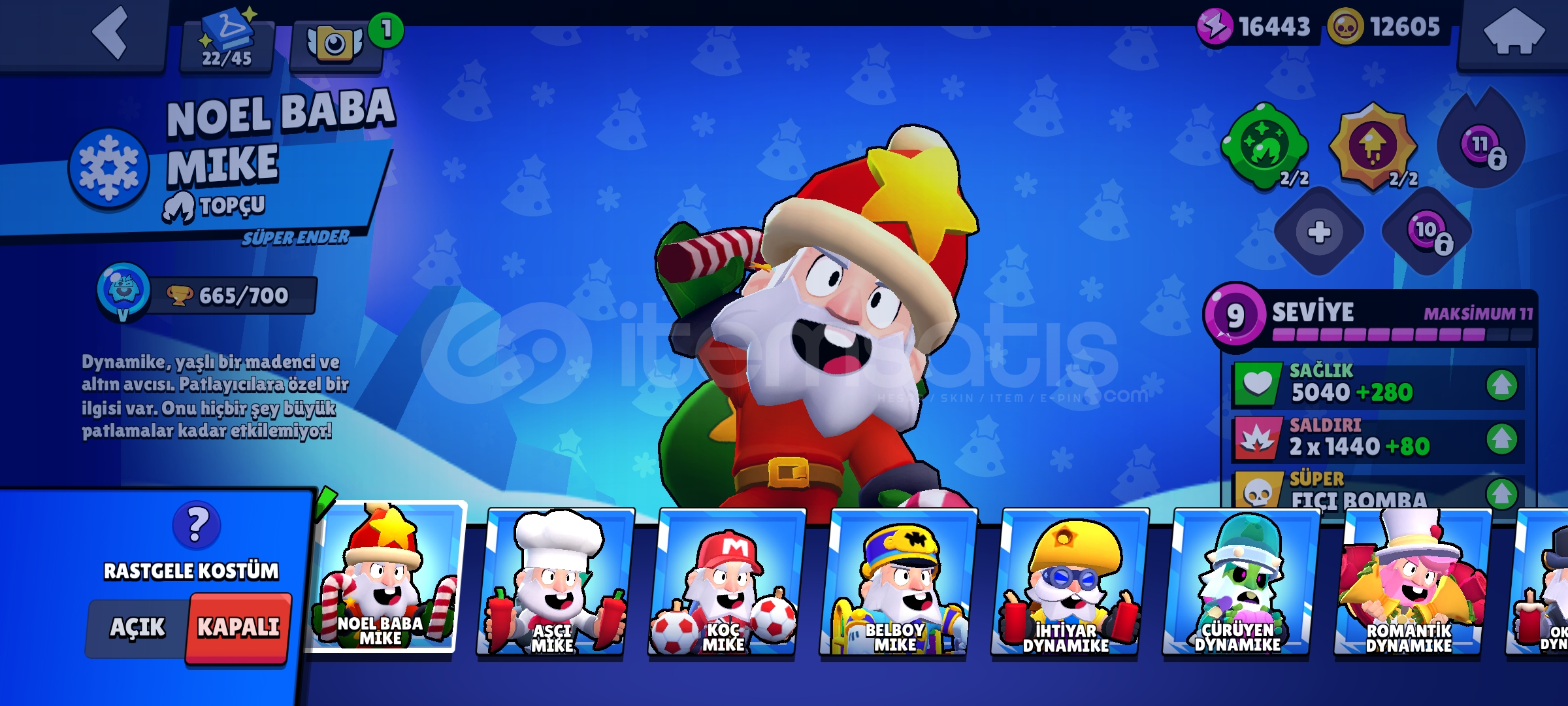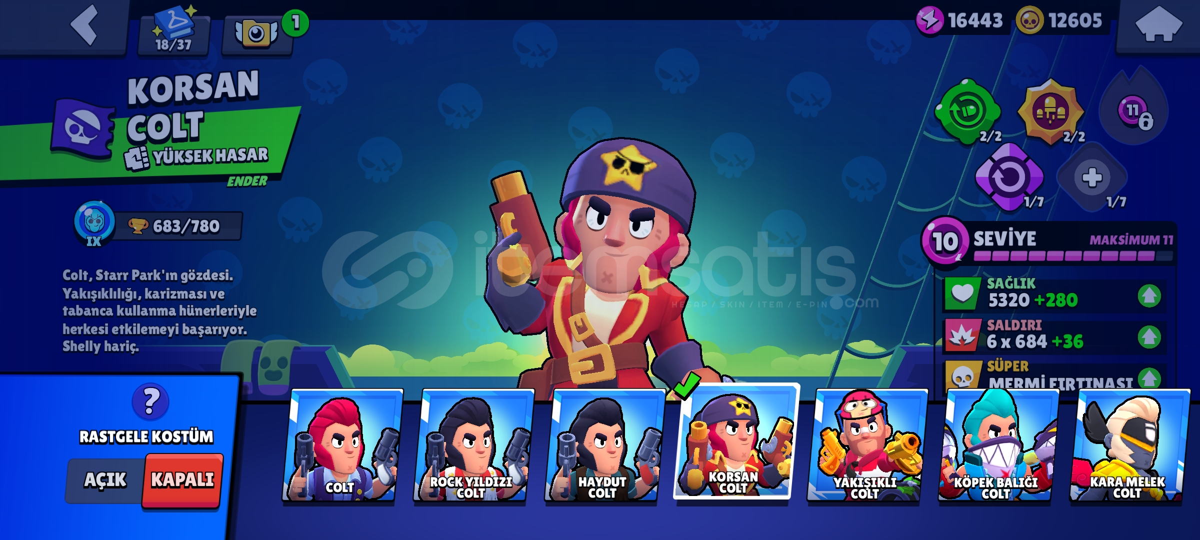 Hesap uzun zamandır oynanmamaktadır kendi şahsi hesabimdir oynamadigim için satıyorum 87 karakter vardır hepsi 9 level üstü hesapta 20k mucehver 12k altın vardir pass 60tlye açılabilir isteyen alıp kasabilir hesaptaki kostüm sayısı; 75 Ender, 76 Süper Ender, 47 destansı, 5 gizemli, 5 efsanevi, 5 hipersarj, 17 maks karakter vardır ve bibi maks rutbededir 16k güç puanı ve 12k altın vardir kupası 43k şimdiden yeni sahibine hayırlı olsun. nadir kostümler; Virüs 8 Bit, Kahraman Bibi, Squad Buster shelly,Yılan Edgar,Kötü Colette,Karanlık lord spike,yılbaşı tomrugu spike,Kurt adam Leon şekerci Leon,Surge ışık yılı,korsan colt,iskeletör piper,Noel Baba mike,kaptan carl,kırmızı burunlu nita korsan colt sokak ninjasi tara vb... İsteyen kişilere ilk bilgiler verilir.