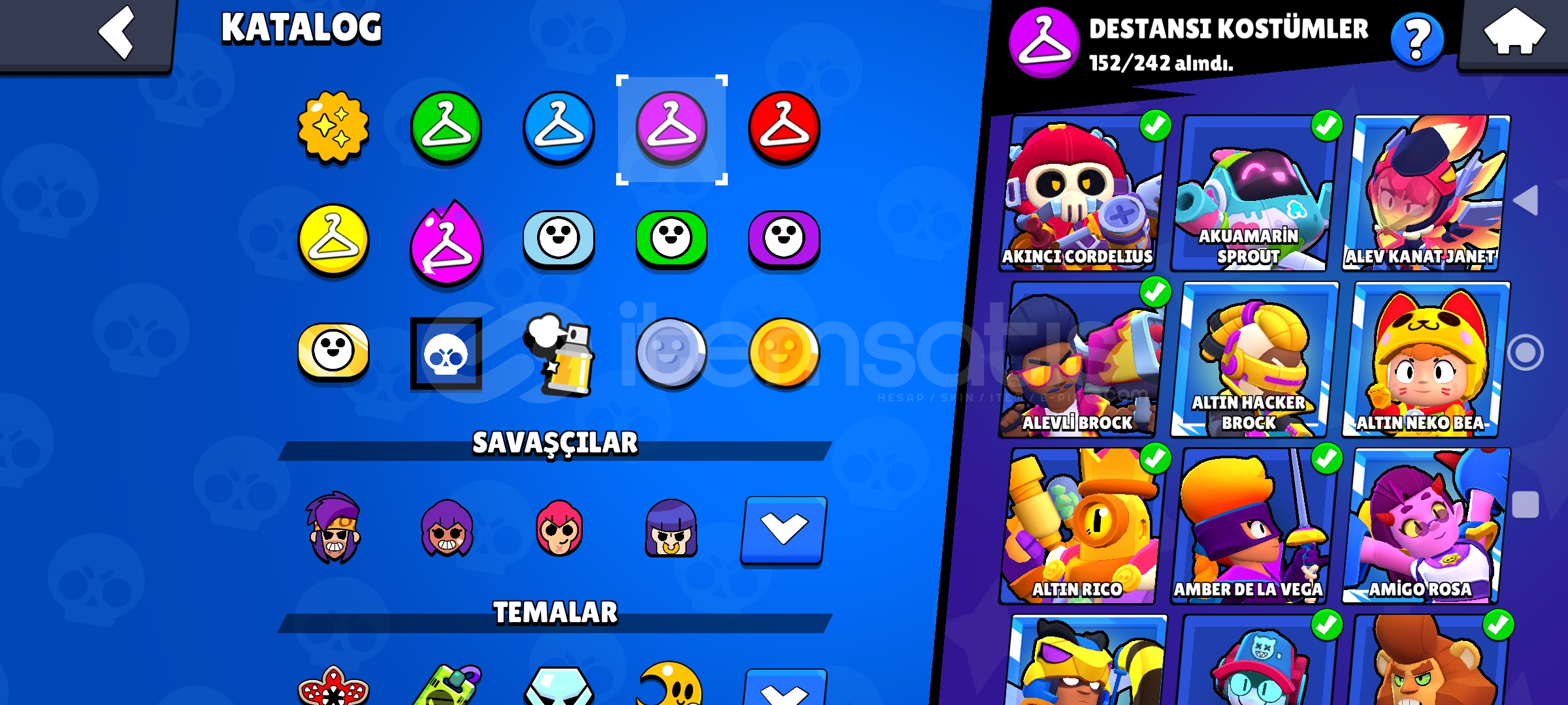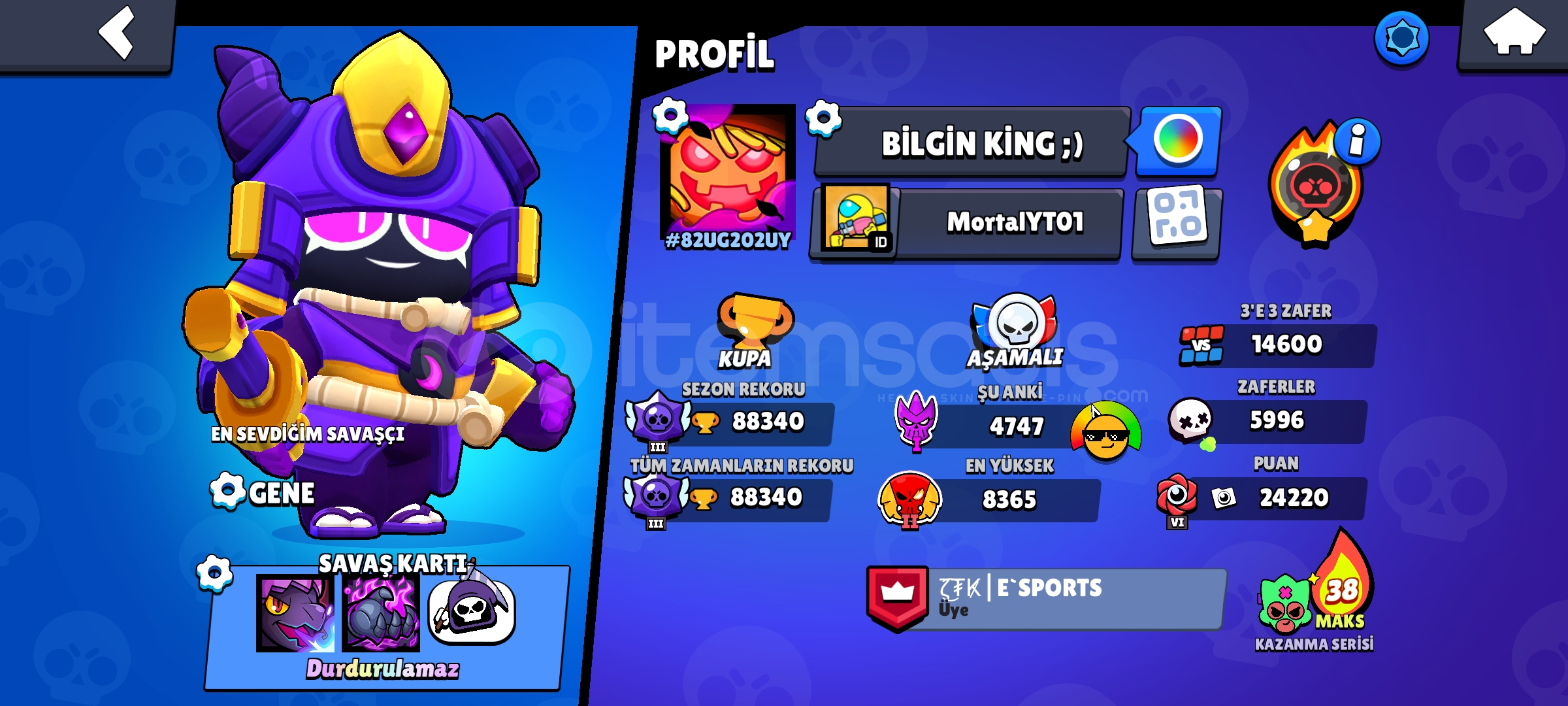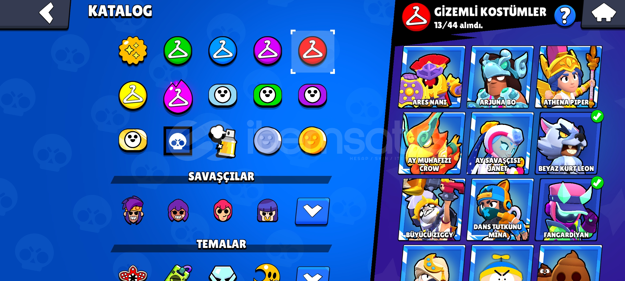 Hesapta 8 brawl pass alınmıştır2019 kuruluşlu Göktaşı Şöhertinde 96 karakter açıktık hepsi 11 level minimum 10 level61 Adet hiperşarz vardır Bütün karakterlerin yıldız gücü aksesuar ve eşyaları nerdeyse vardır👑89 Ender Kostüm119 Süper Ender Kostüm152 Destansı Kostüm13 Gizemli Kostüm12 Efsanevi Kostüm5 Hiperşarj KostümԀ...