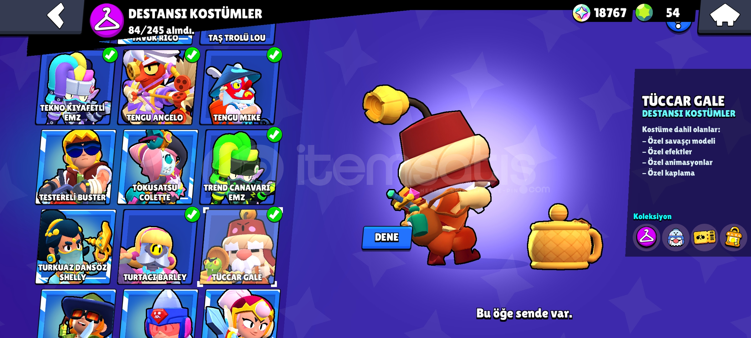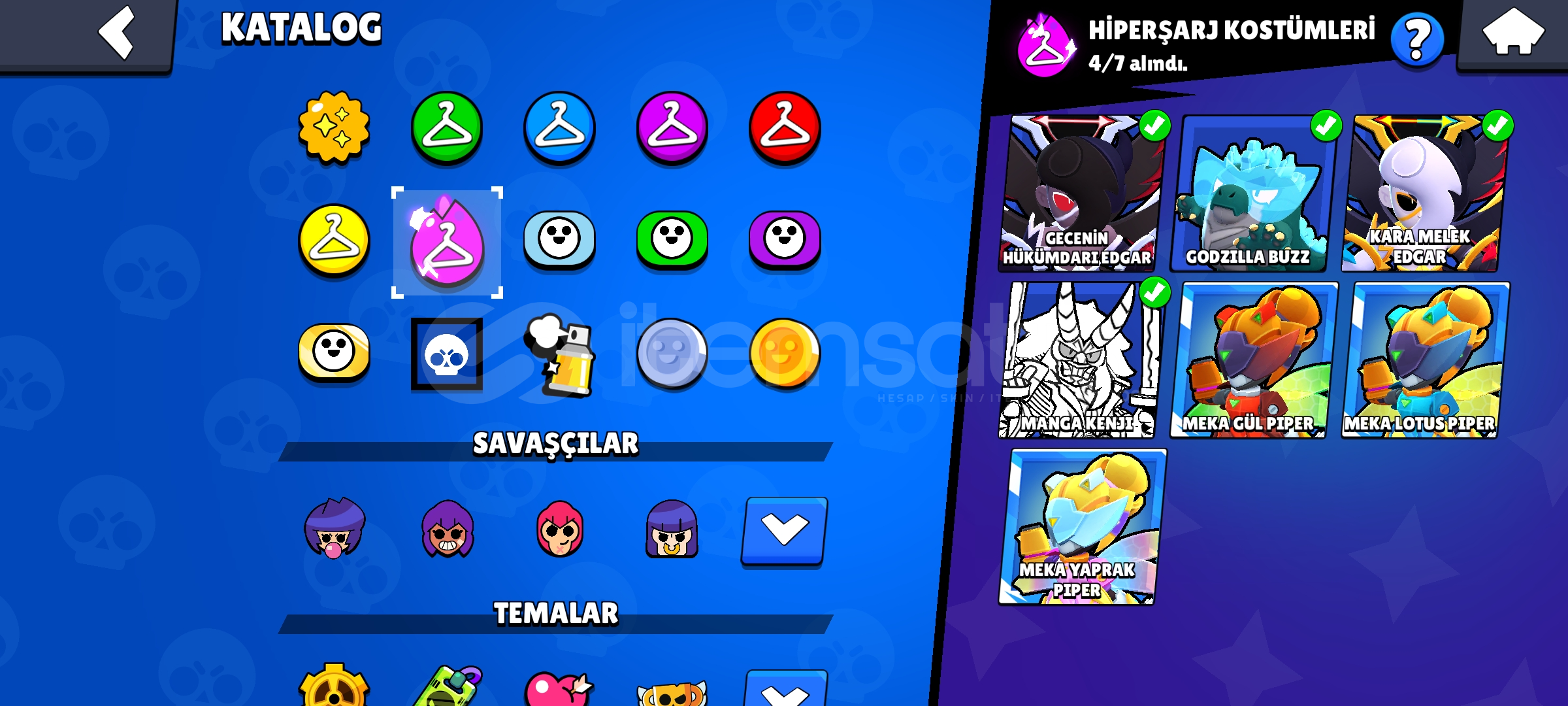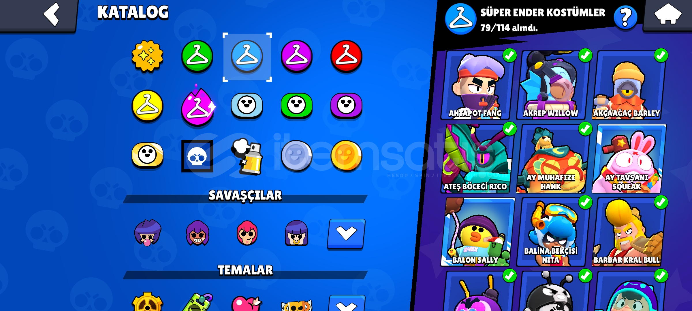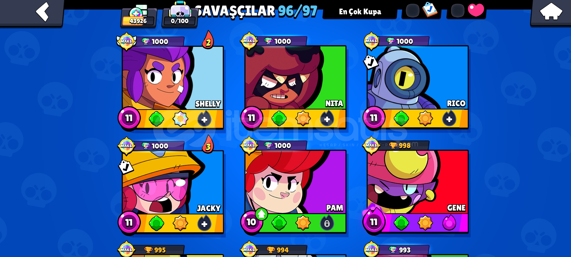 96 KARAKTER 43K+ KUPA 264 KOSTÜM5 Tane Nadir KostümSezon 1 Kostümü Tüccar GaleSezon 2 kostümü şövalye surgeSezon 3 kostümü Süper ranger brockTıknaz Darryl (oyuna birdaha gelmiyor)Antivirüs 8-bıt exclusive kostüm28 Hiperşarjlı, Toplam 36 Maksimum Seviye82 Ender Skin79 Süper Ender Skin84 Destansı Skin8 Gizemli Skin3 Efsanevi Skin4 Hiperşarz SkinHESAP YAKIN FİYAT OLAN HESAPLARDAN DAHA FAZLA...