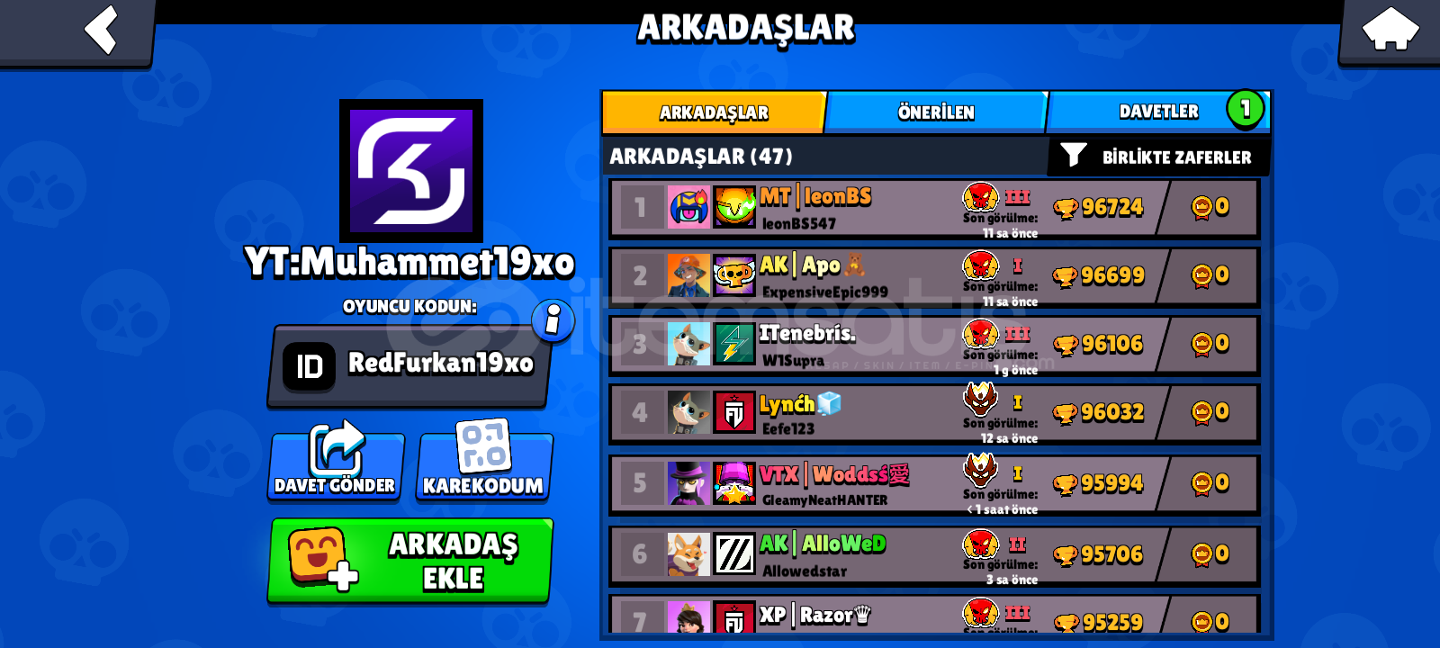 Güzel 6500kupası olan iyi hesap sağlam arkadaşlık listesi varE-posta değişir 2tane 1ksı var Janet PİNİ olduğu için çok nadir hesap250elmas dustin Nita kiju kenji ve daha fazlası vardırGarantilidir