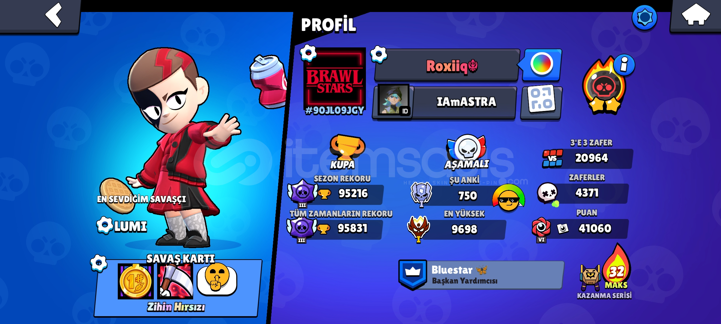 🔥 BRAWL STARS HESAP SATILIK – 95K+ REKOR • 40.000+ MÜCEVHER • ELİT HESAP 🔥🌟 Sezon Rekoru: 95.216🌟 Tüm Zamanların Rekoru: 95.831🌟 Mevcut Aşama: 750🌟 En Yüksek Aşama: 9698🌟 3v3 Zafer: 20.964🌟 Toplam Zafer: 4371🌟 Puan: 41.060🌟 Kazanç Serisi: MAX 32💎 Mücevher: 40.000+ (Çok nadir – büyük avantaj!)---🔥 ÖNE ÇIKANLAR💎 40K+ mücevher ile istediğin savaşçıyı, skinleri ve gelişimleri anında alabilirsin!🏆 Yüksek kupalı, elit seviyede işlenmiş hesap💥 En Sevilen Savaşçı: LUMI (skin + savaş kartı + Zihin Hırsızı aktif)🛡️ Kalıcı rozetler, gelişmiş profil simgeleri🟦 Bluestar kulübünde Başkan Yardımcısı⭐ Temiz, güvenli, sorunsuz hesap – ban riski yok🎨 Özel profil renk paleti & QR sistem aktif---💰 Fiyat: Uygun – Pazarlık Payı Var🔒 Güvenli teslimat sağlanır.💬 Detay, video veya ek SS isteyen yazabilir ve ayrıca Ünlü youtuber CODE:SRN ARKADAŞ EKLİDİR. Hesabın telefon koruması vardır hesabı aldığınız zaman sizin telefon numaranız yapılıcak ss ve video ile olucaktır.