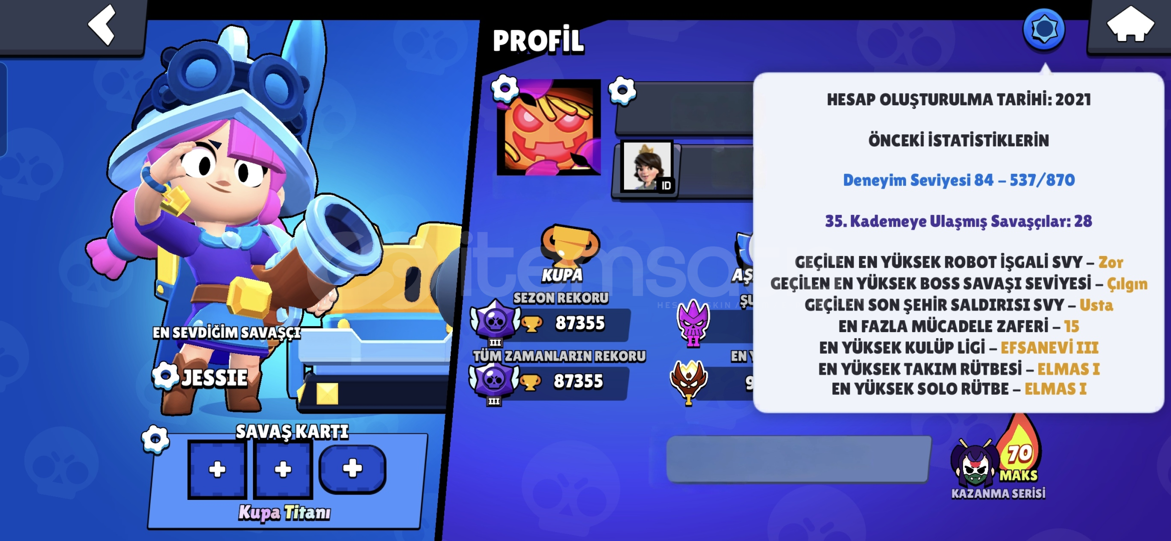 Eski sistem 28 tane 35 rank vardır kupa titanı güneş 2 yarısındadır 5x yeni master atılmıştır. hesapta 73 max hiperli karakter vardır 4 tane hipersiz max karakter vardır kalan 21 tane karakter ise çoğu ortalama seviyededir. Hesaba telefon koruması bağlı değildir aldığınız an ilettiğiniz maile bağlanıp teslim edilir merak ettiğiniz başka
