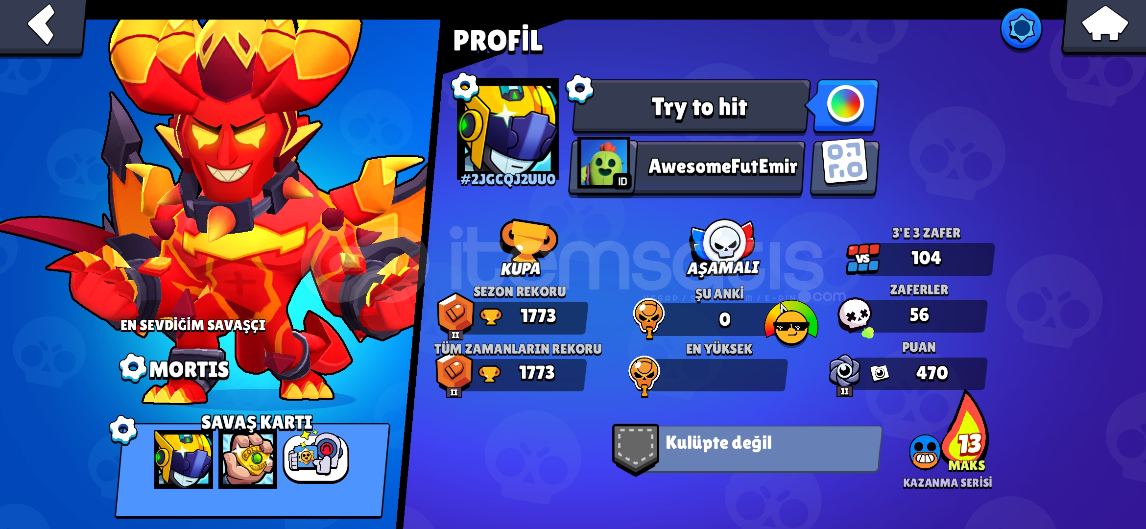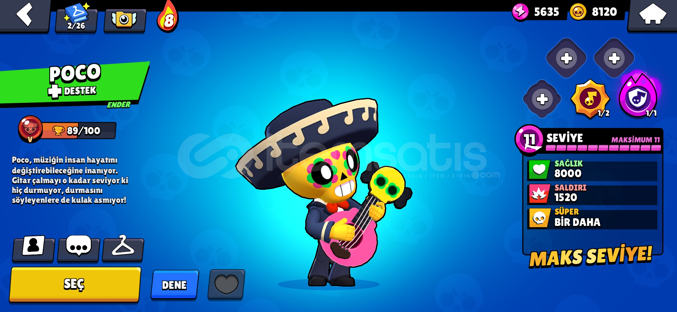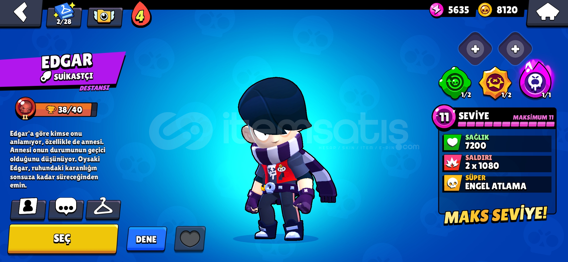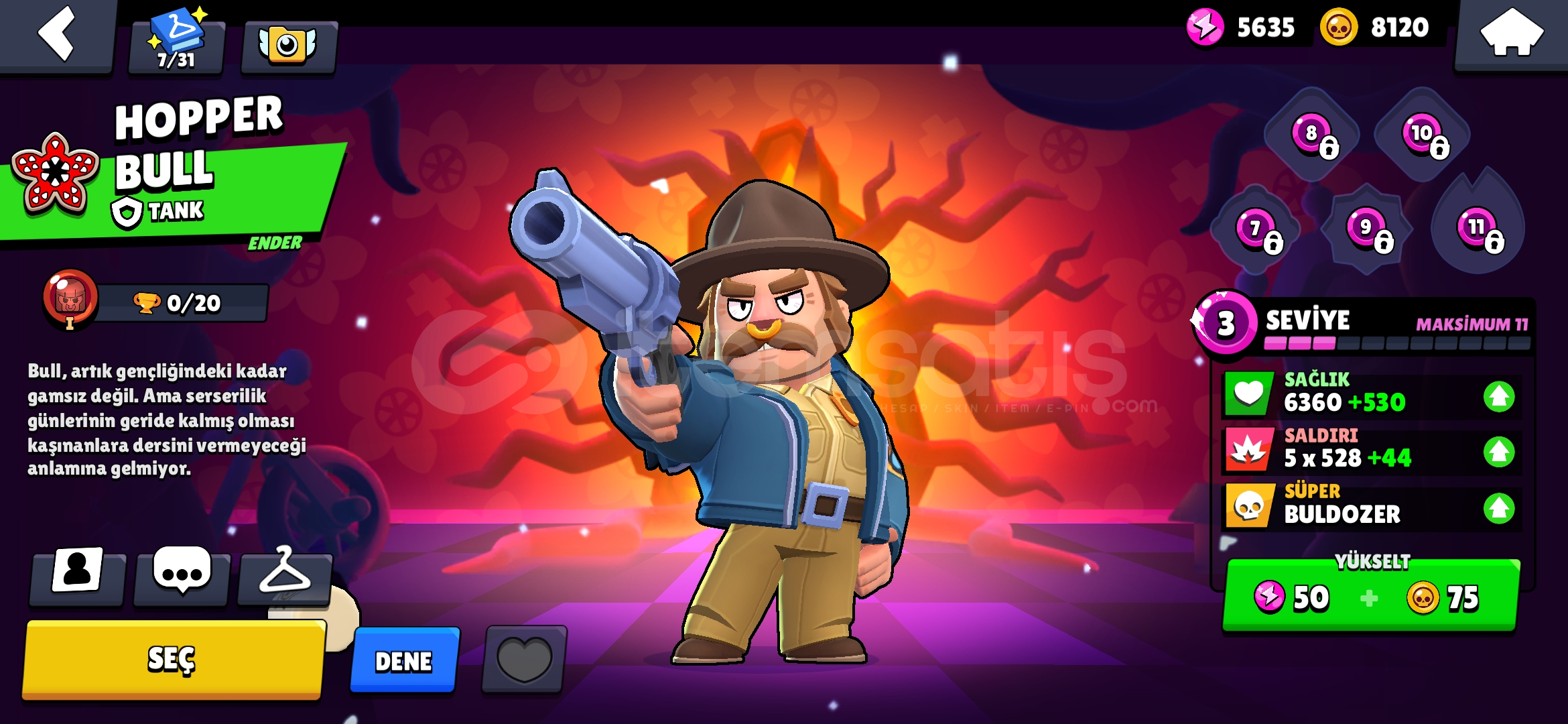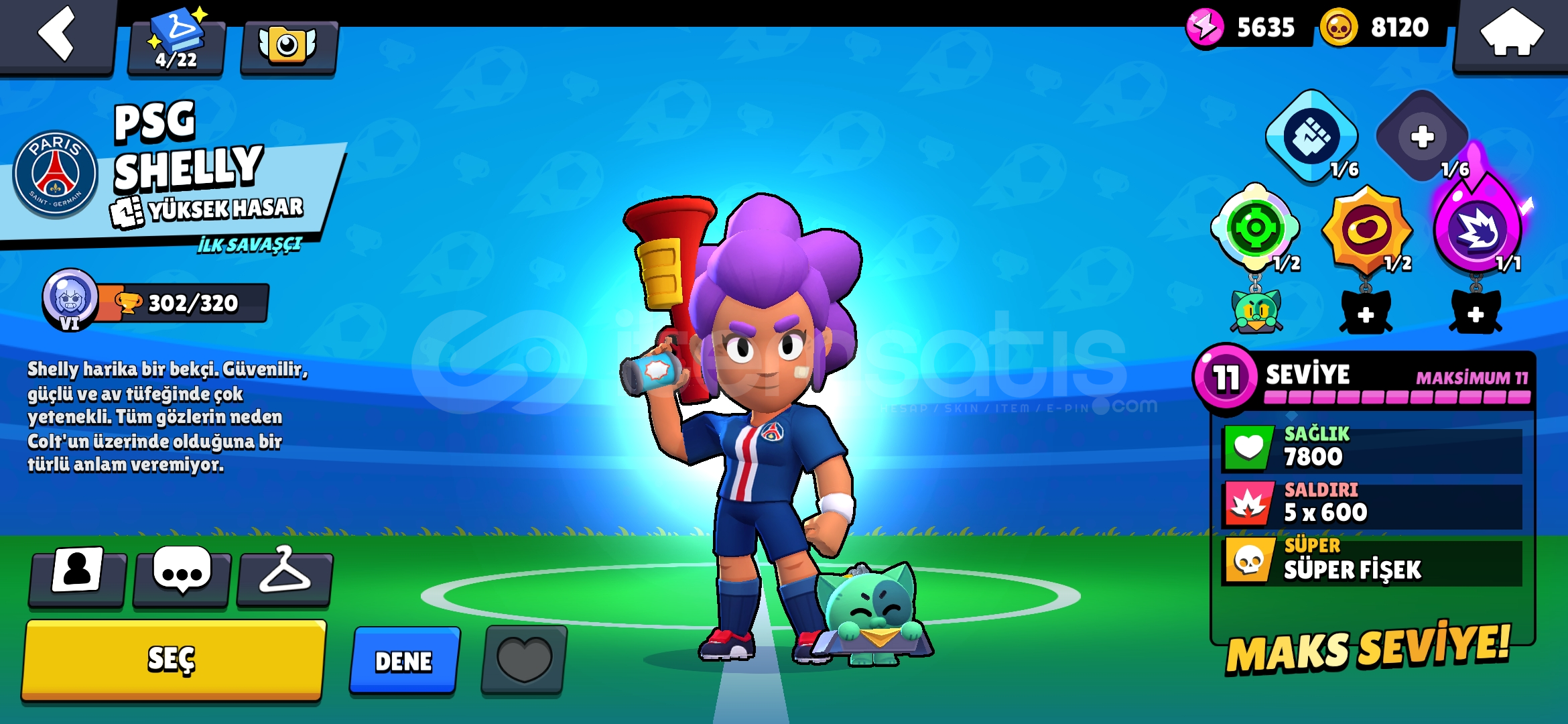 Özel Kostümler:Şeytan Mortis, Hopper Bull, MEKA LOTUS PİPERKarakter Sayısı: 25Altın: 8120Güç Puanı: 5635Mücevher: 8826Kaynak Anahtarı: 1Elmas: 31Kupa: 177311. Seviye Karakterler: Poco, Shelly, EdgarHesap Direkt Olarak Verilir E-Posta Değişimi Yapılır