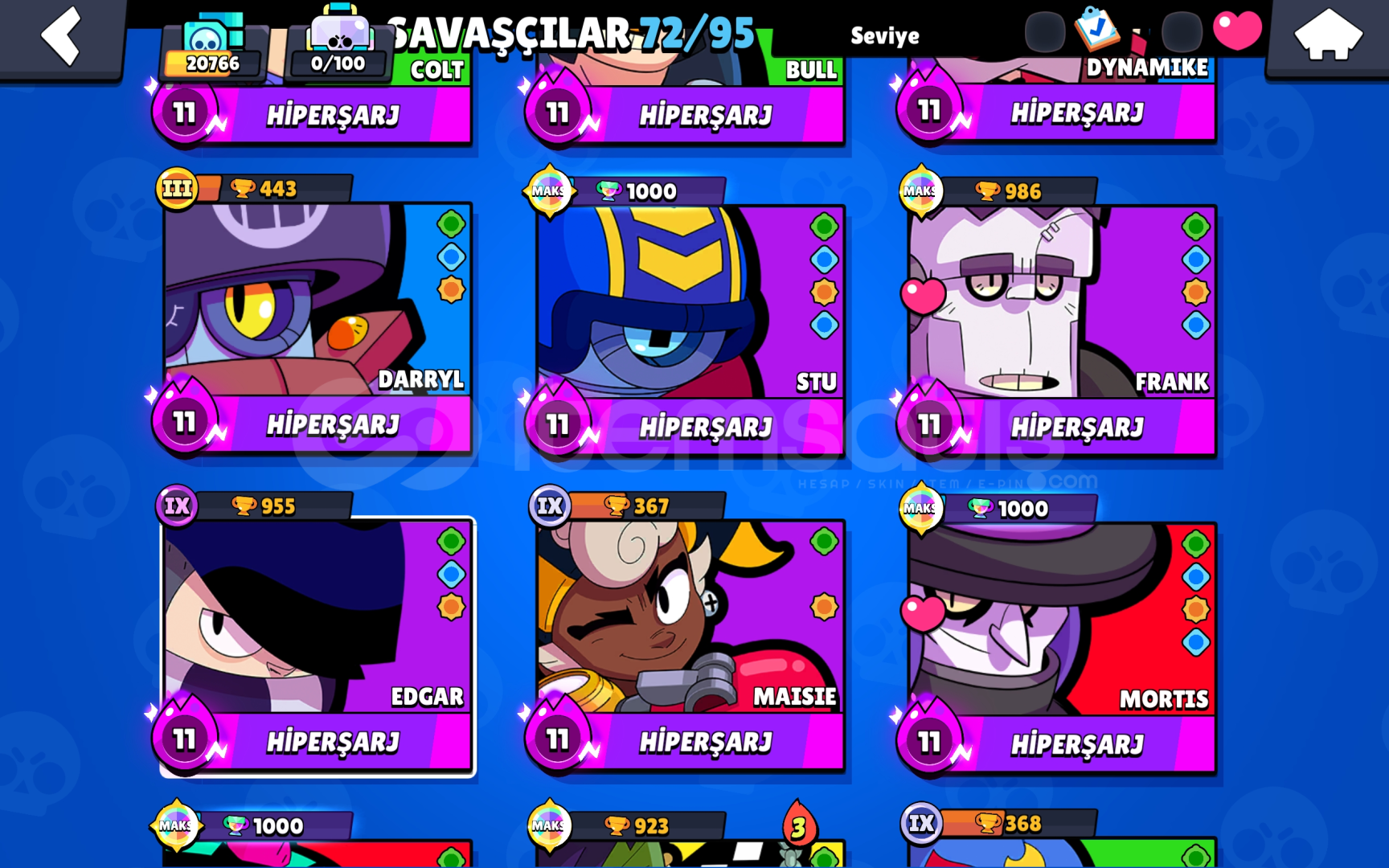 Hesap şuan 21.500 kupadır güncel bilgiler burdadır73 karakter 12 hiper2 hiper kostümü mortis 7 efsanevi 3 meka colt 3 meka mortis 1 surge4 gizemlı frank Mike 50 destansı 44 superender44 ender