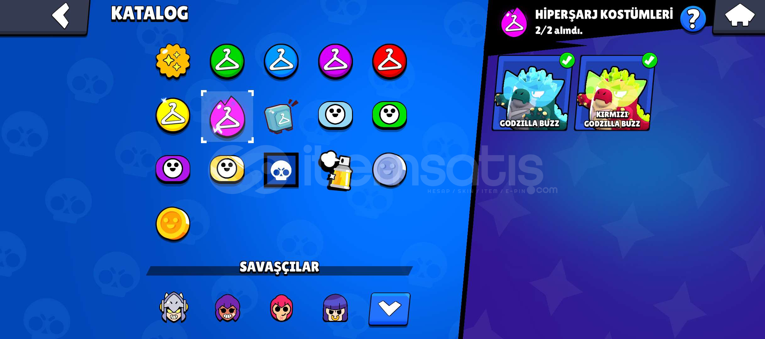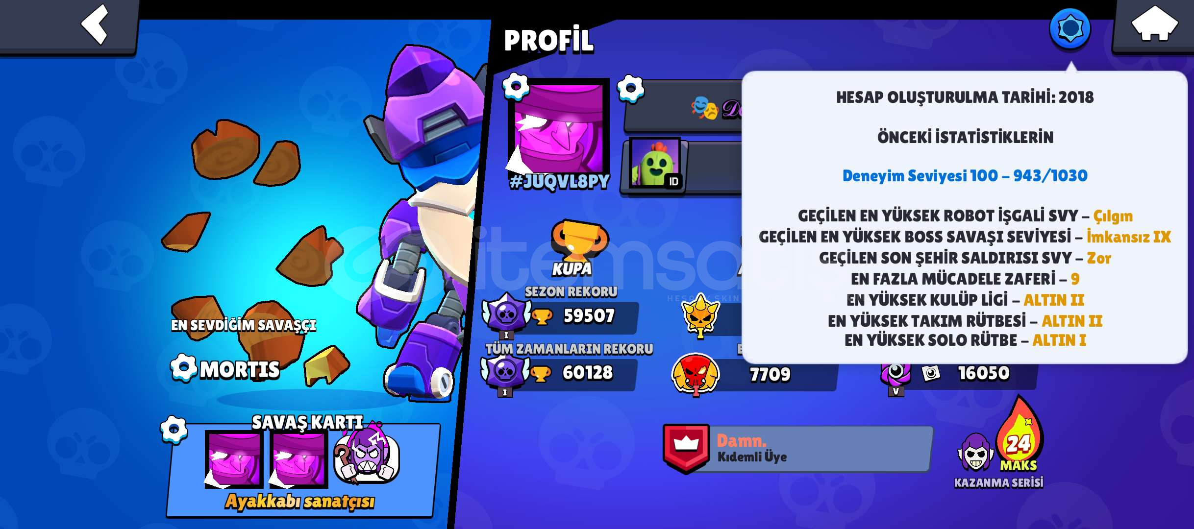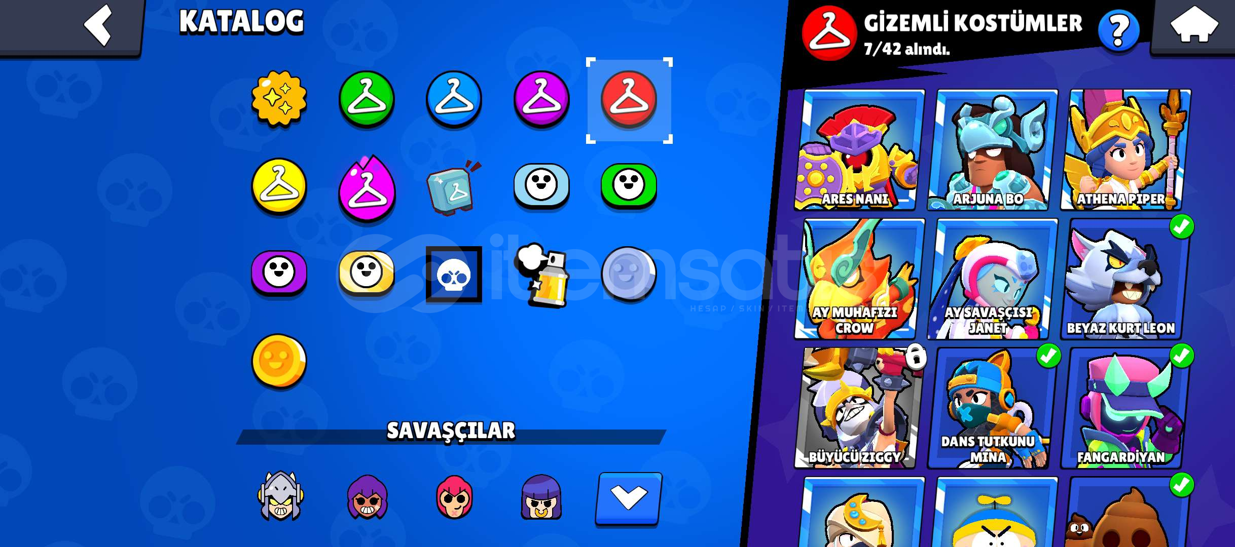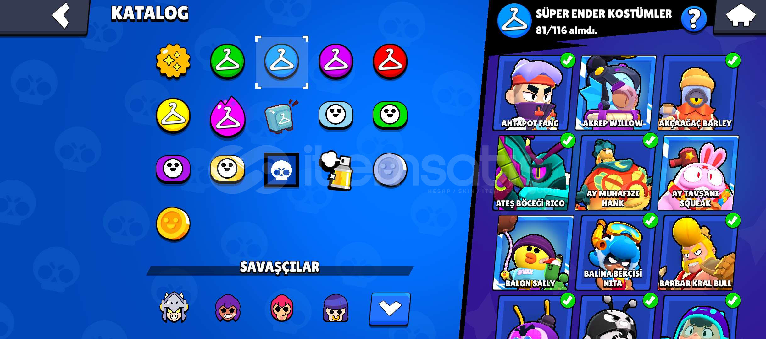 Merhabalar! herkesin hayal ettiği o hesap bu hesap TEMİZ EMAİLLİ HESAP 59K kupası vardır 2018 de oluşturulmuştur 94 karakteri vardır tek minası yoktur 79 ENDER kostümü vardır. 81 SÜPER ENDER kostümü vardır. 90 DESTANSI kostümü vardır. 7 GİZEMLİ kostümü vardır. 7 EFSANEVİ kostümü vardır. ve son olarak 2 HİPERSARJ kostümü vardır. değerli kostüm olarak yıldız shelly, fanatik fang, korsan colt, kaptan carl, ele geçirilmiş dynamıke, başsız stu, godzılla buzz, sokak modası shade vb. 3 tane brawl pass + acılmıştır bunlar brock sezonu, hebi kenji sezonu ve iskelet surge sezonudur. bunların dışında squıdward mortıs sezonu acılmıştır. dynamıke pro passi acıktır. 30 karakterin hipersarjı acıktır. 2024 ve 2025 aşamalıda efsanevi olunmuştur. ismini değişmek icin 92 elmas vardır. isteyene daha cok bilgi verebilirim ve pazarlık vardır. şimdiden alıcısına hayırlı uğurlu olsun.