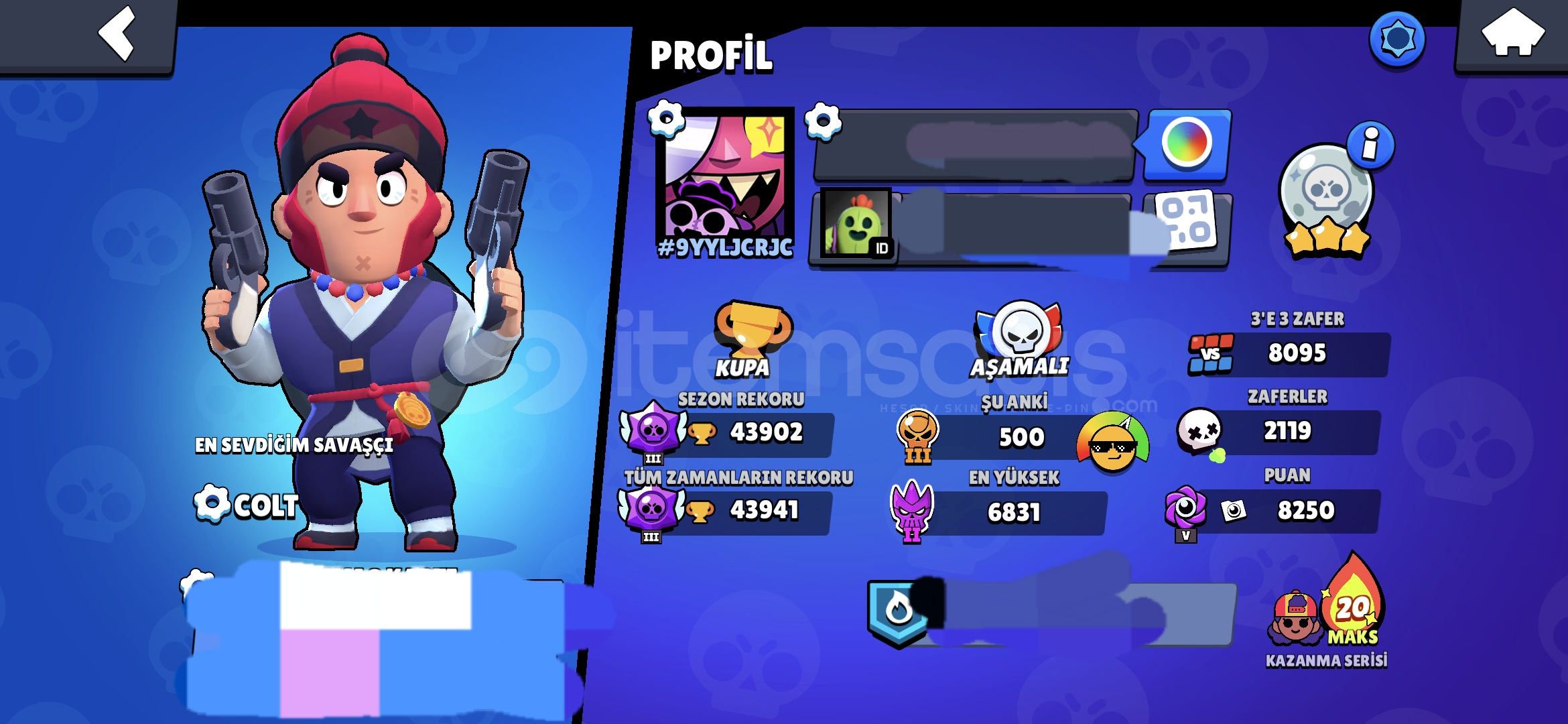 43k kupalıdır86 karakterlidir300 köstüm vardır ( 2 hiperşarj, 10 efsanevi, 7 gizemli, 126 destansı, 86 süper ender, 80 ender adetinde köstümler vardır )Çoğu karakter Max ve hiperşarjlı16 defa brawl pass plurss fullendiYaklaşık 35 tane şuanda alınması imkansız olan eski ve aşırı nadir skinler var.Dolu dolu pinler ve profiller vardır.Ay şöhreti 3Hem mail hem #...