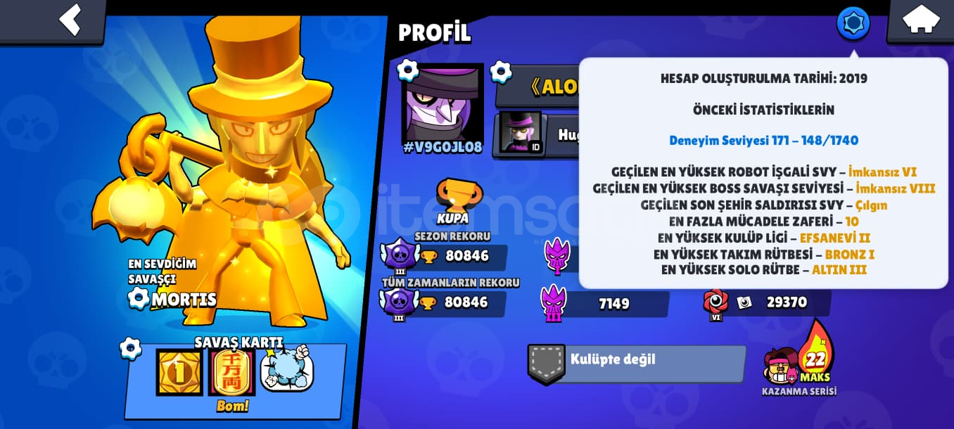 Hesabım 2019 yılından beri açıktır.En nadir kostümleri bu hesapta bulabilirsiniz görselde olduğu gibi.80K kupası vardır.+300 KostümSatürn Şöhreti 3'e sahiptir+12 Adet ünvan(2 SAF GÜMÜŞ MORTİS, 2 SAF ALTIN MORTİS VE DOUG MEVCUTTUR)Hesap hakkında daha fazla detay için insta: utku.bgll_