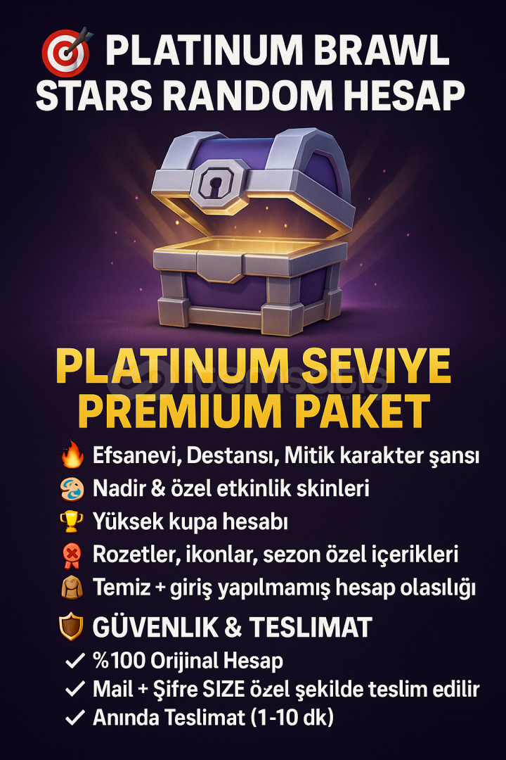🎯 Platinum Brawl Stars Random Hesap – ELİT SERİ💎 Platinum Seviye Premium Paket En değerli karakterlerin, özel skinlerin ve nadir içeriklerin çıkma ihtimalinin en yüksek olduğu üst sınıf random hesap paketi!🎁 Kasa Açma Deneyimi Gibi! Bu paket; sürpriz kutu açma hissiyatını tam olarak yaşatmak için özel olarak hazırlanmıştır. Her hesap bir ...